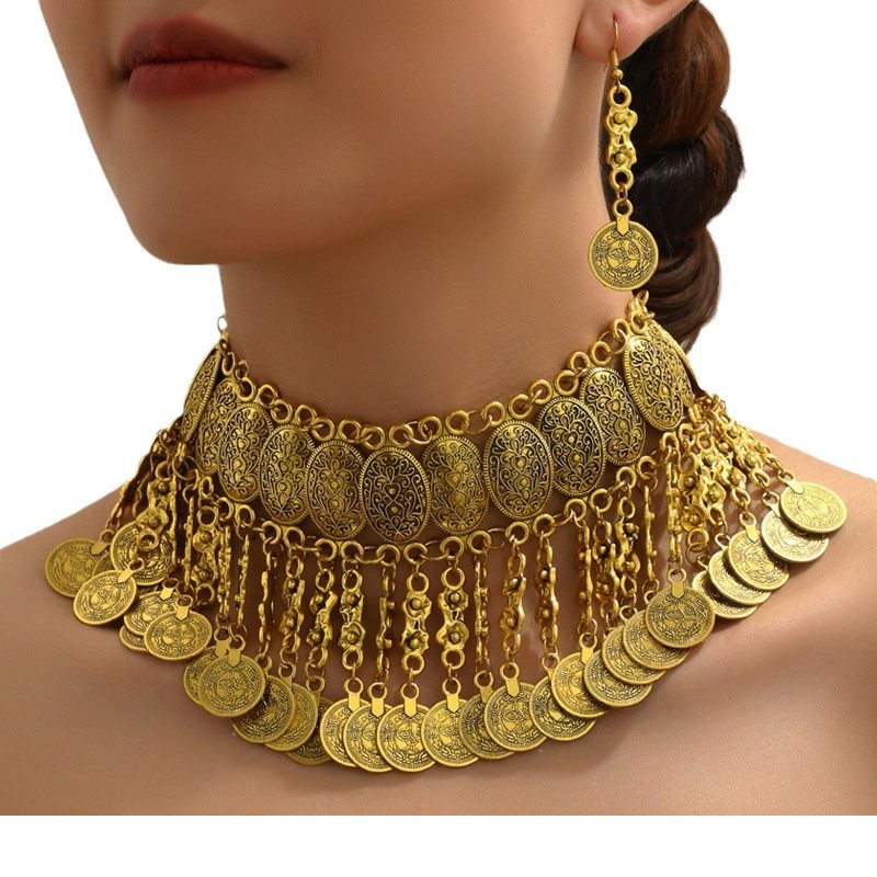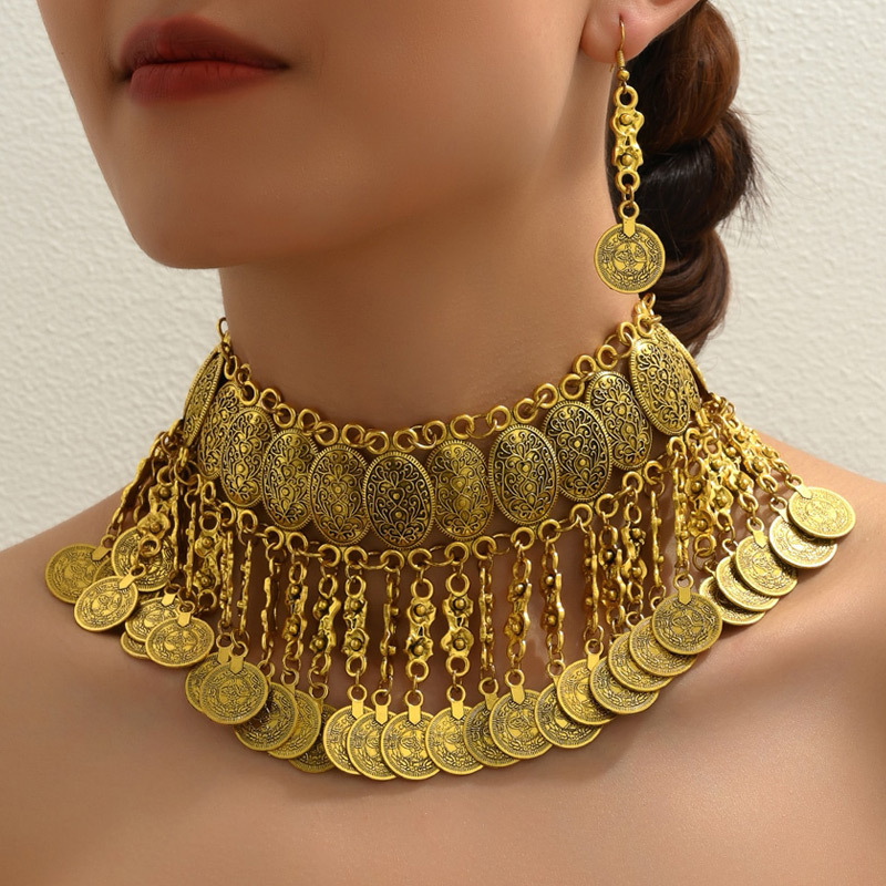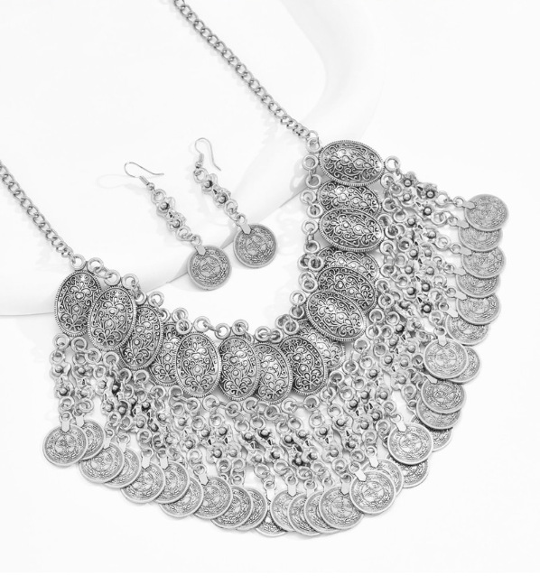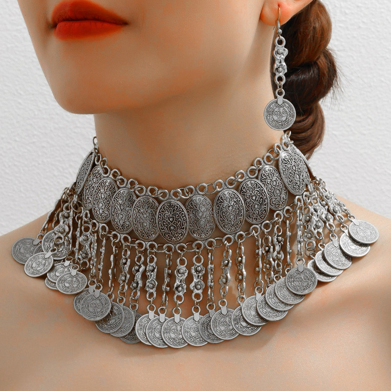 Cross-border Wholesale Fashion Retro Medium Dongfeng Coin Coin Coin Dropping Spike Exaggerated Temperament Necklace Earrings Women Jewelry suit