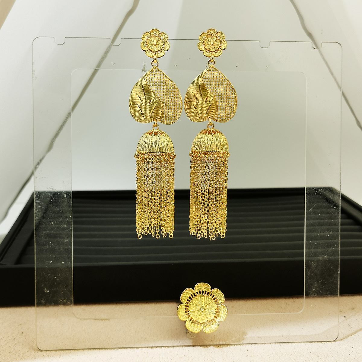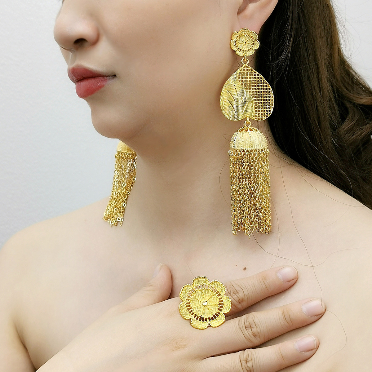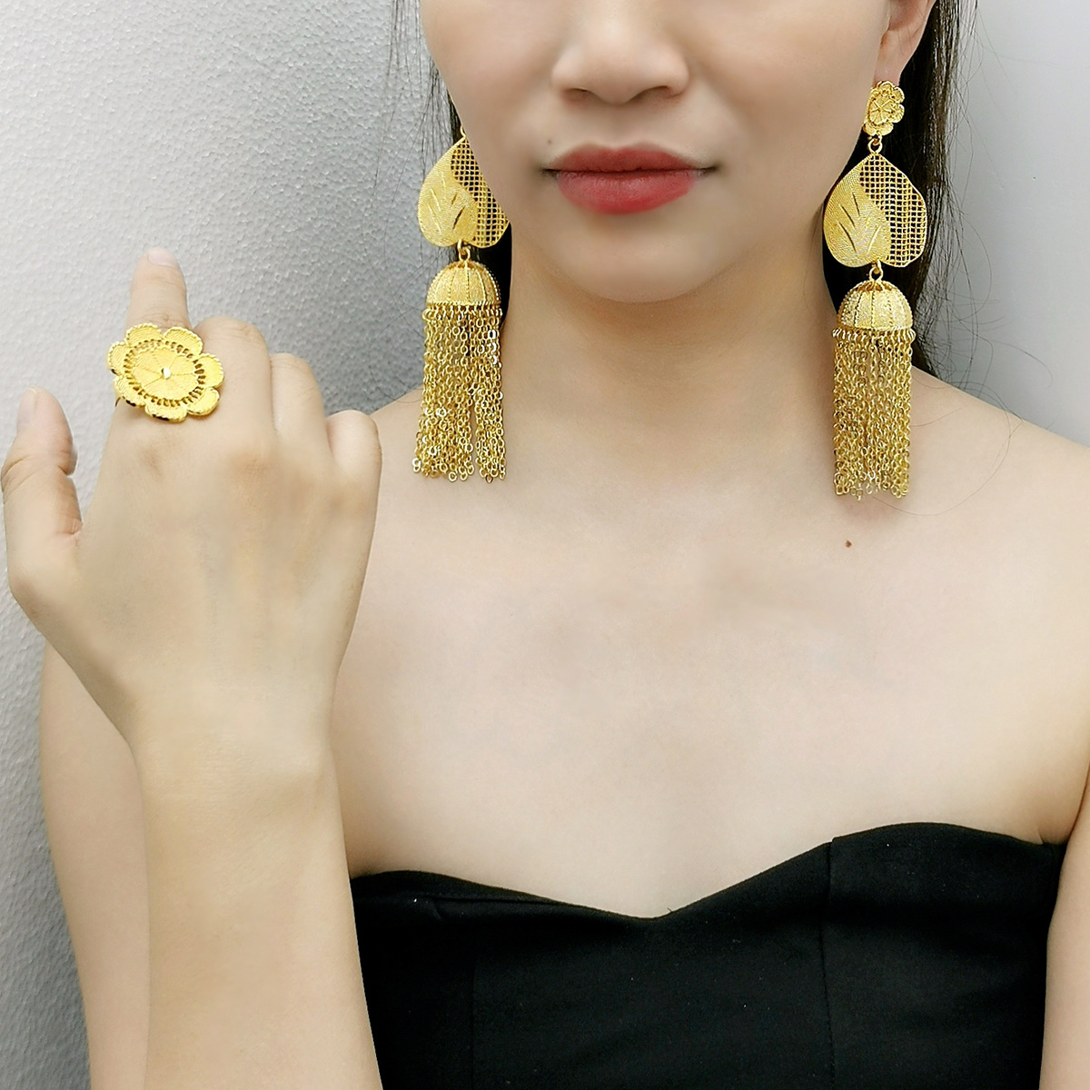 Middle East Bride Gold Plated Long Earrings Ring suit Wedding Jewelry Pendant Earrings Wholesale Dubai Plated 24K Ears