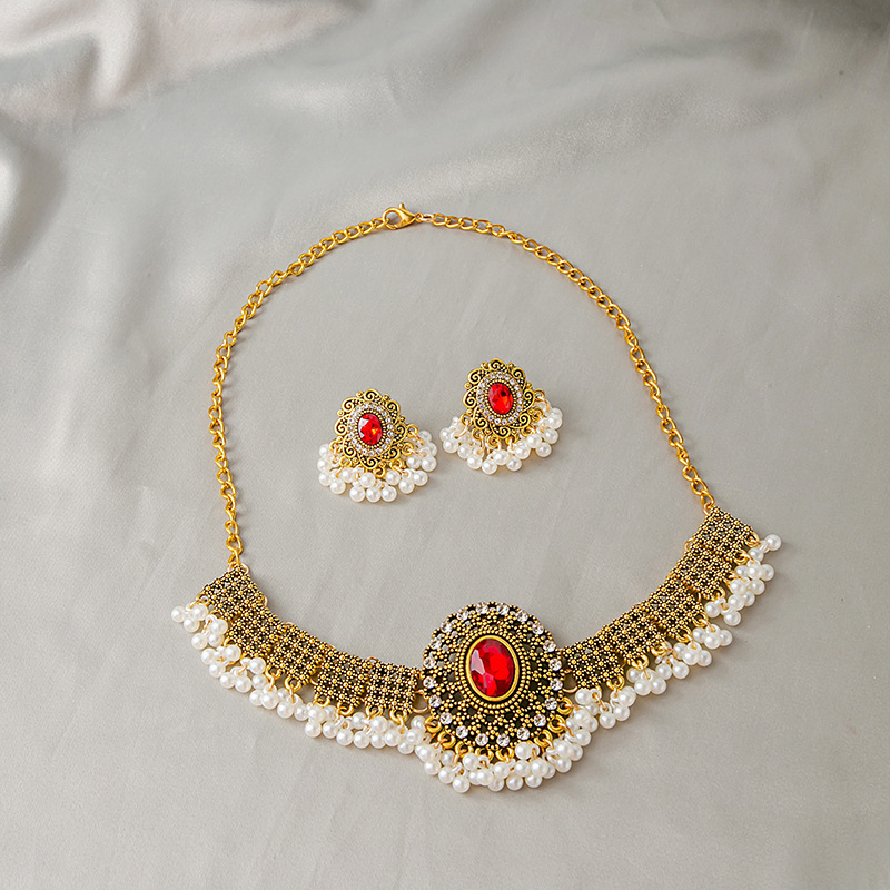 跨境欧美货源满镶珍珠亮片靓闪复古项链套装耳环个性拼色耳环链子女饰品批发货源
