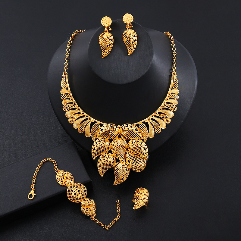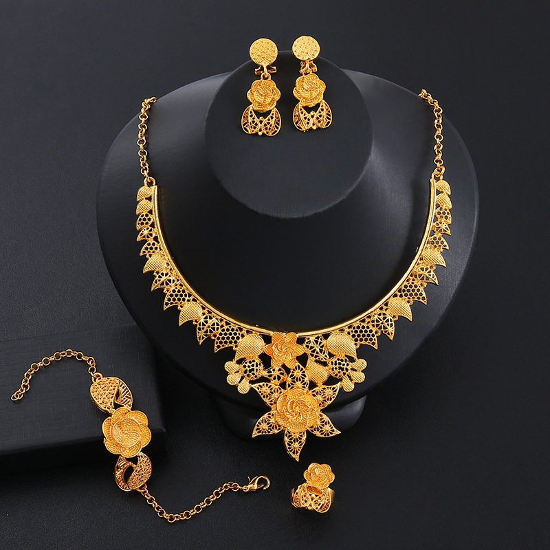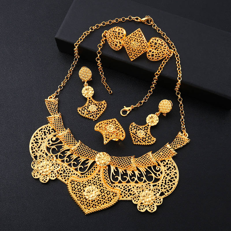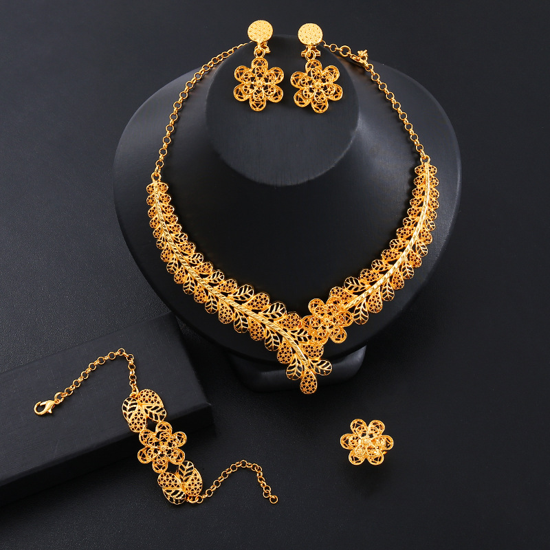 Cross-border Middle East Plated 24K Gold Flower Hollow Necklace Earrings Ring suit Dubai European and American Bride Wedding Jewelry
