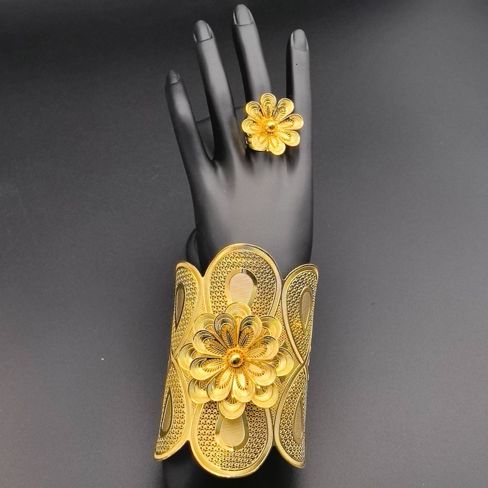 Dubai 24K Gold-Plated Bride's New Large Bracelet and Ring Set Middle Eastern Wedding Festival Women's Jewelry Light Luxury Style