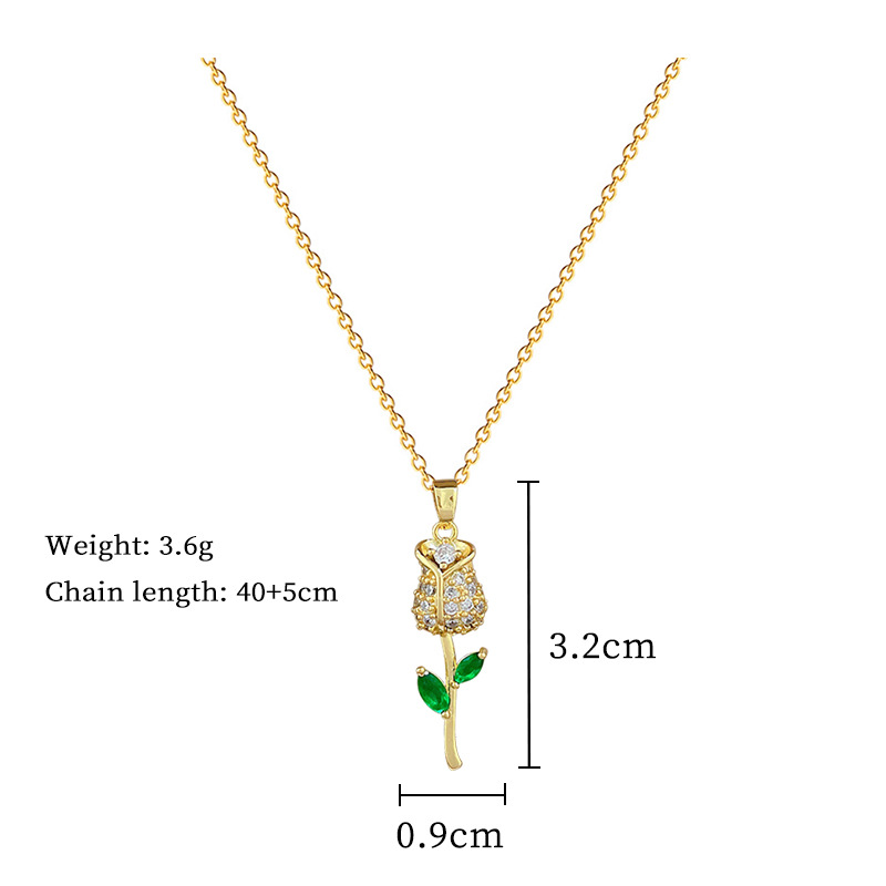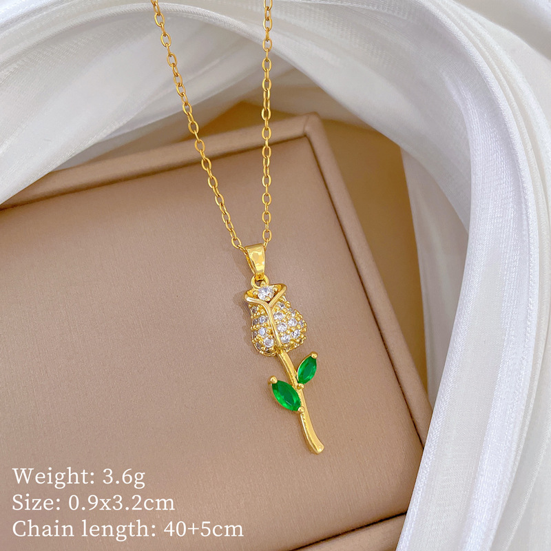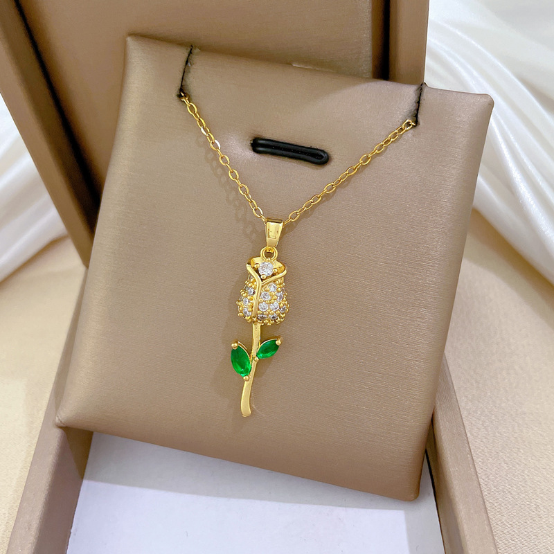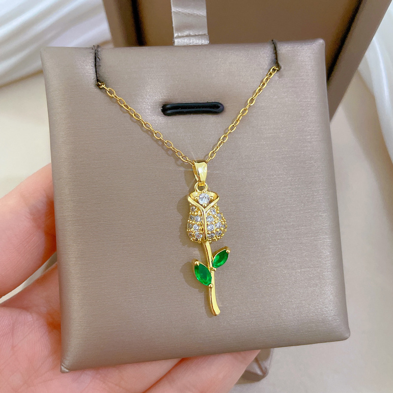 [Titanium Steel] Green Leaf Rose Full Diamond Light Luxury Temperament Gorgeous Full Diamond Necklace Women's All-match Clavicle Chain Titanium Steel