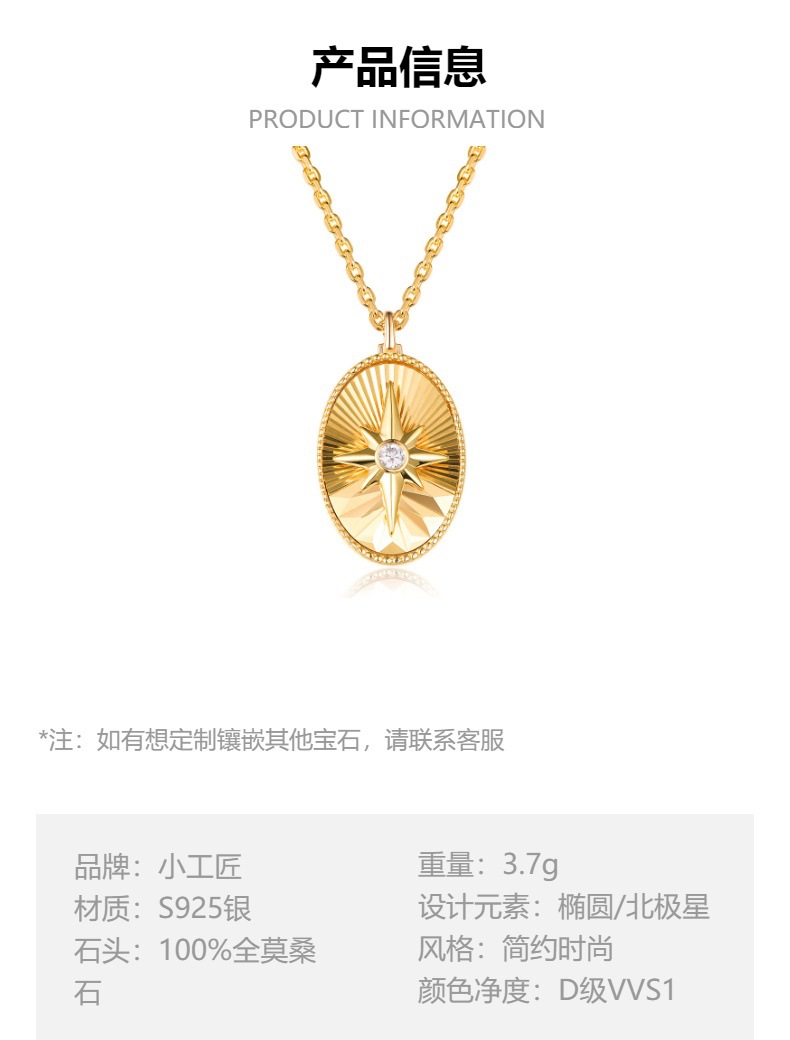 我们的莫桑石北极星项链是通过精细的铸造、雕刻、镶嵌和表面处理工艺,将璀璨的莫桑石与优雅的纯银材质完美结合,展现现代时尚感的精美饰品。