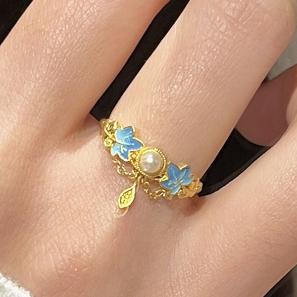 Little red book explosions point Cui blue pearl tassel ring female middle ancient enamel exquisite ginkgo leaf ring a generation of hair