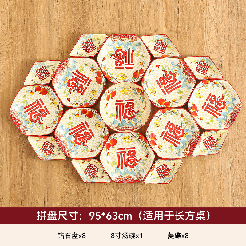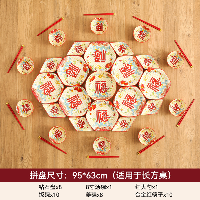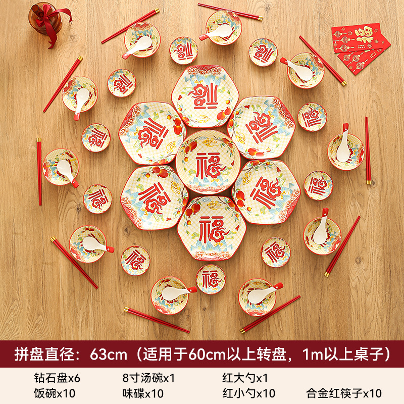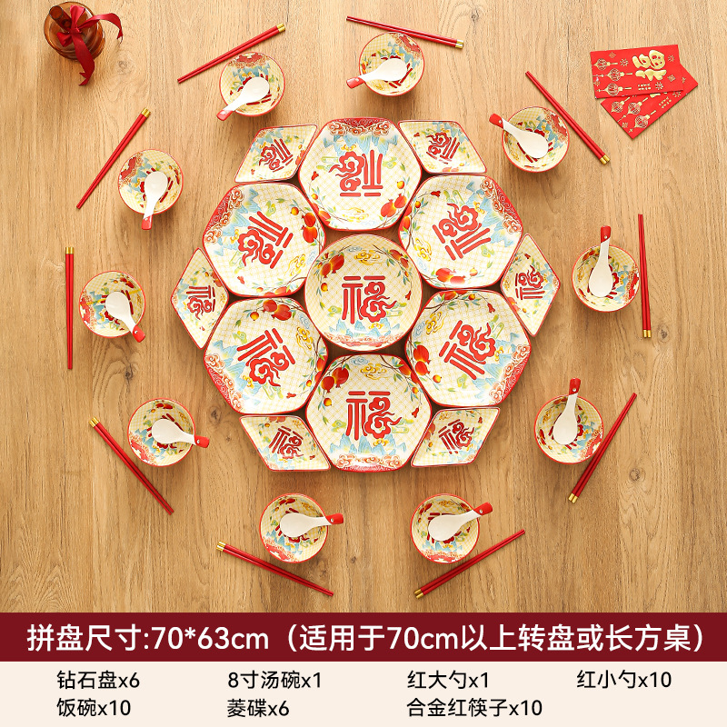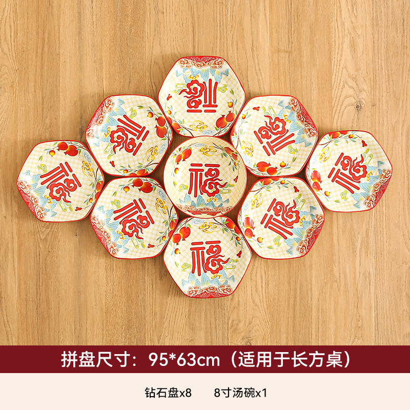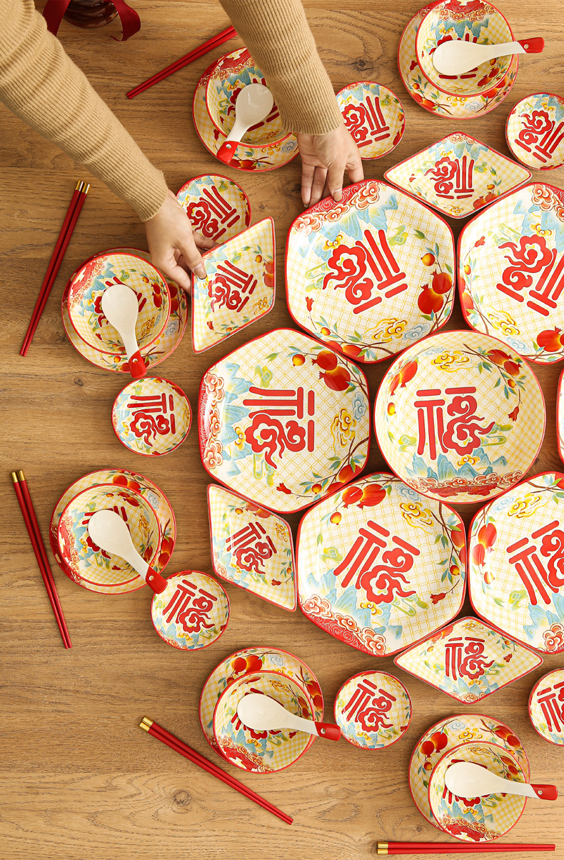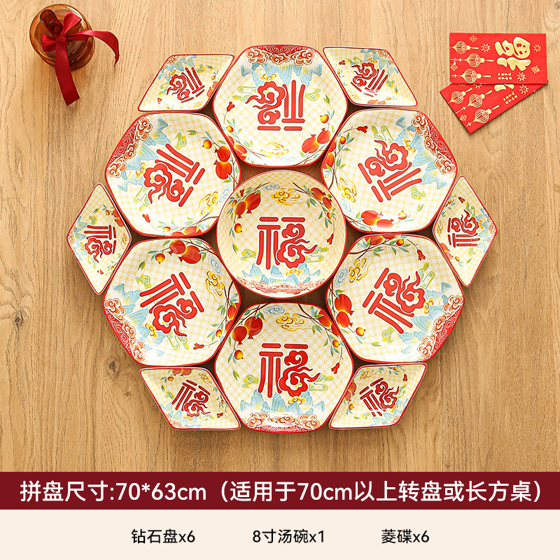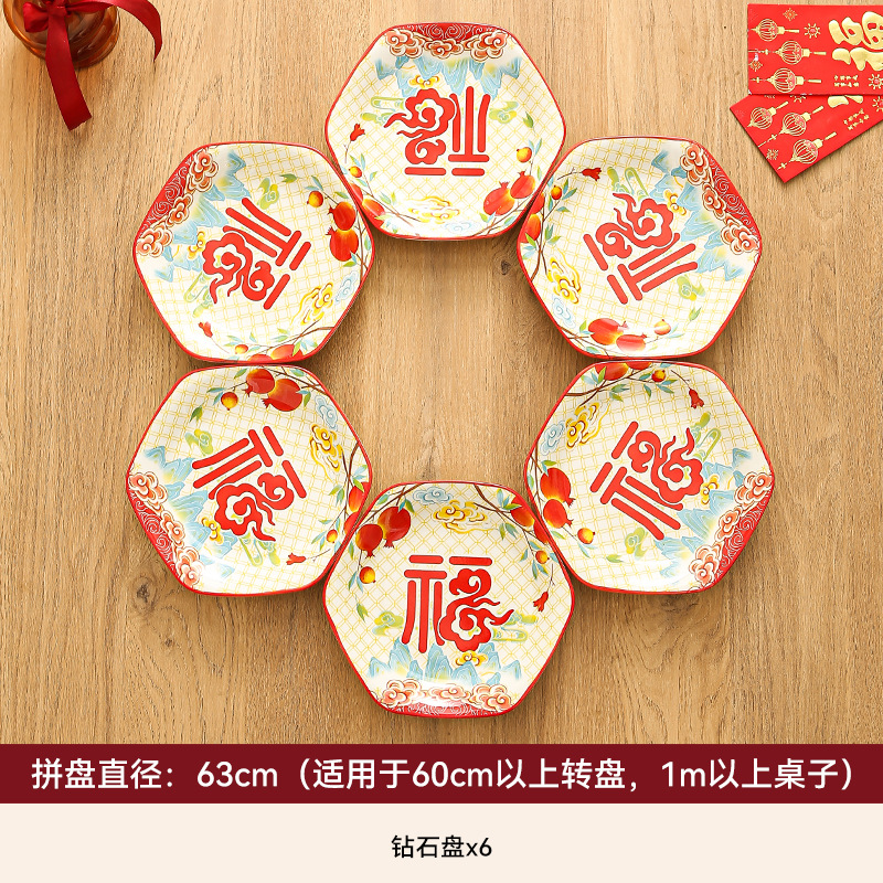 New Chinese New Year Dish Plate Household Hexagon Diamond Plate Internet Celebril Ceramic Reunion Platter Tableware Combination Dishes suit