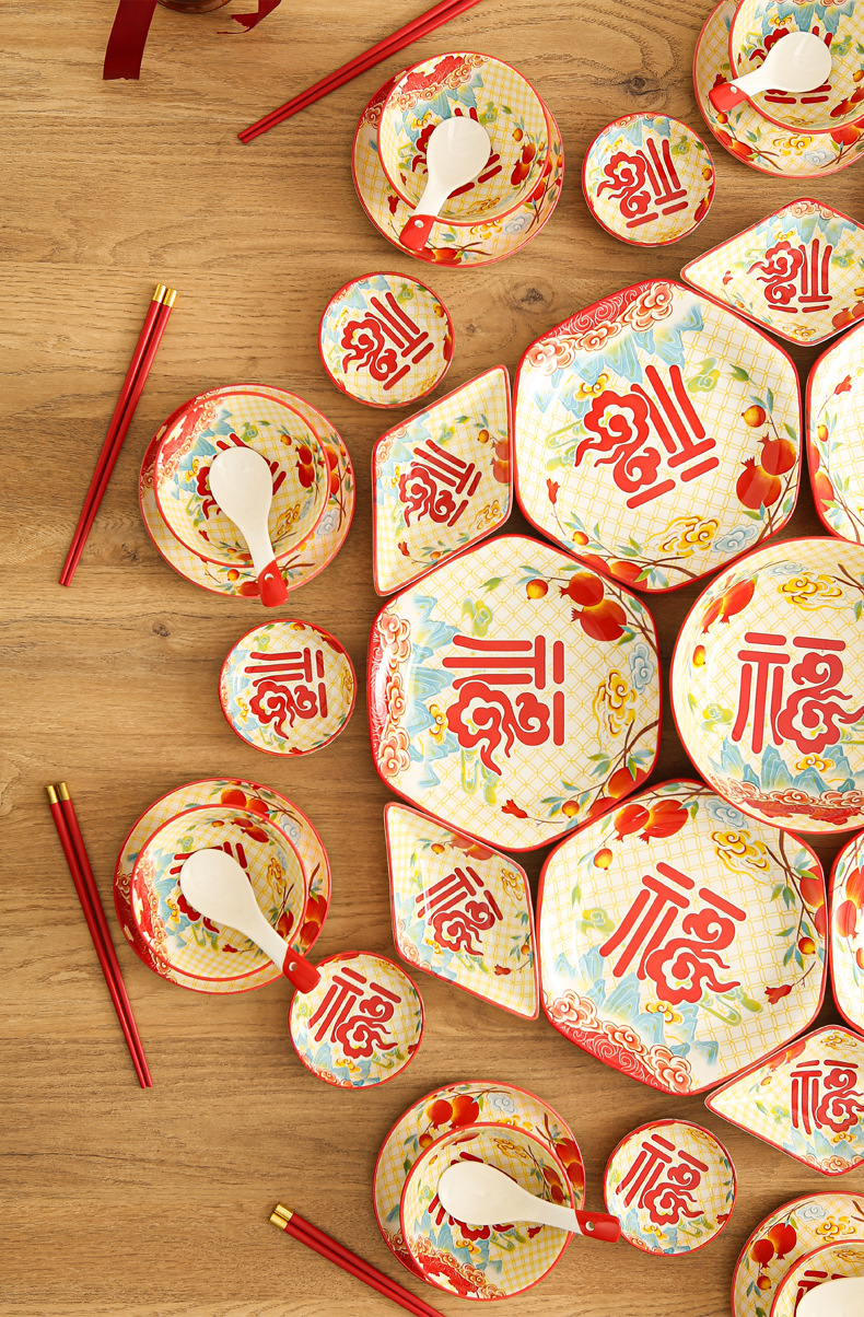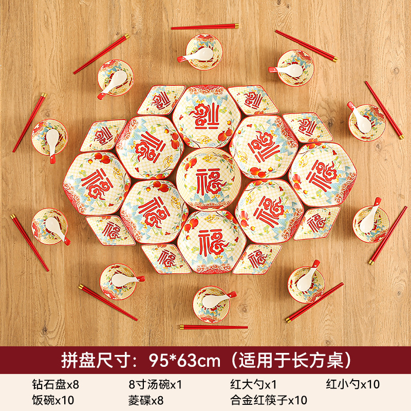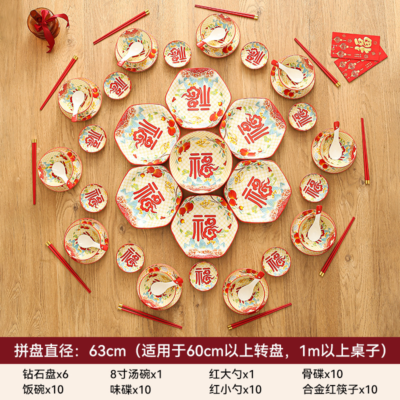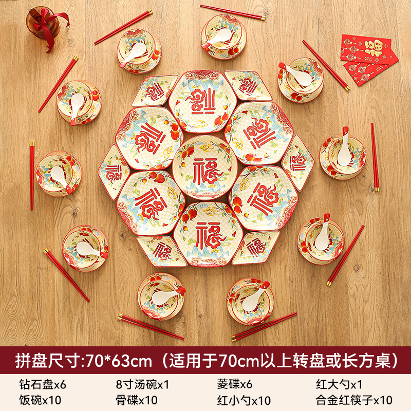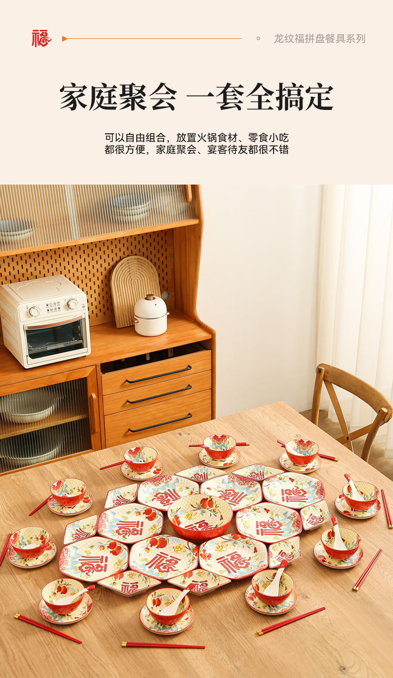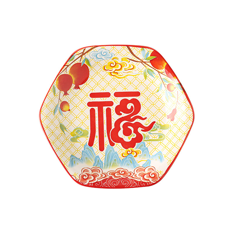 New Chinese New Year Dish Plate Household Hexagon Diamond Plate Internet Celebril Ceramic Reunion Platter Tableware Combination Dishes suit