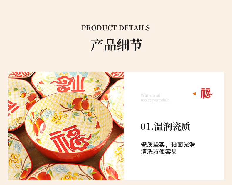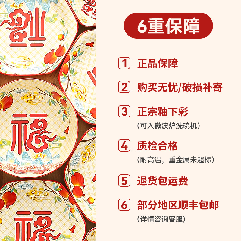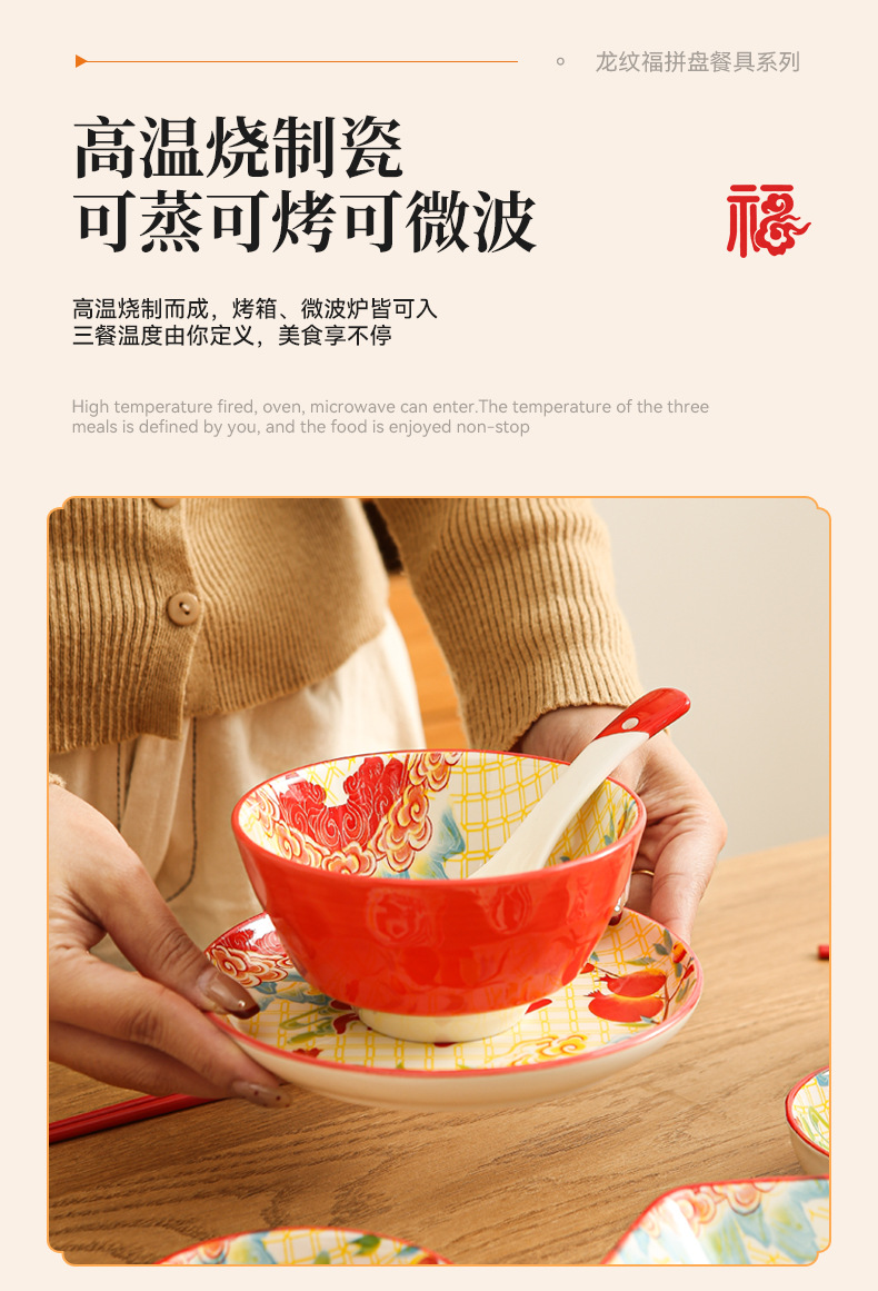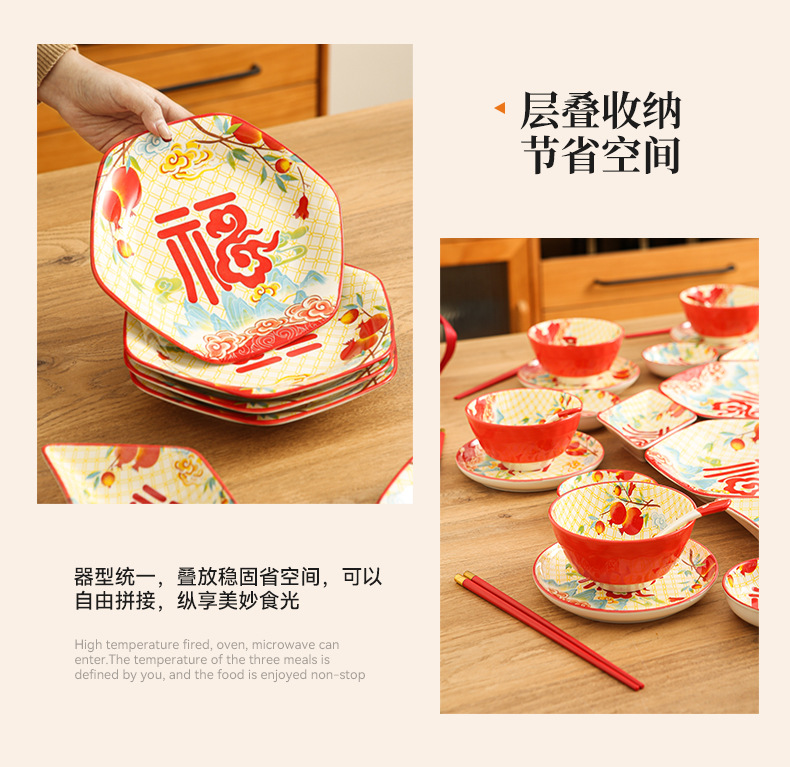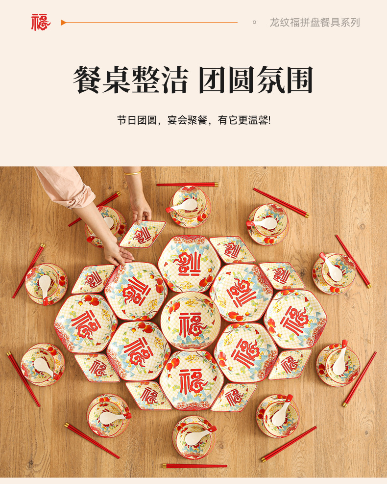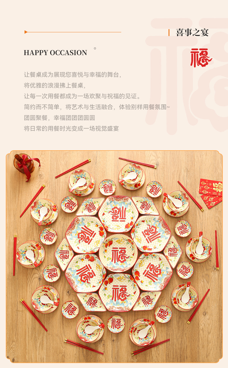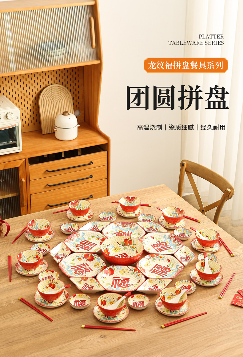 New Chinese New Year Dish Plate Household Hexagon Diamond Plate Internet Celebril Ceramic Reunion Platter Tableware Combination Dishes suit