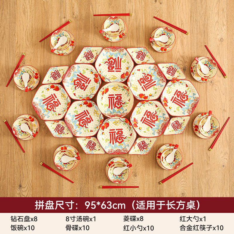 Color: 95cm diamond 58-piece soup bowl (10 bowls of bone plate spoon chopsticks)
