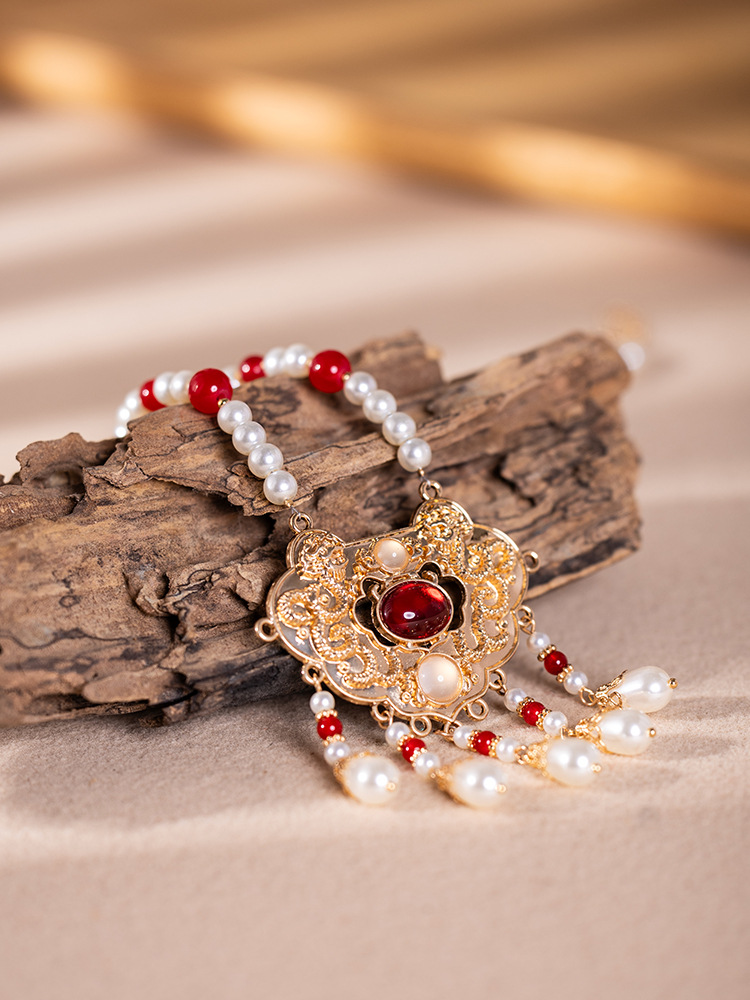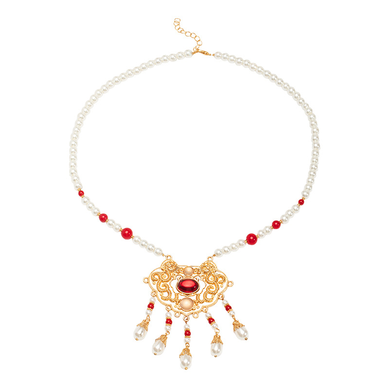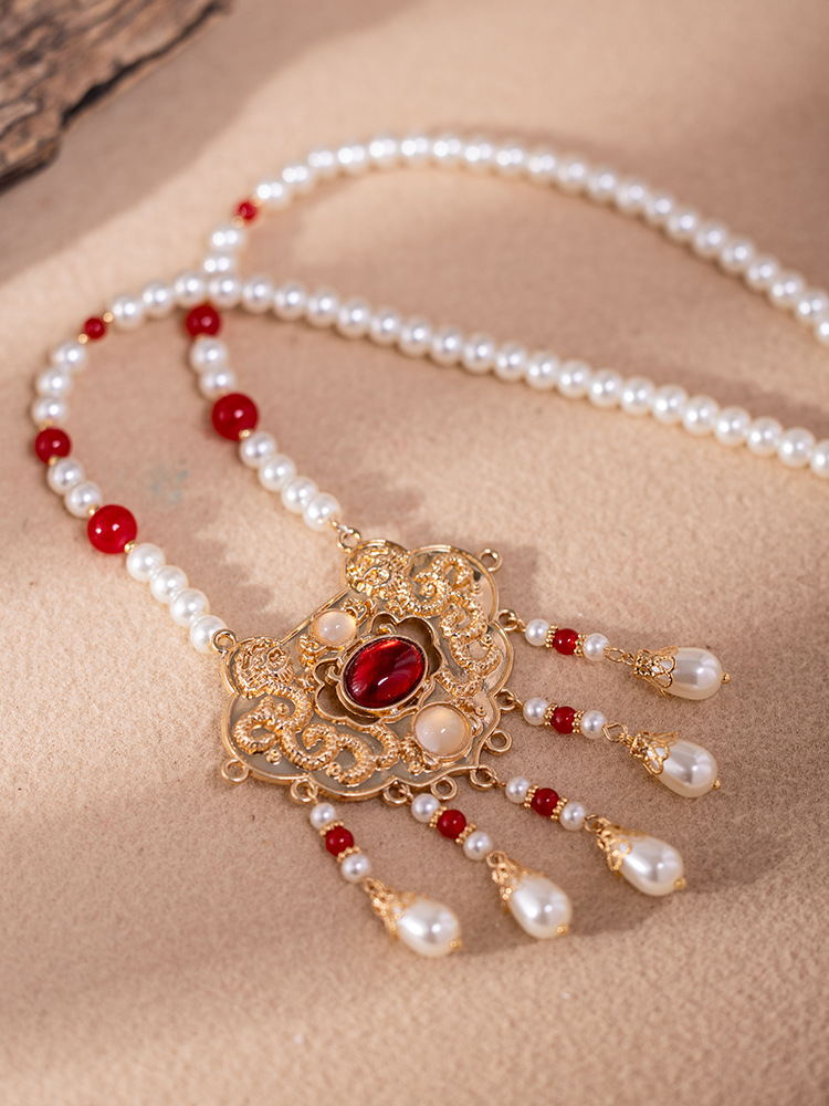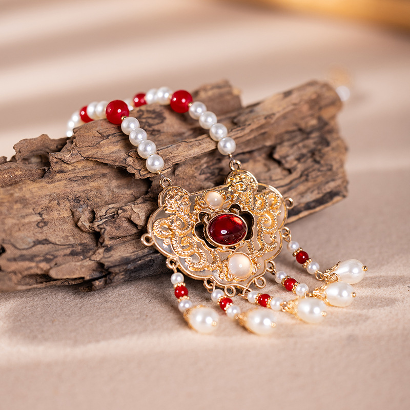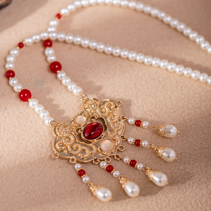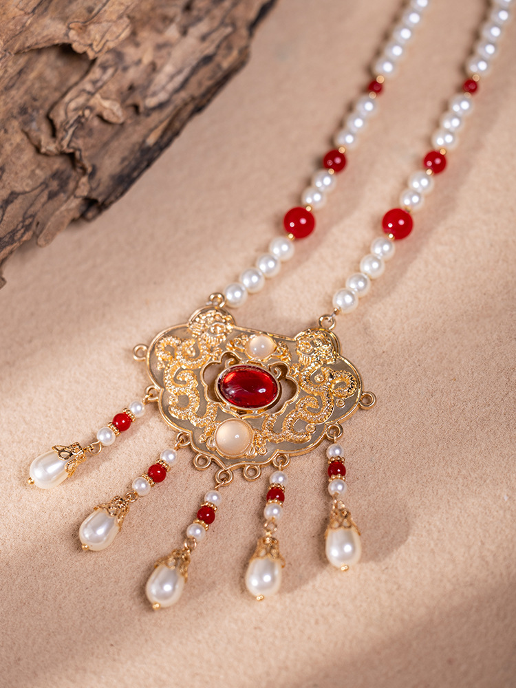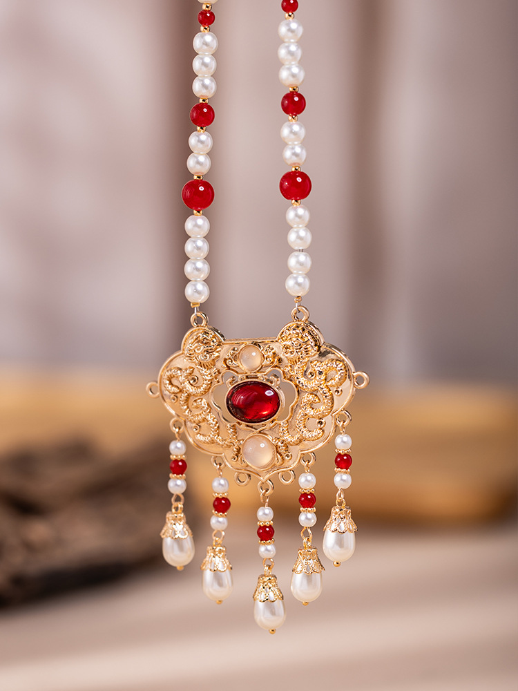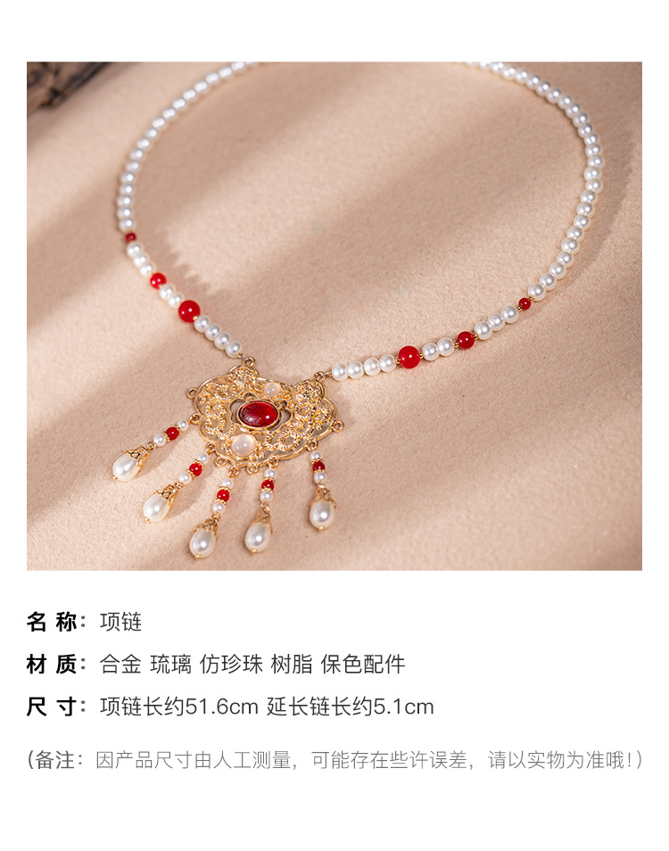 Ancient Style Kidsren's Necklace Safety Lock Yingluo Han Dynasty Accessories Red Imitation Pearl New Chinoiserie National Style Ming Dynasty Soft Yingluo