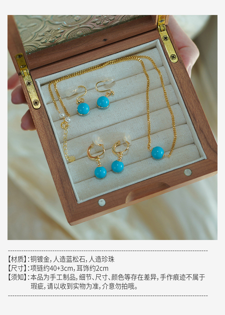 Material: Gold-plated copper, artificial blue turquoise, artificial pearl