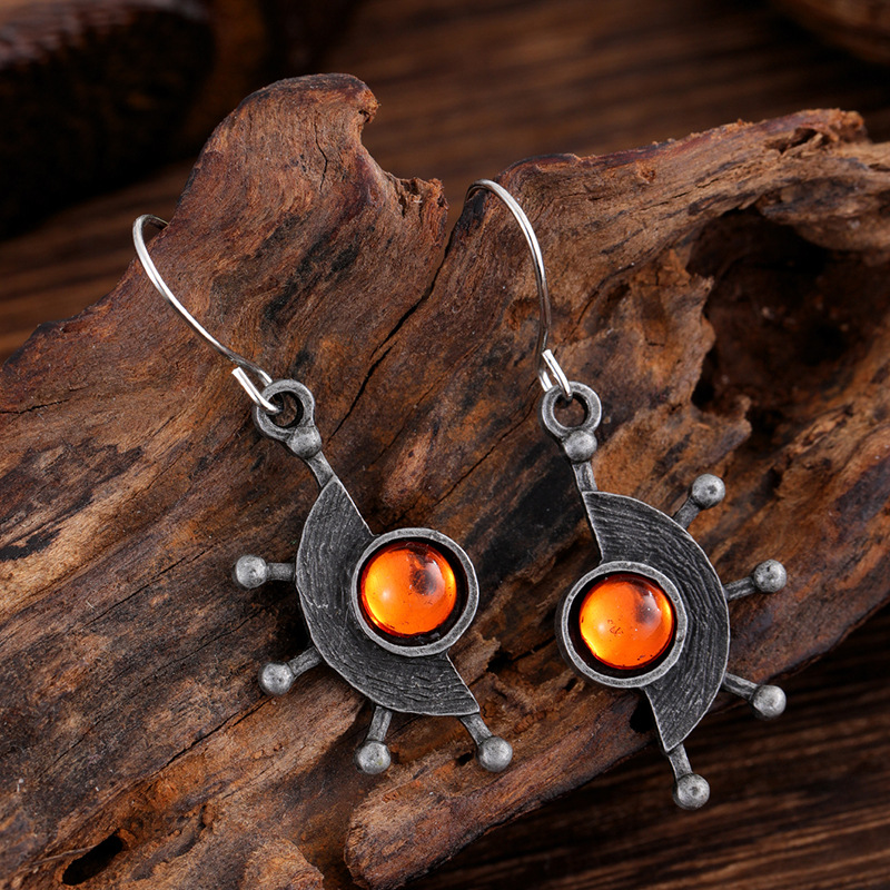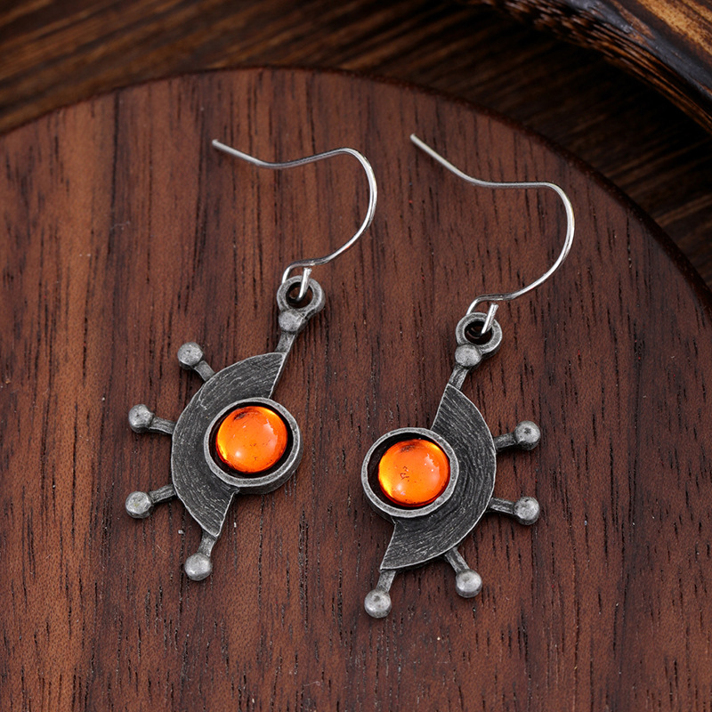 Vintage old alloy inlaid orange gemstone earrings personalized national style handmade pendant earrings