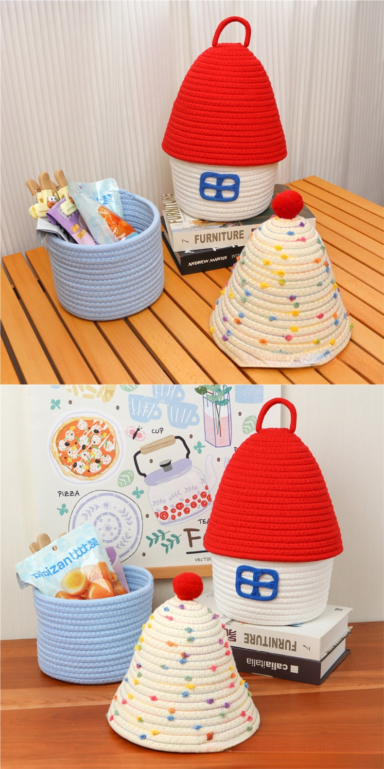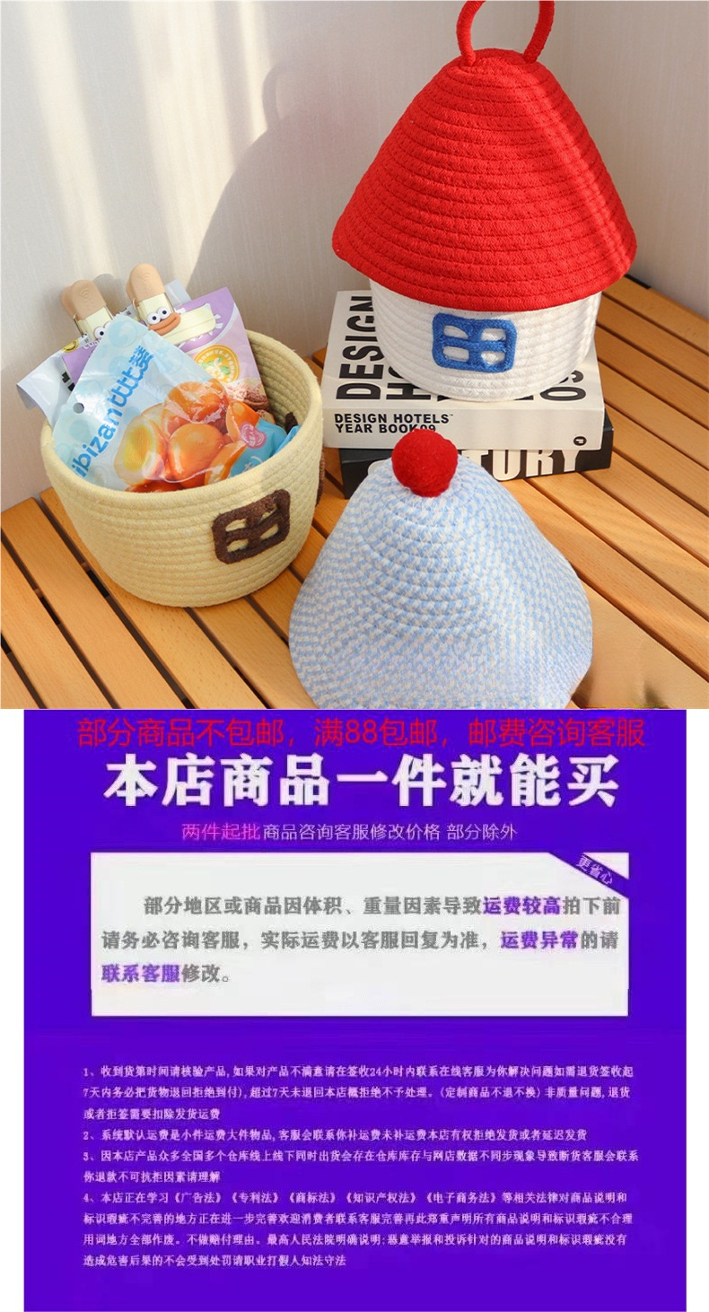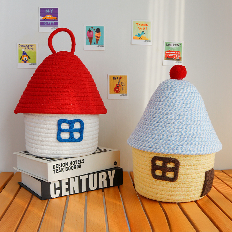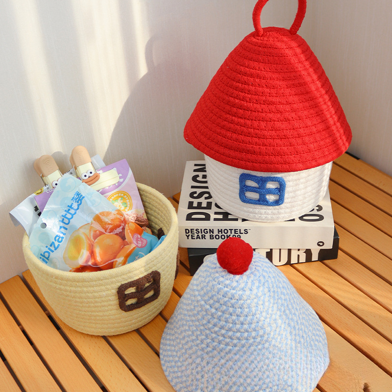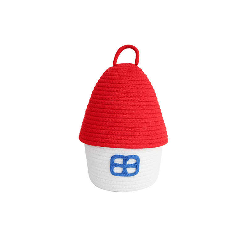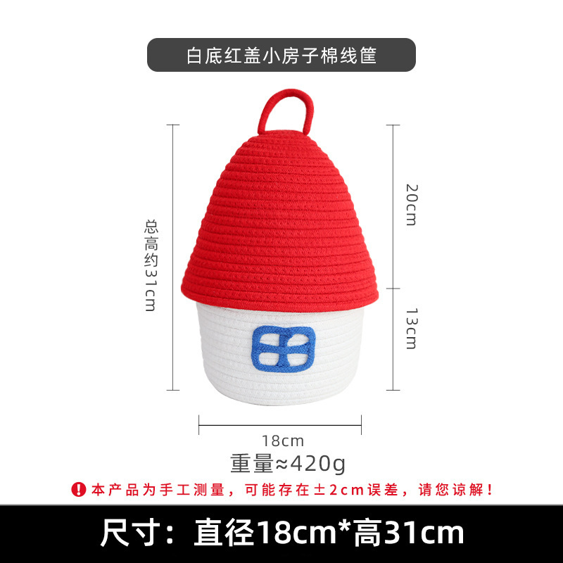 Color: Small house cotton thread basket with red cover on white background