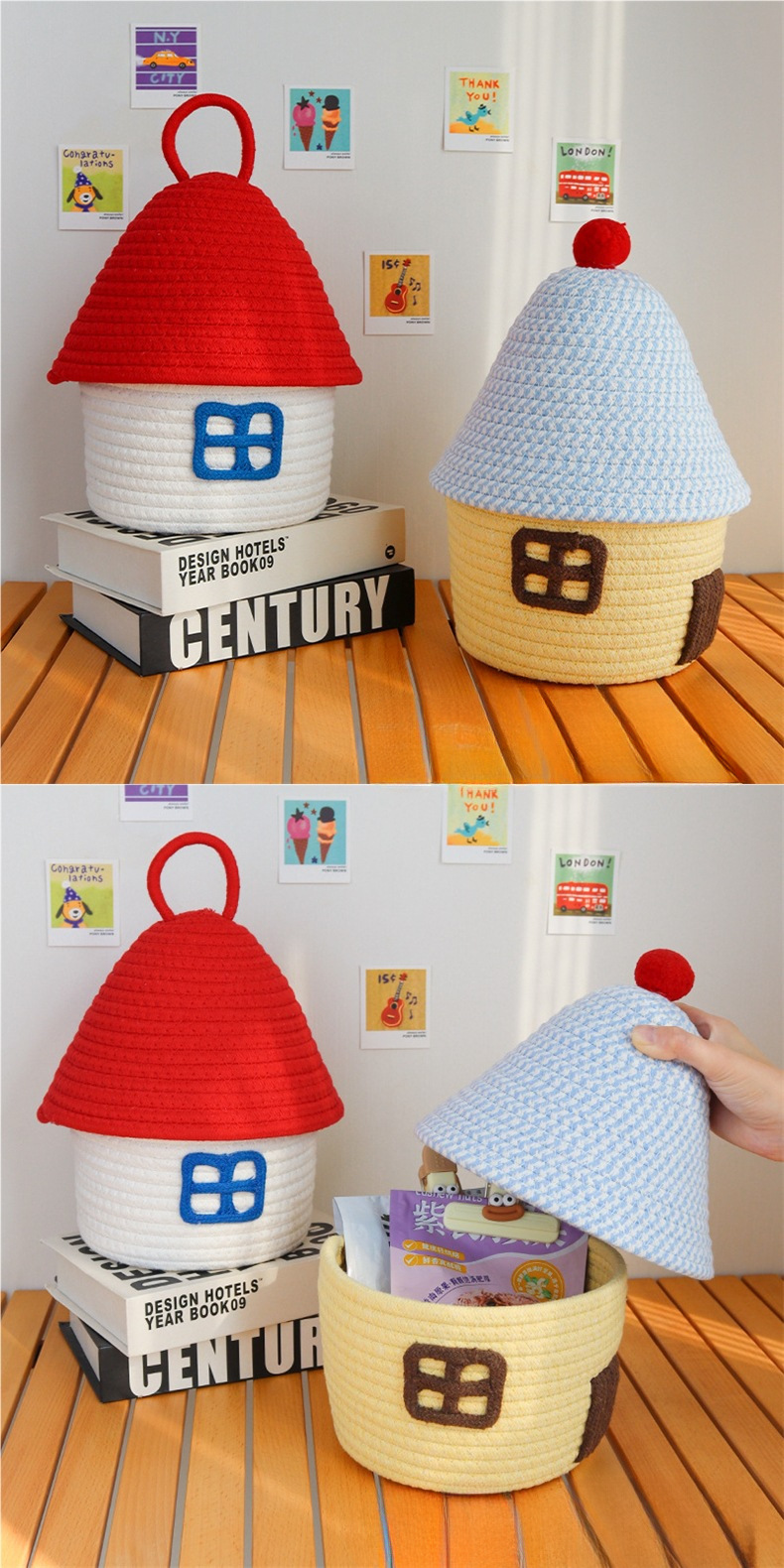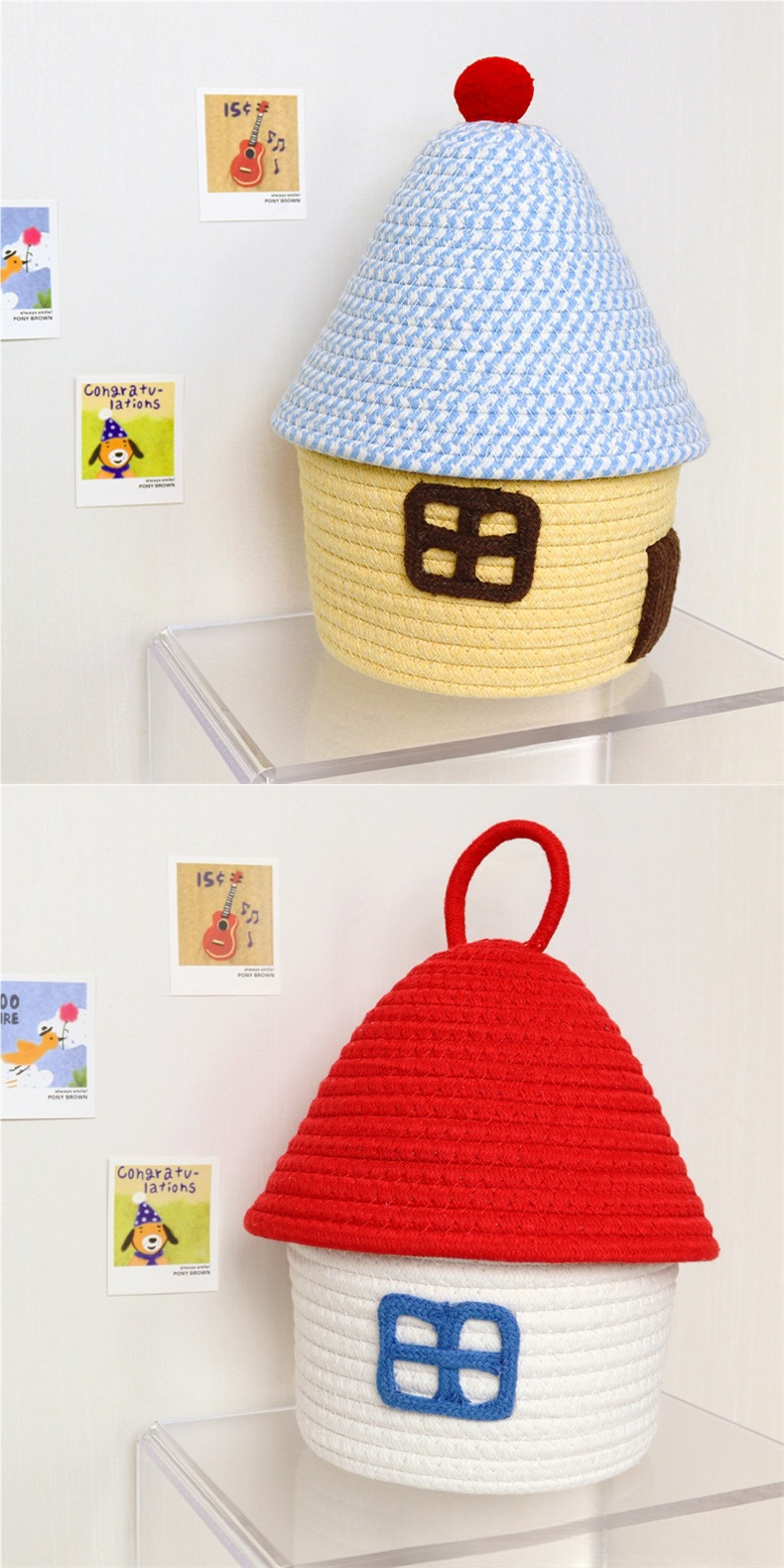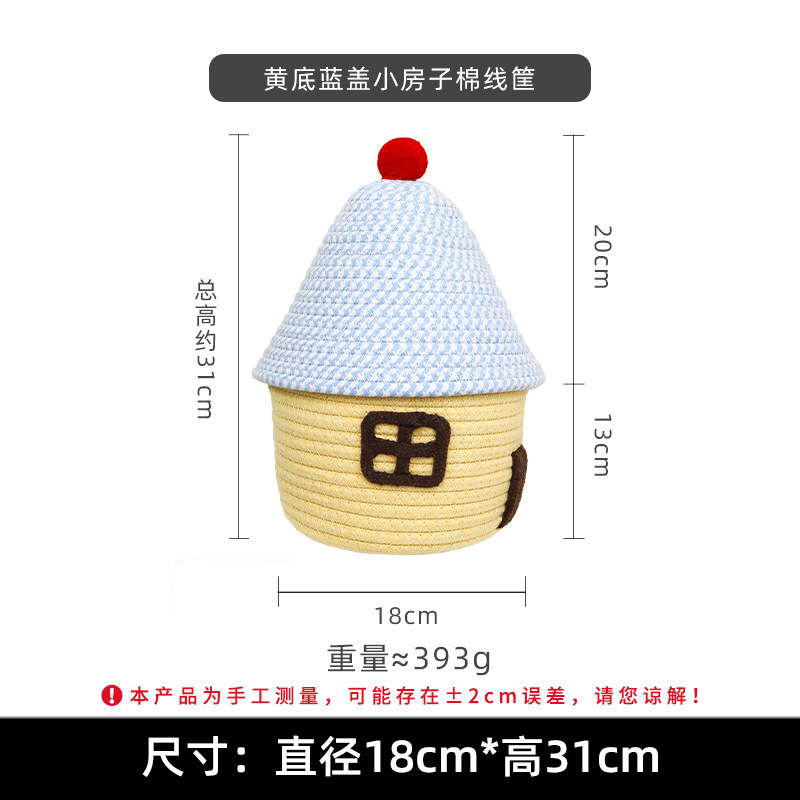 Color: Small house cotton thread basket with blue cover on yellow background