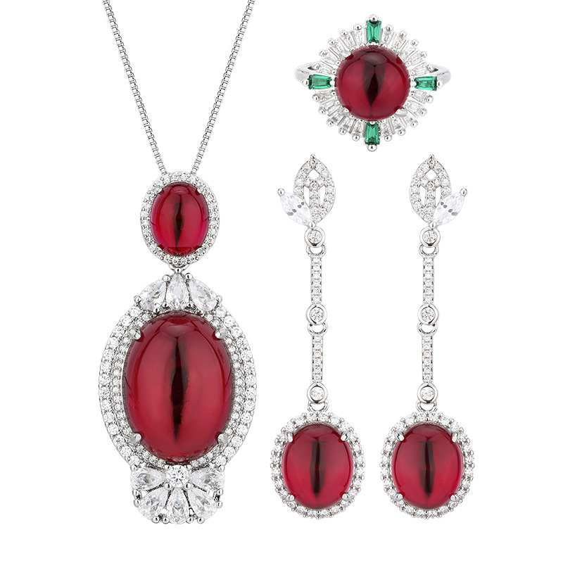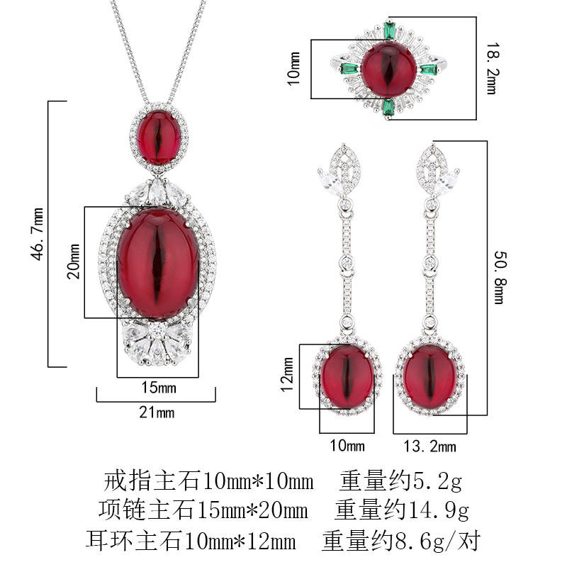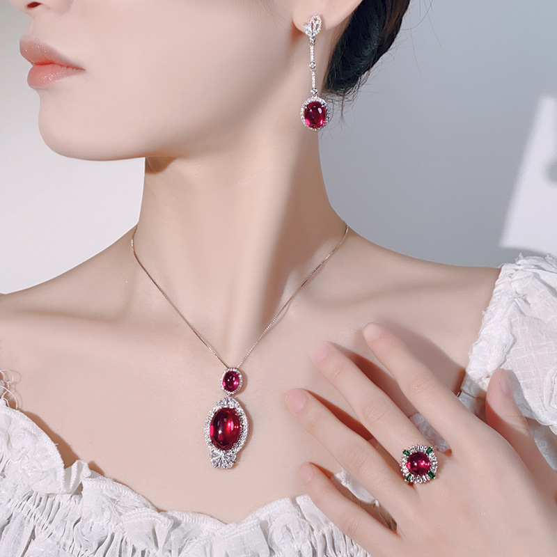 S925 Silver Needle suit Earrings Necklace Ring Copper Jewelry Pigeon Blood Corundum Retro Exquisite High-end Luxury Women's Style