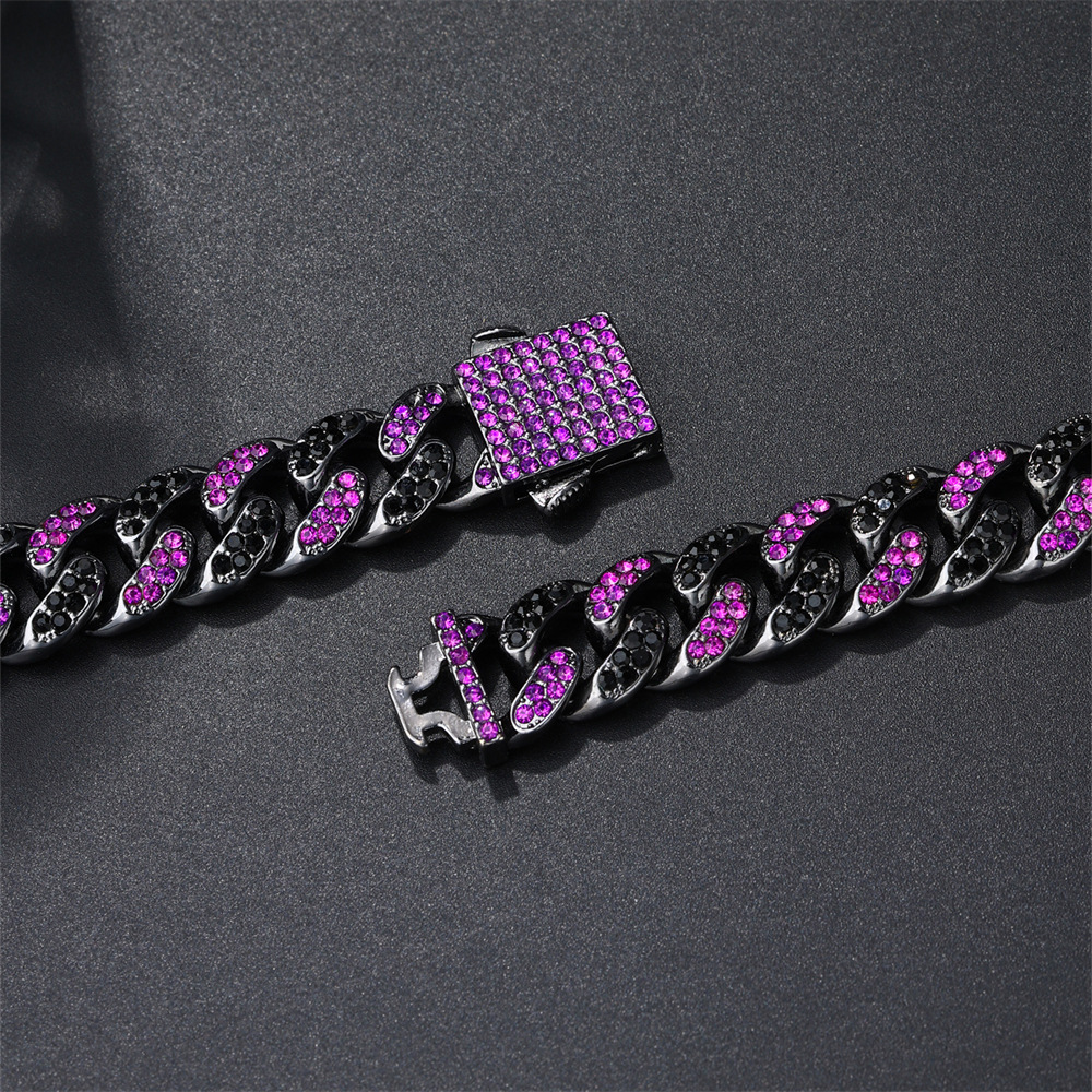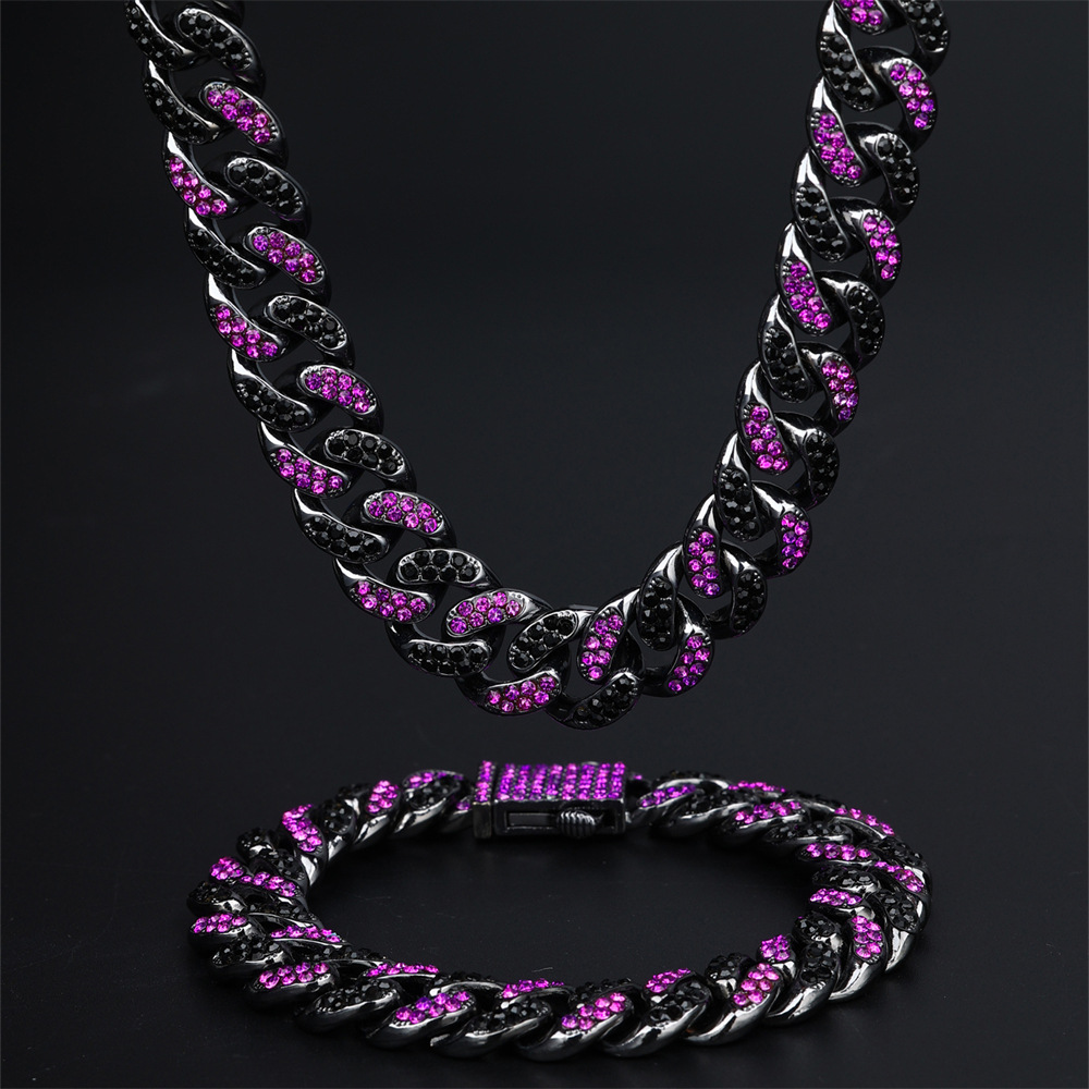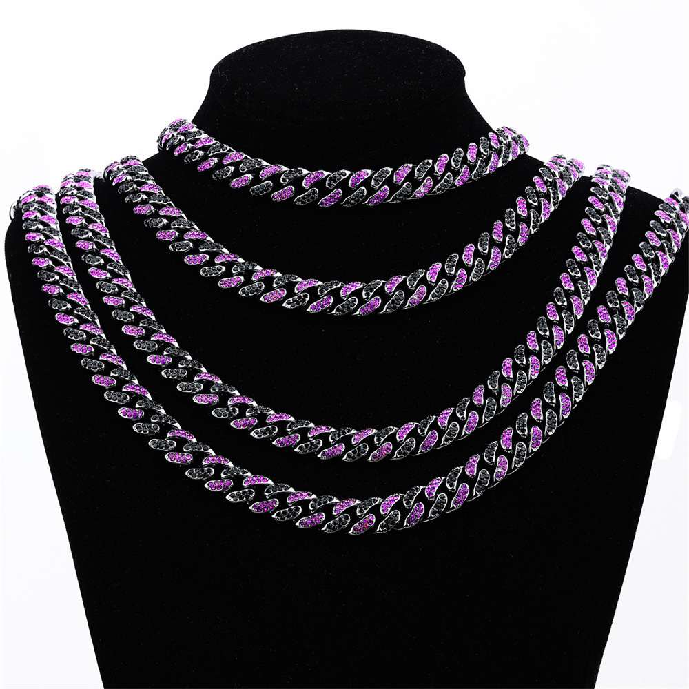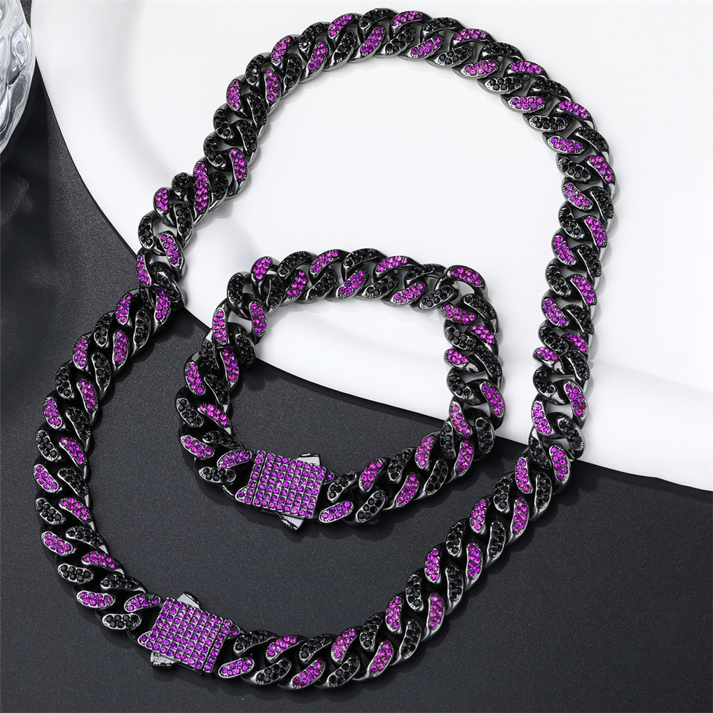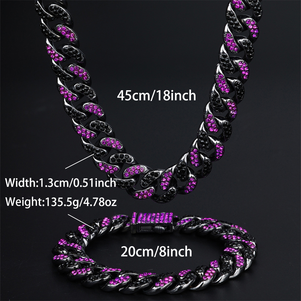Hip Hop Men's Black Purple Diamond Cuban Chain Necklace Bracelet Line Exaggerated Personality Rap Rhinestone Accessories