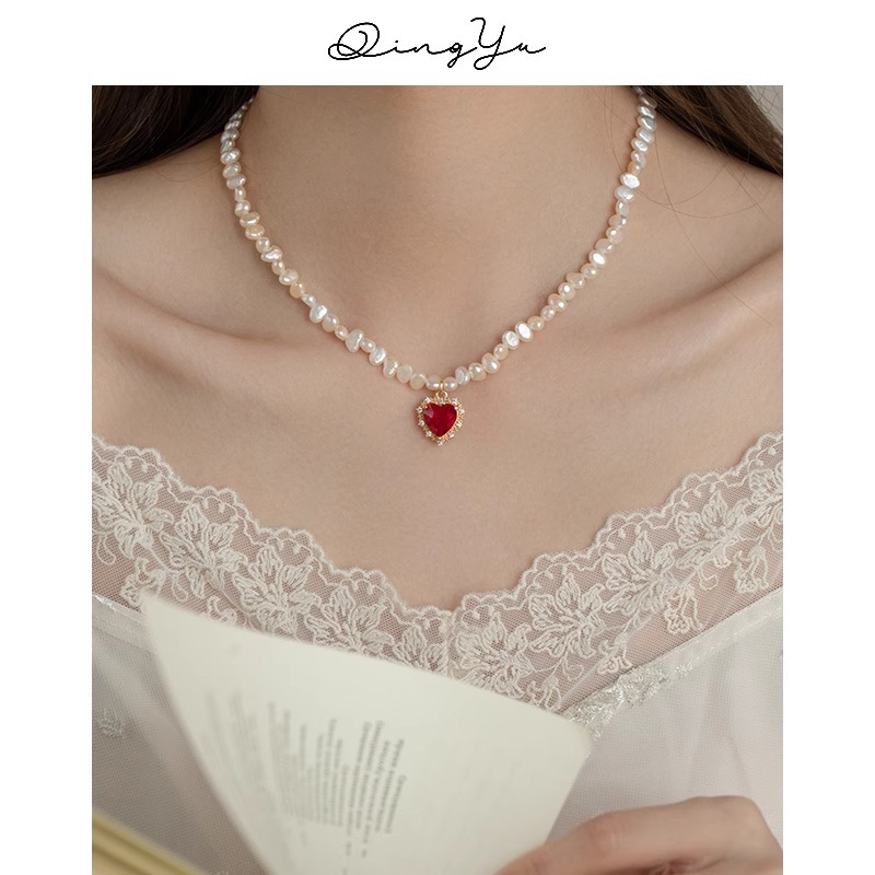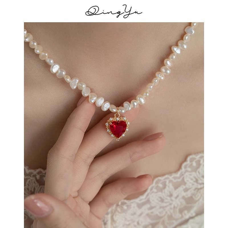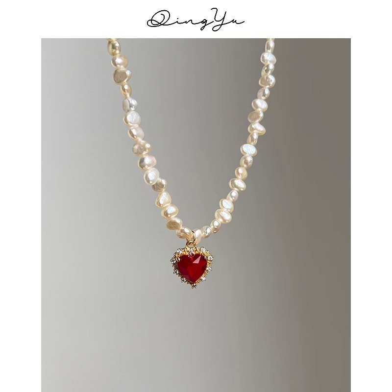 Vintage French Court Girl Ruby Rhinestone Hedge Love Pendant Pearl Necklace Niche Design Clavicle Chain