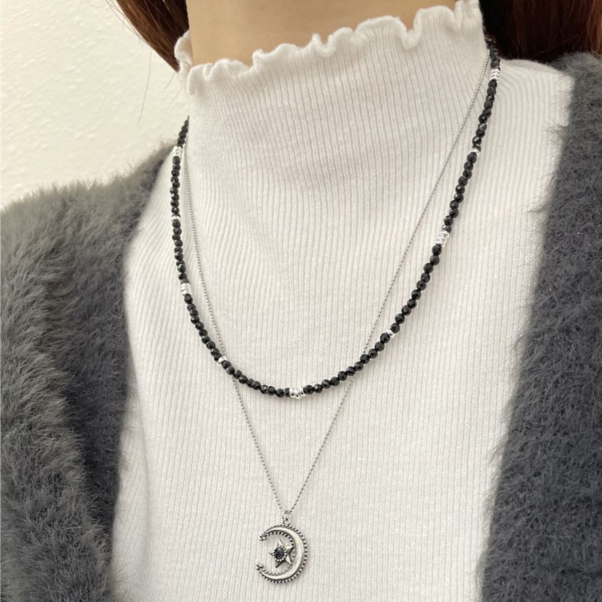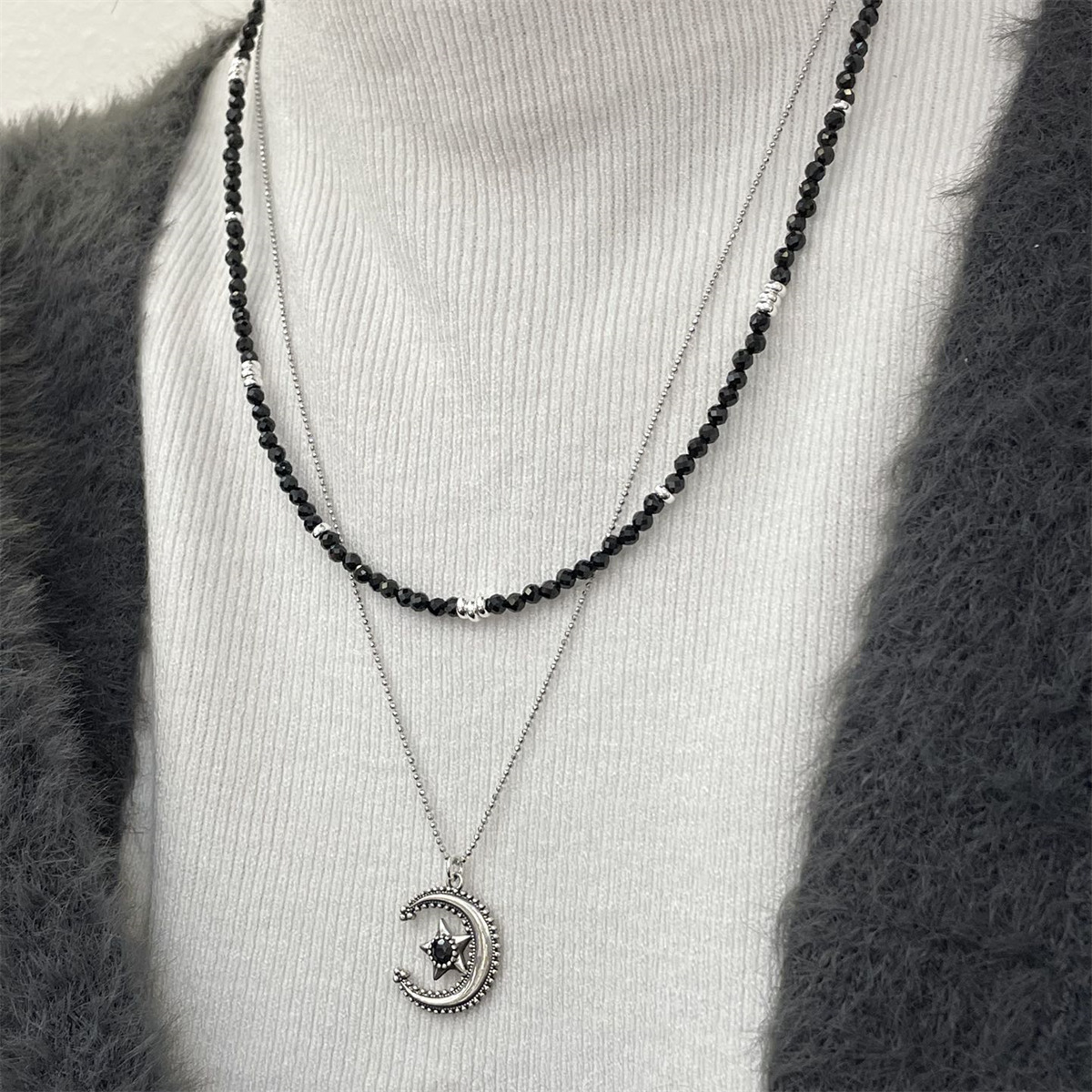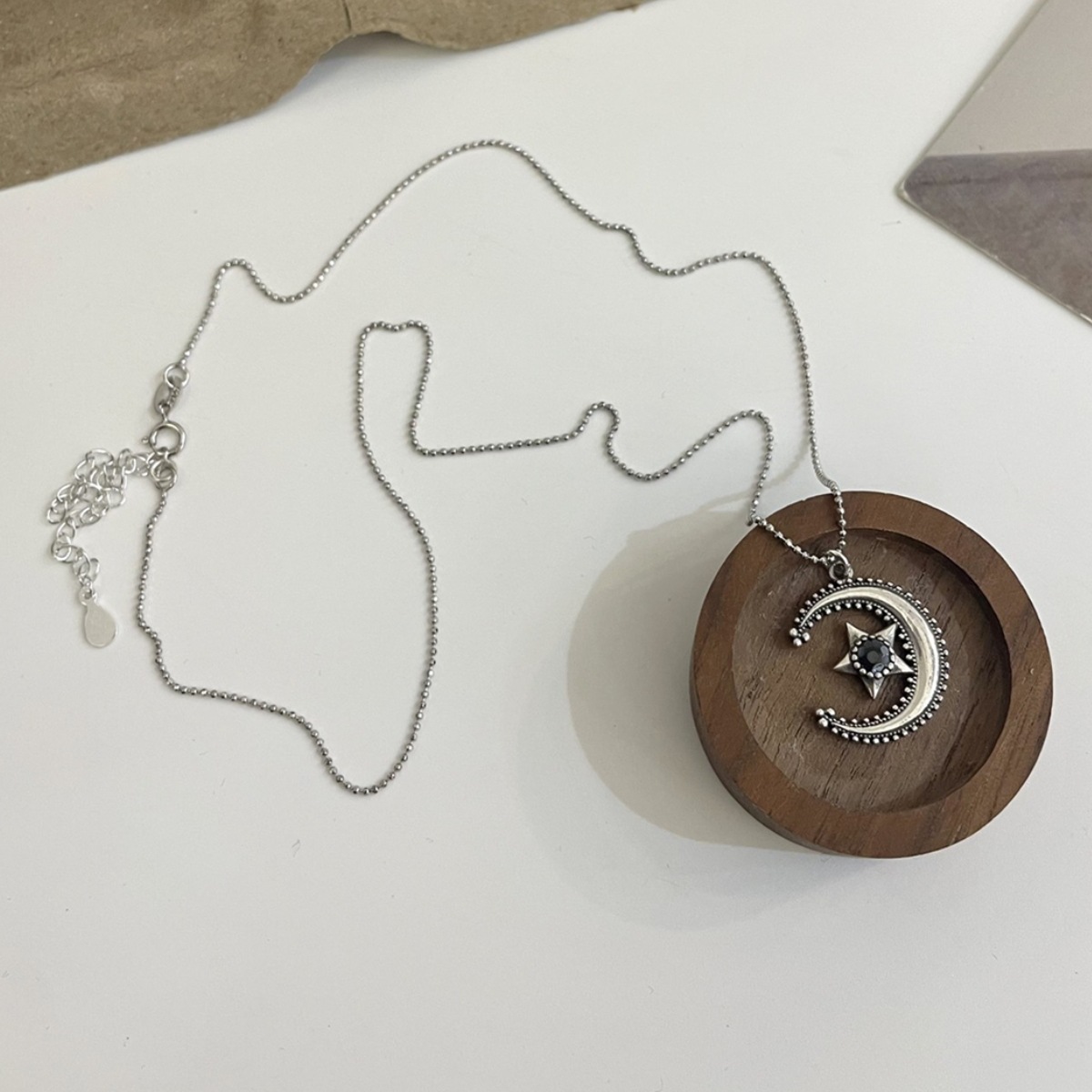 S925 Silver Vintage Star Moon Antique Thai Silver Necklace➕Black Pointy Crystal Necklace Bracelet suit Korean-style Simple High-end Sense