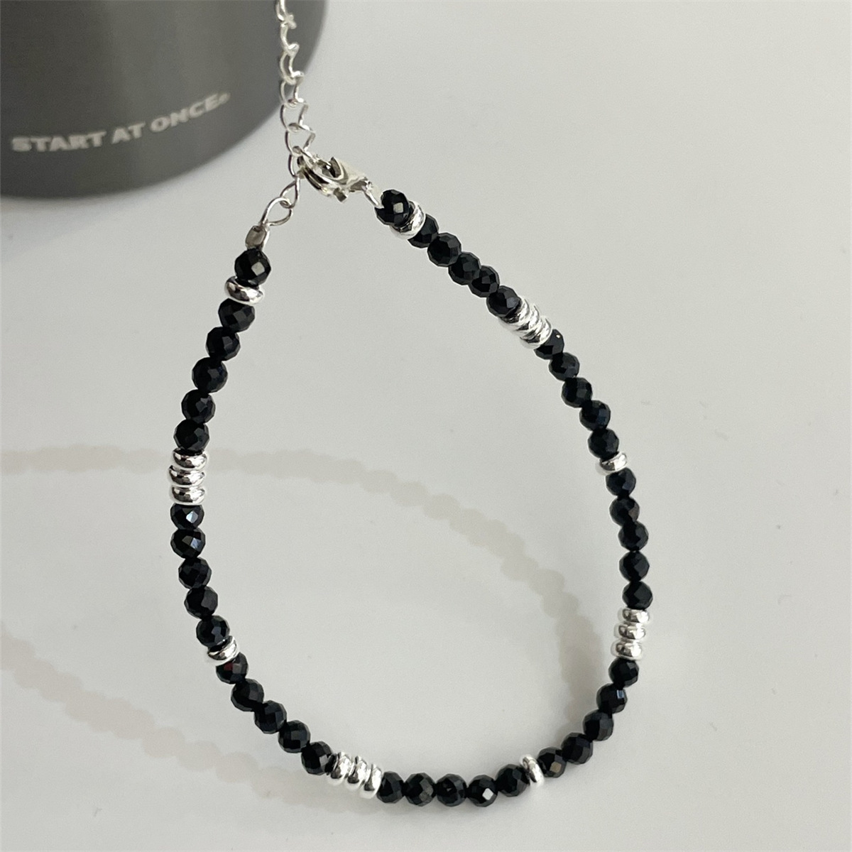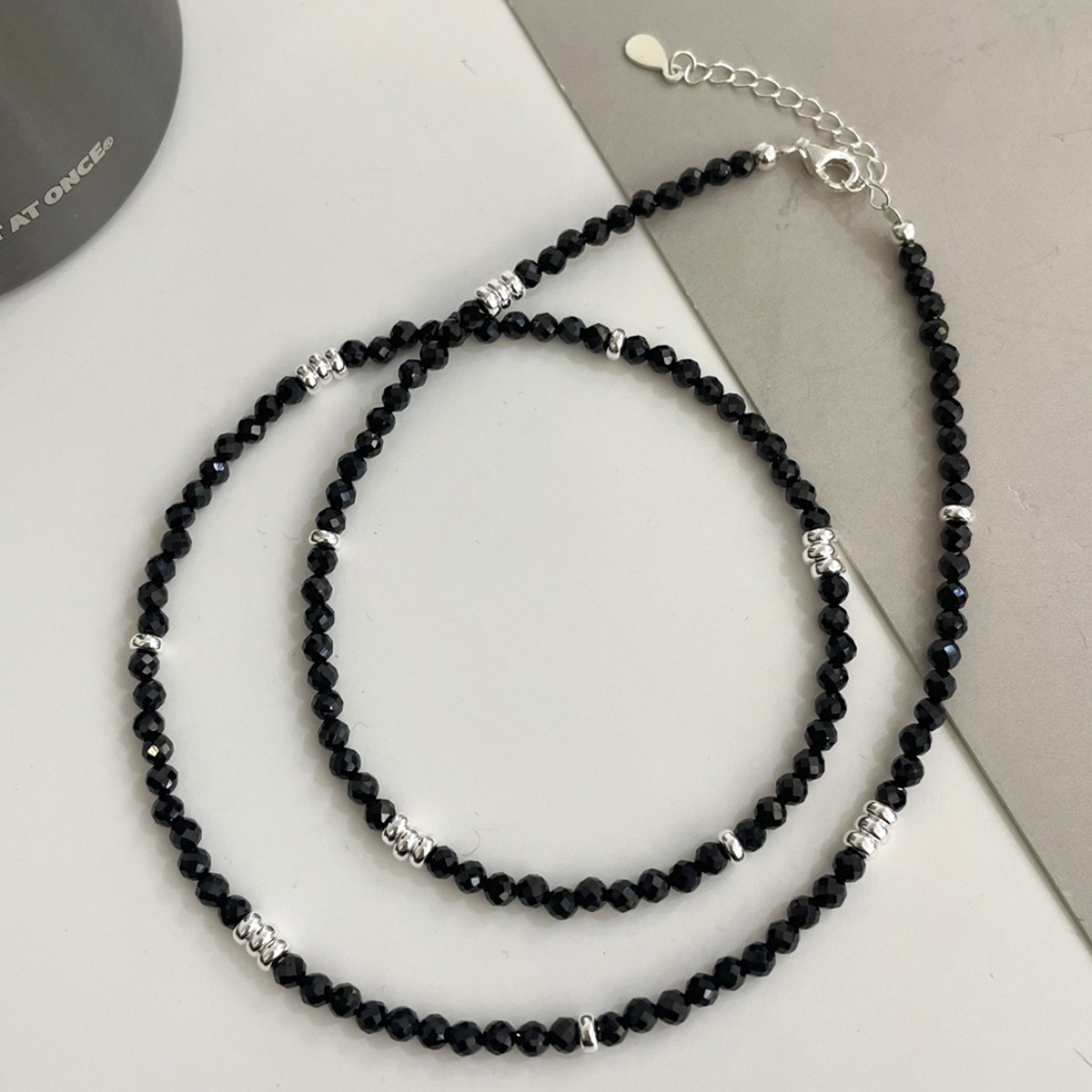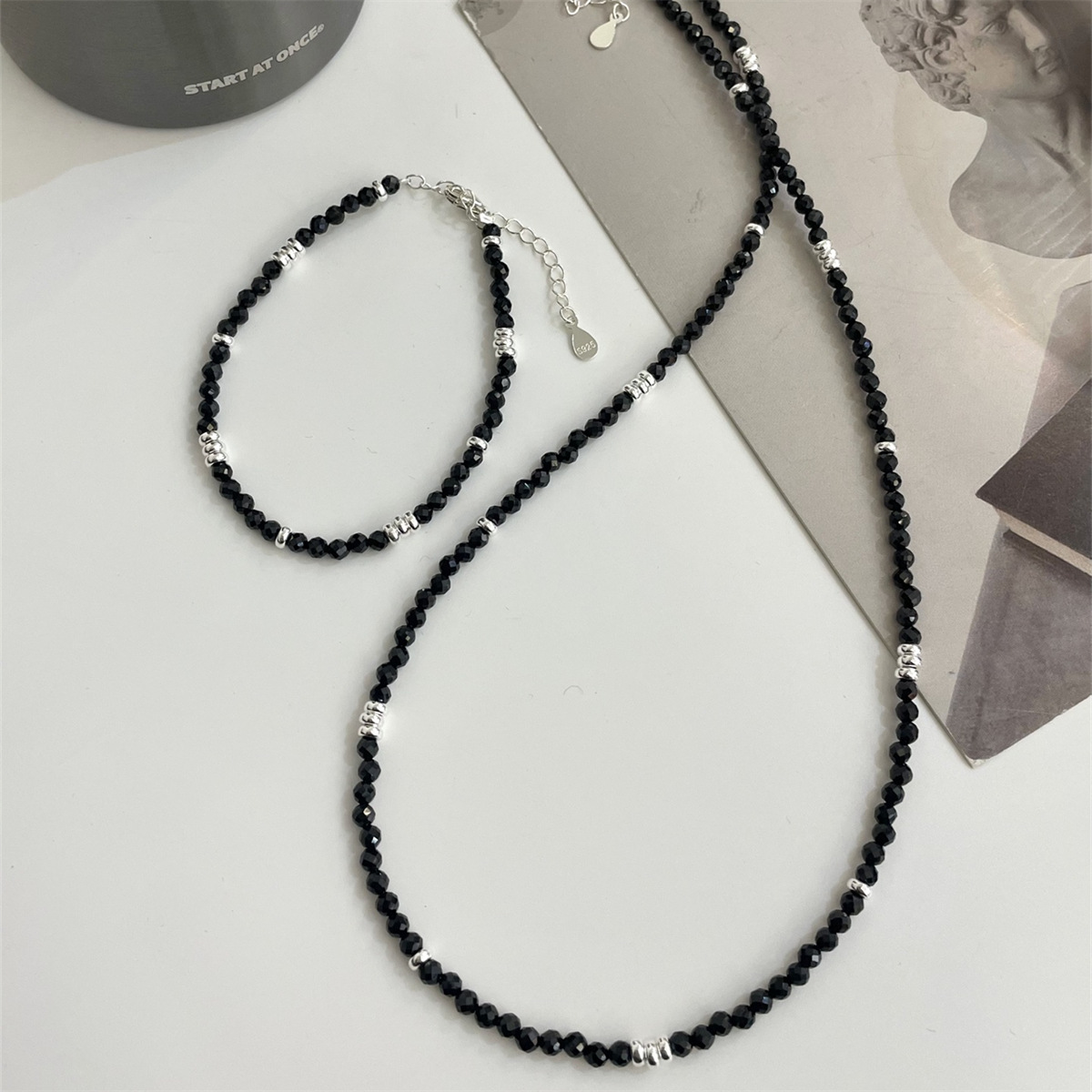 S925 Silver Vintage Star Moon Antique Thai Silver Necklace➕Black Pointy Crystal Necklace Bracelet suit Korean-style Simple High-end Sense