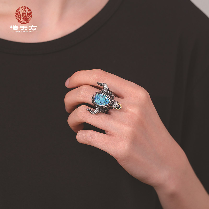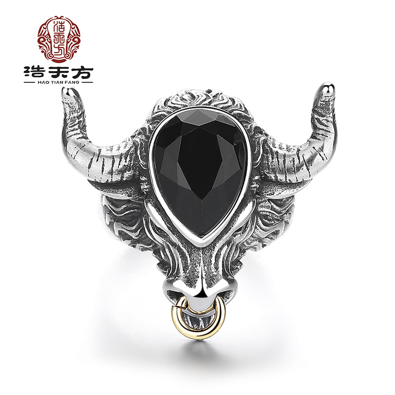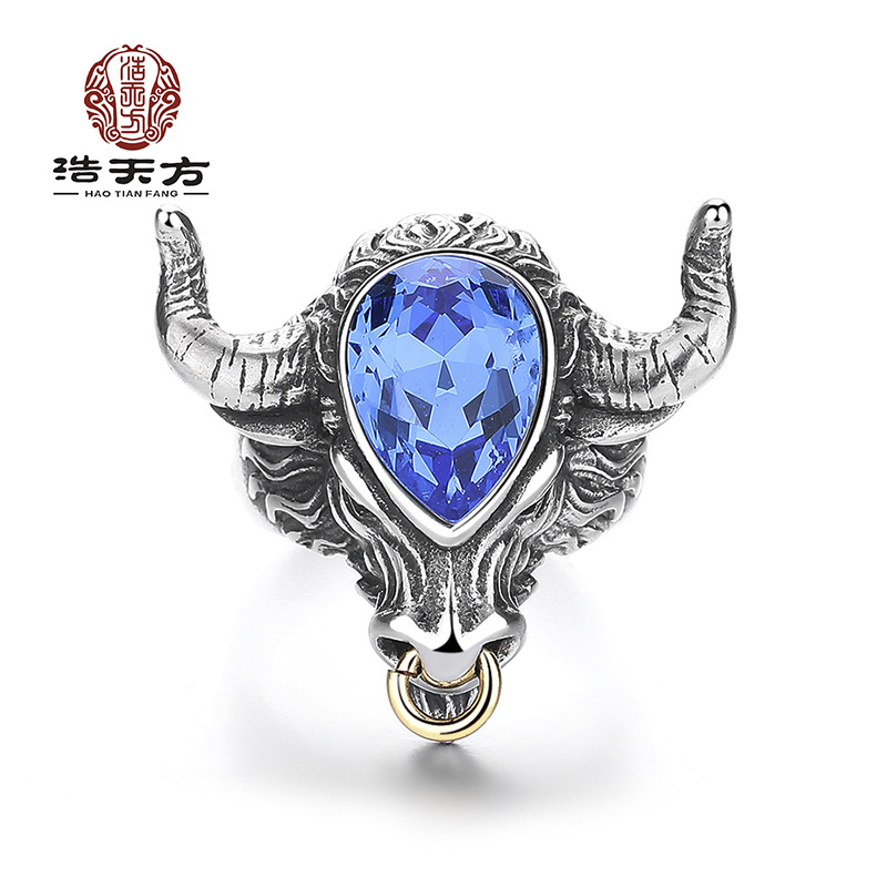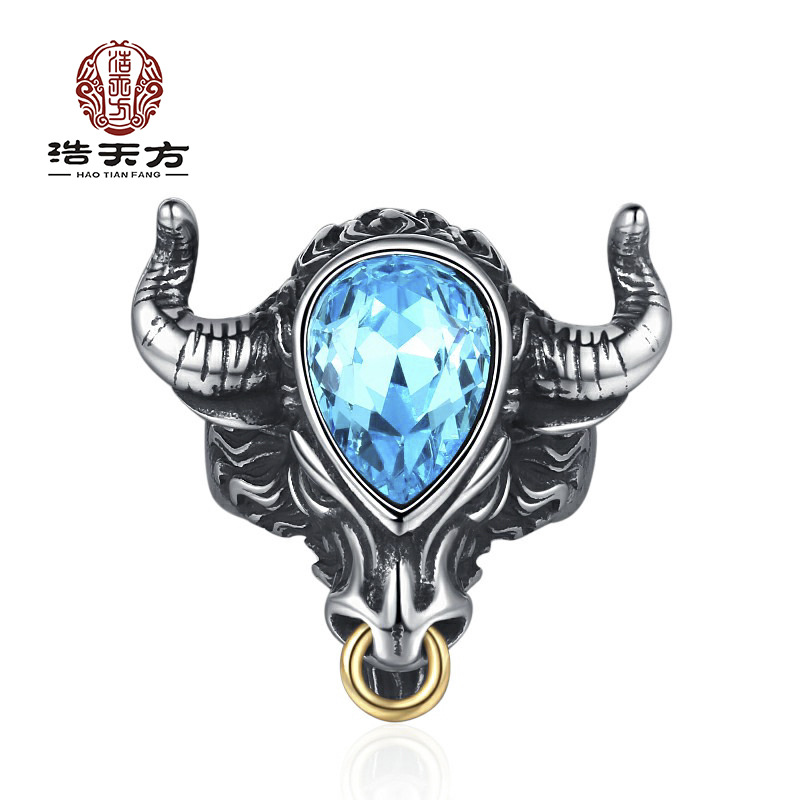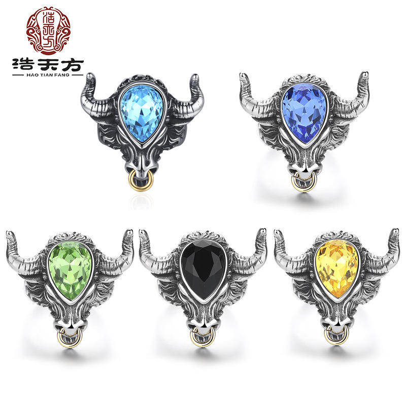欧美新款不锈钢斗牛戒指 跨境新多色牛头宝石戒指男 钛钢动物戒指