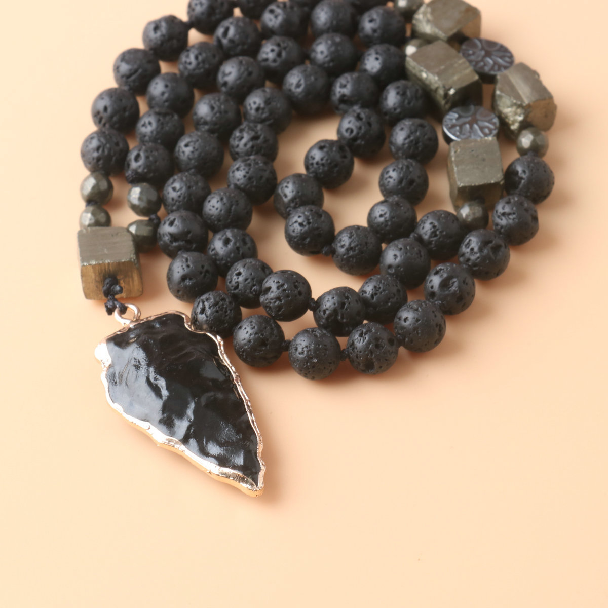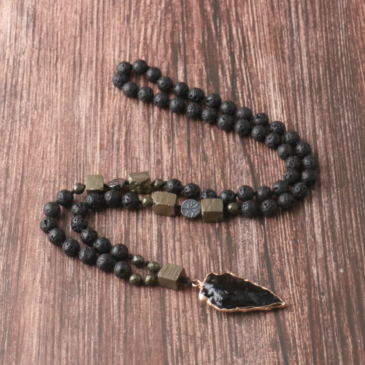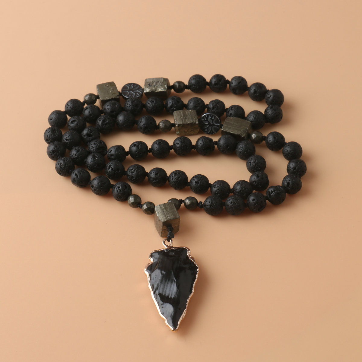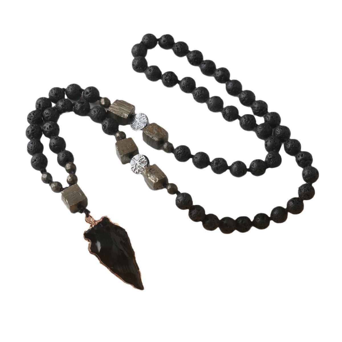 Obsidian Arrow Pendant Rosary Necklace Volcanic Stone Copper Iron Ore Handmade Knot Necklace Men's Necklace