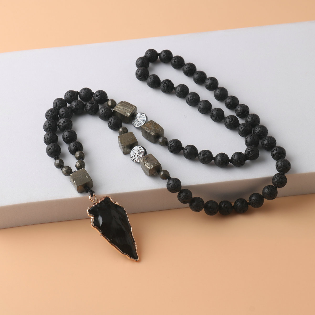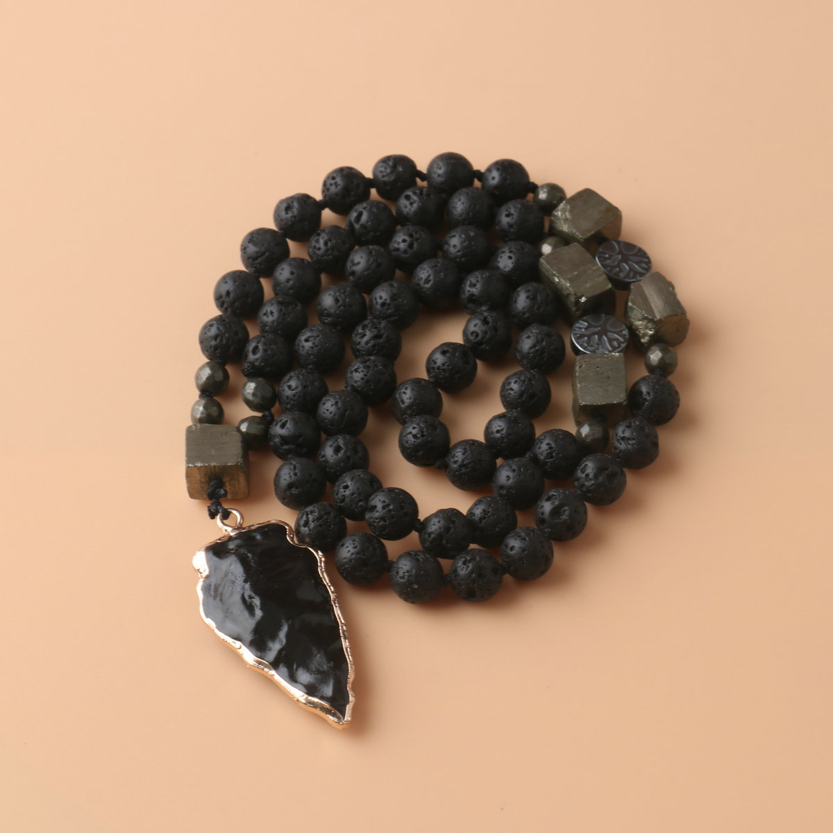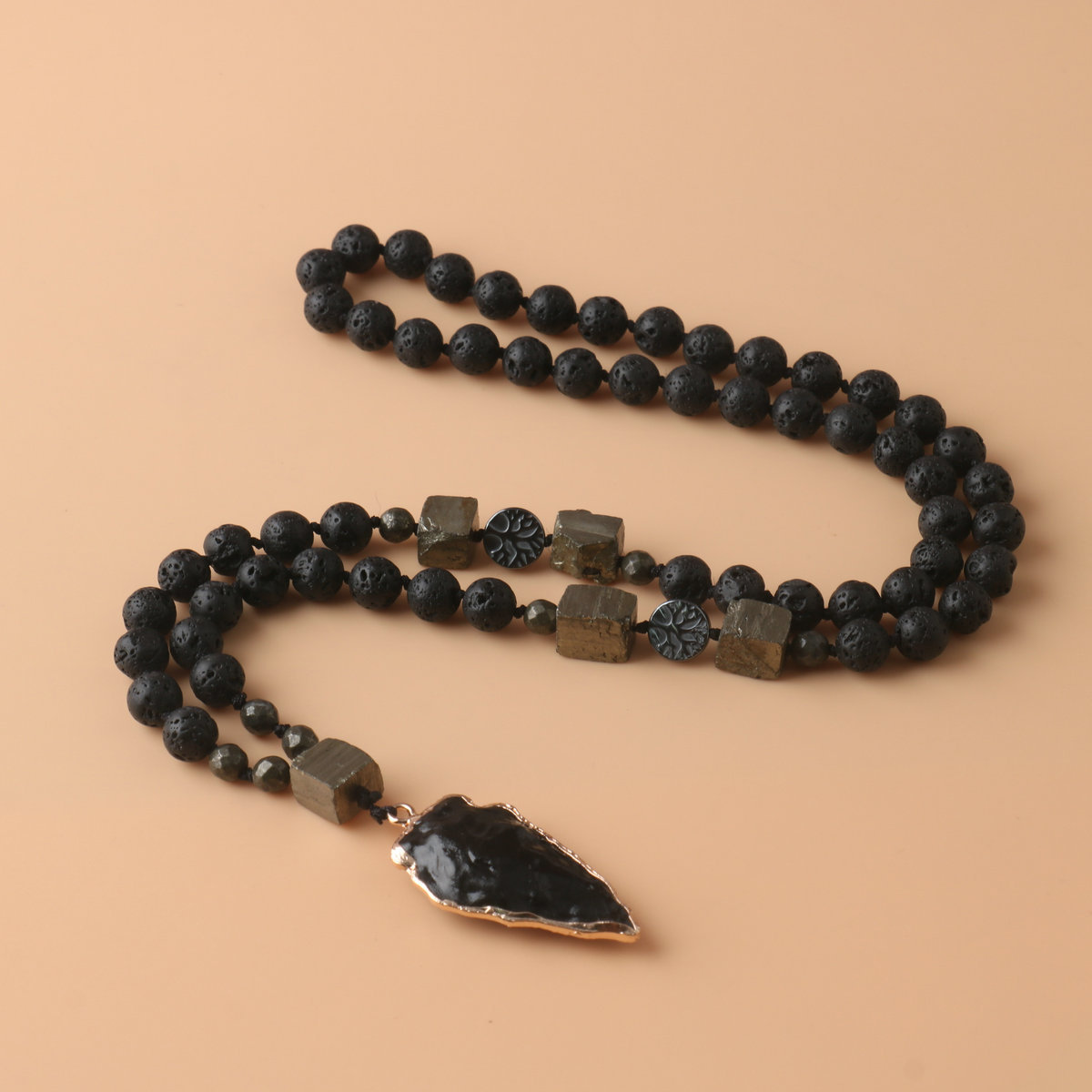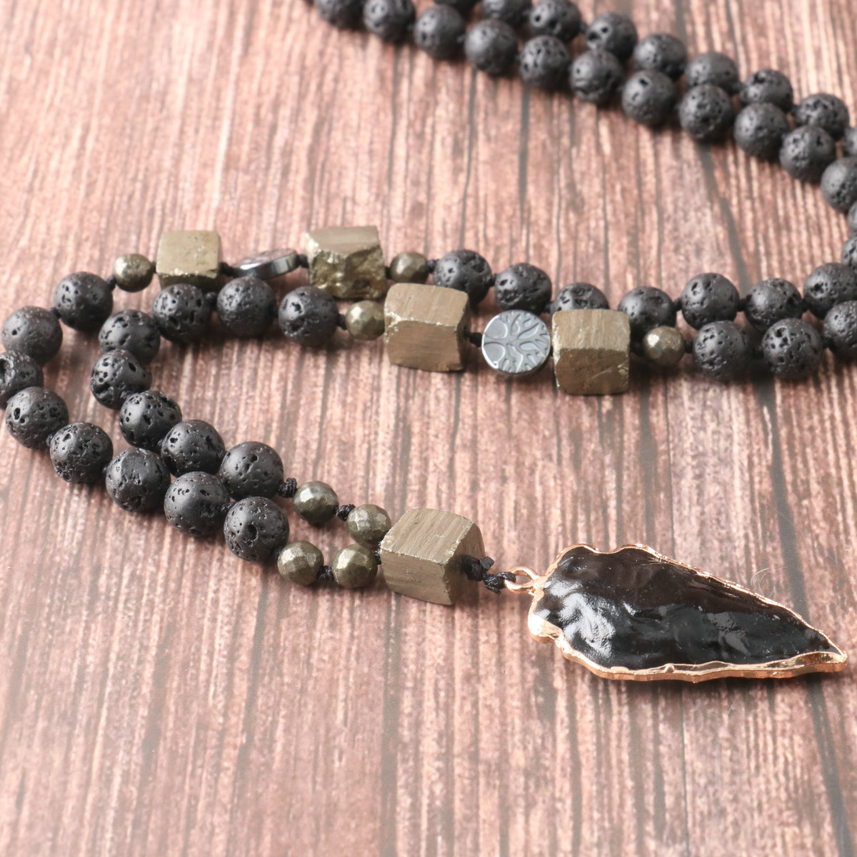 Obsidian Arrow Pendant Rosary Necklace Volcanic Stone Copper Iron Ore Handmade Knot Necklace Men's Necklace