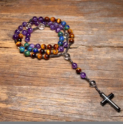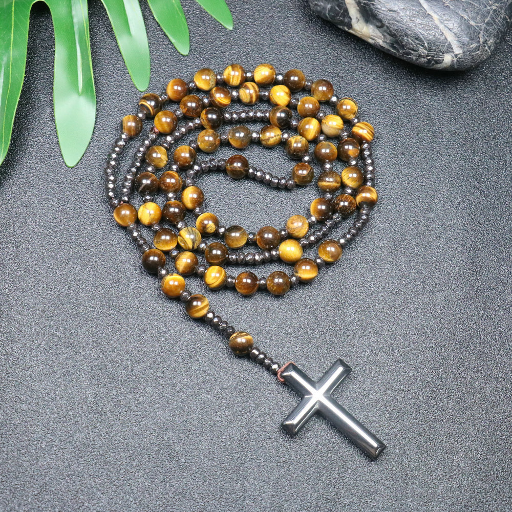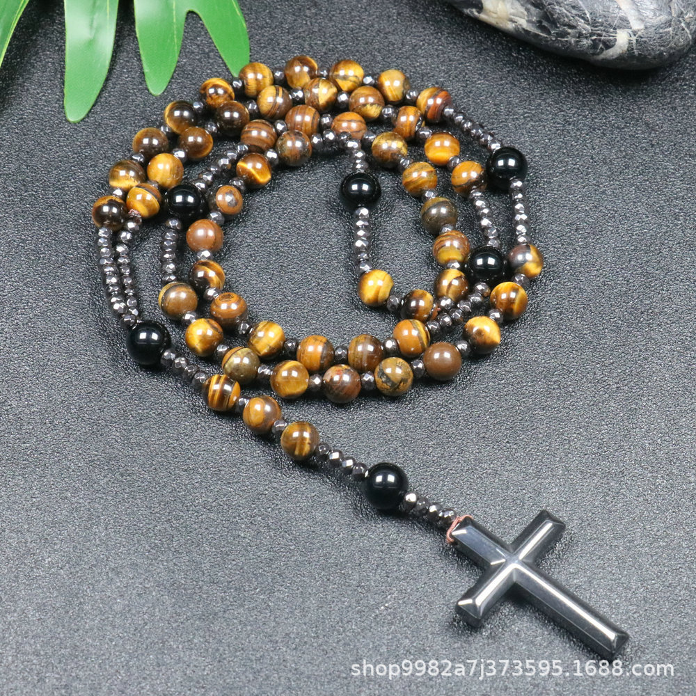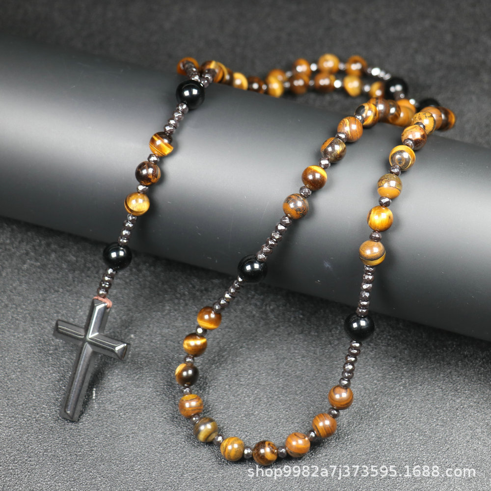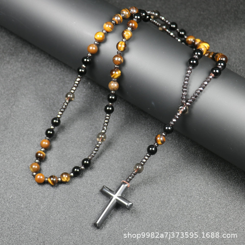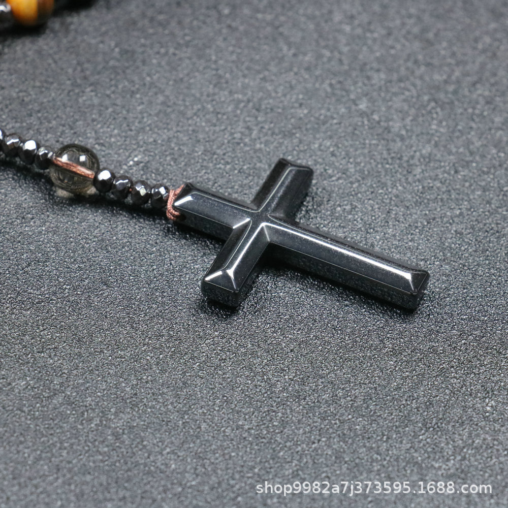 Amazon Natural Stone Cross Pendant Necklace Tiger Eye Stone Iron Gallbladder Cross Rosary for Men Necklace Wholesale