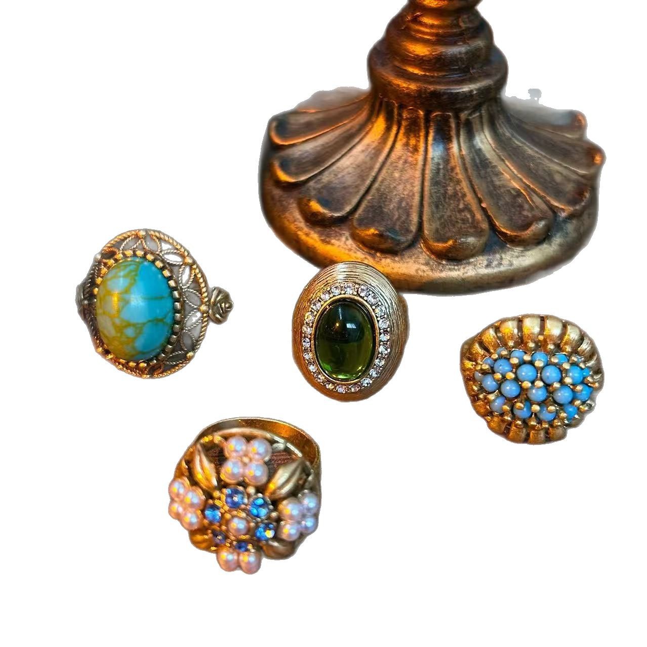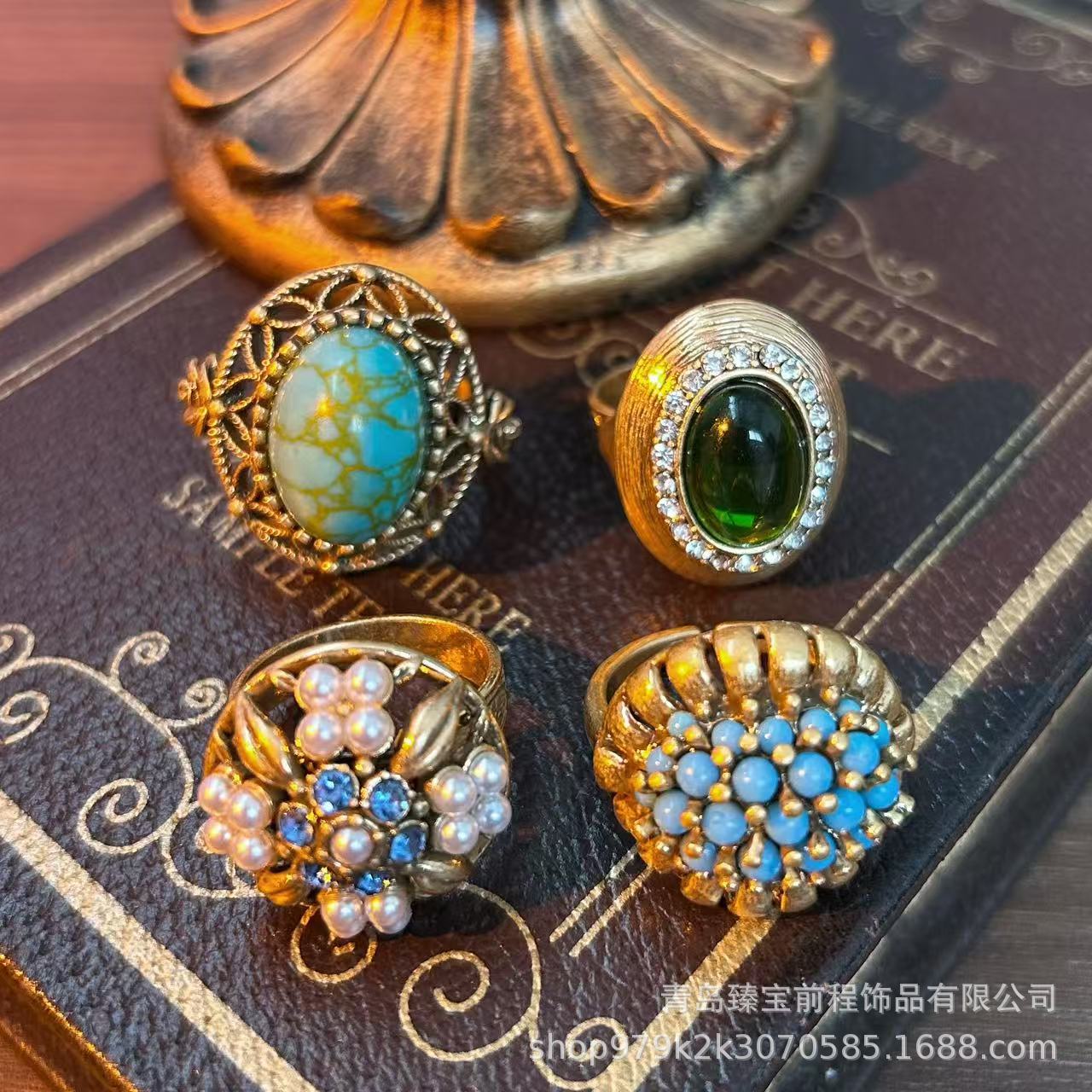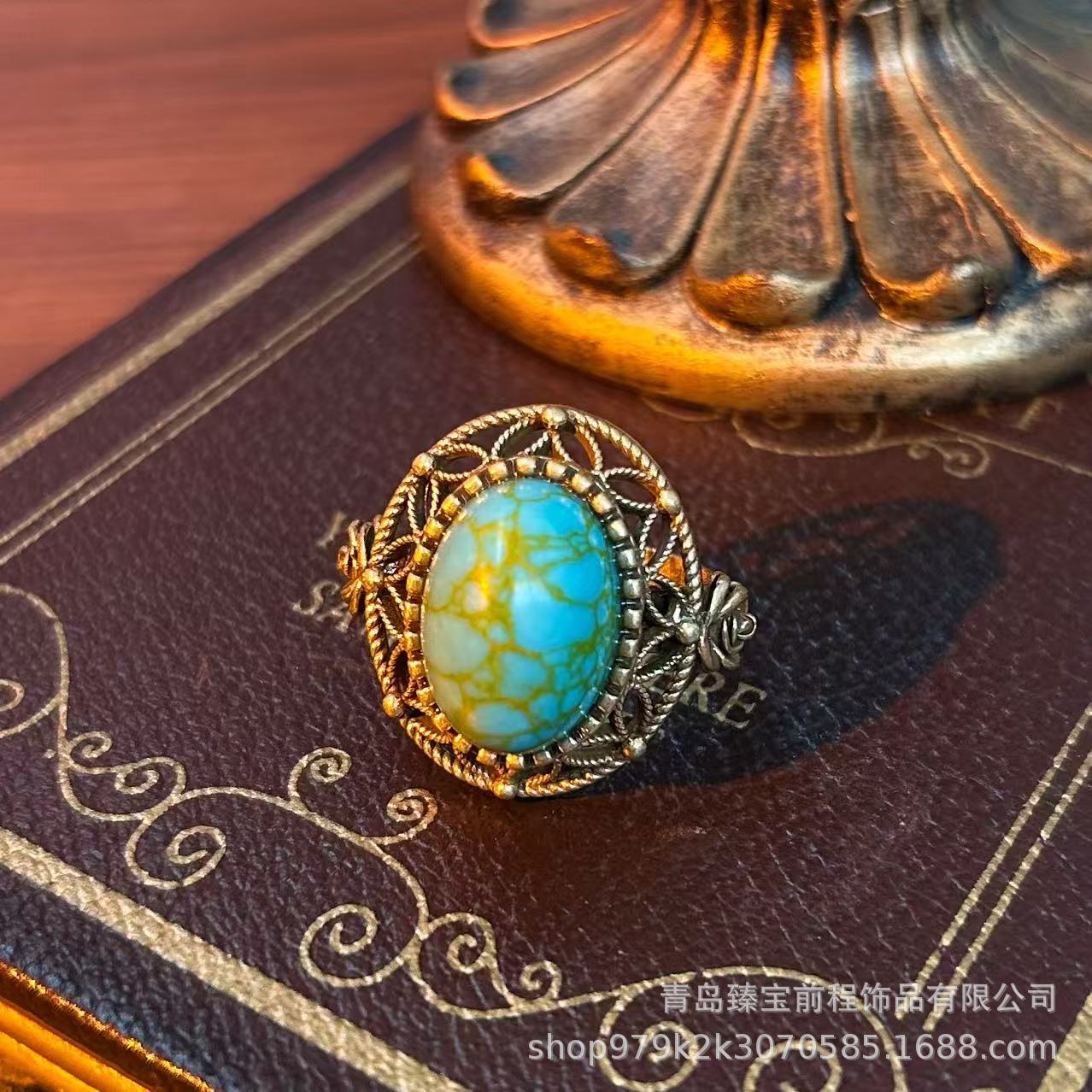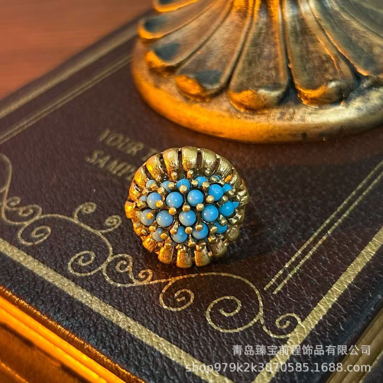 Antique Miscellaneous Old Copper Ring Middle vintage Turquoise Inlaid Hollow Pearl Carved Opening Ring