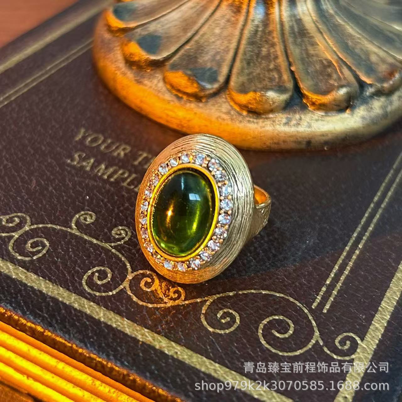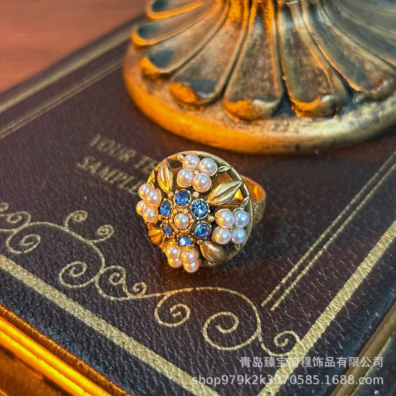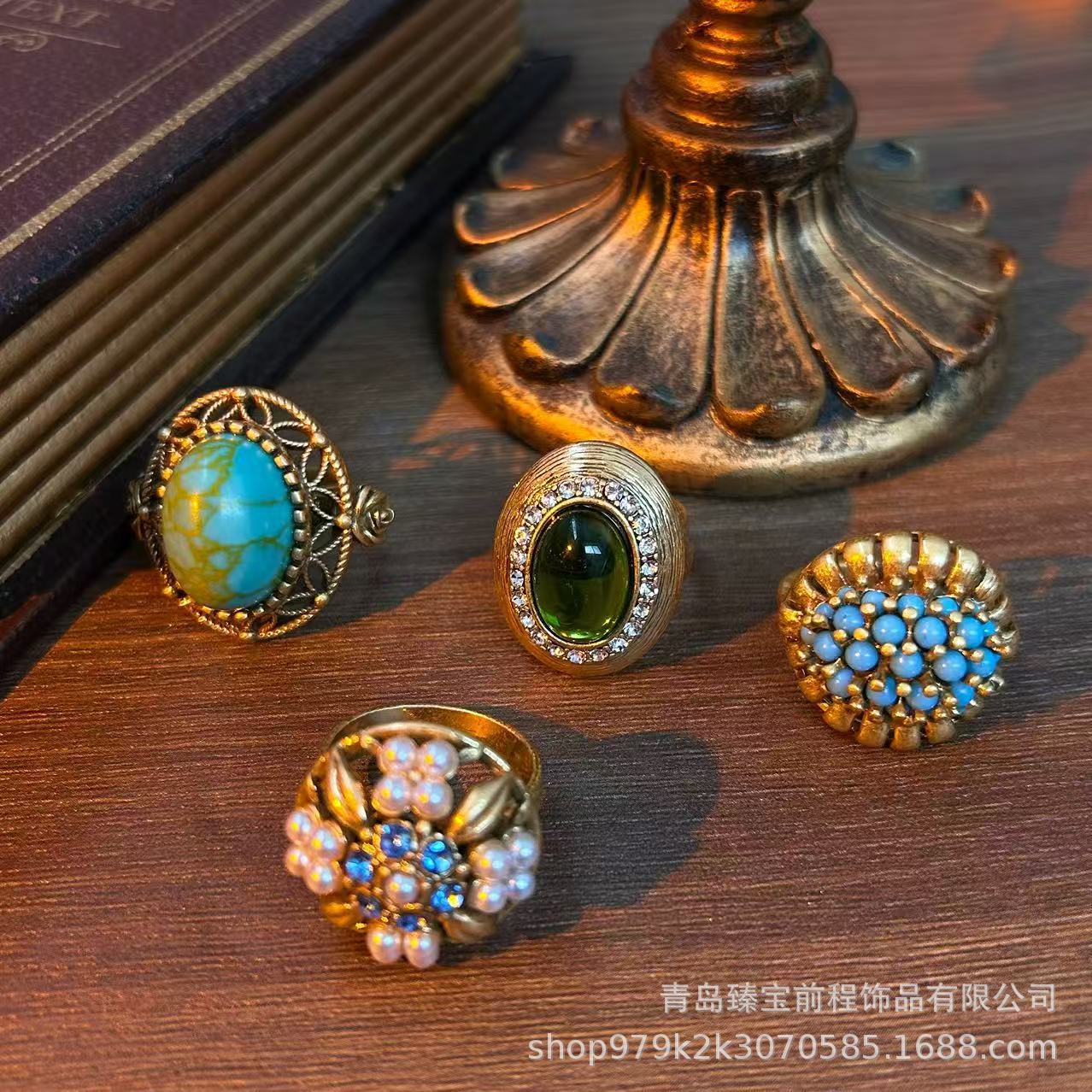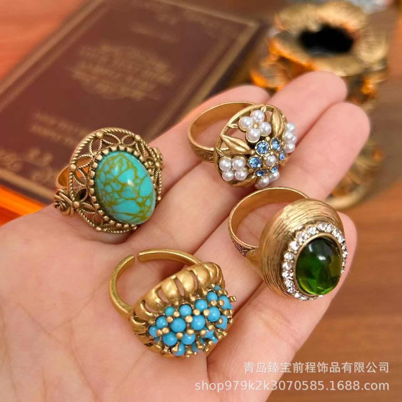 Antique Miscellaneous Old Copper Ring Middle vintage Turquoise Inlaid Hollow Pearl Carved Opening Ring