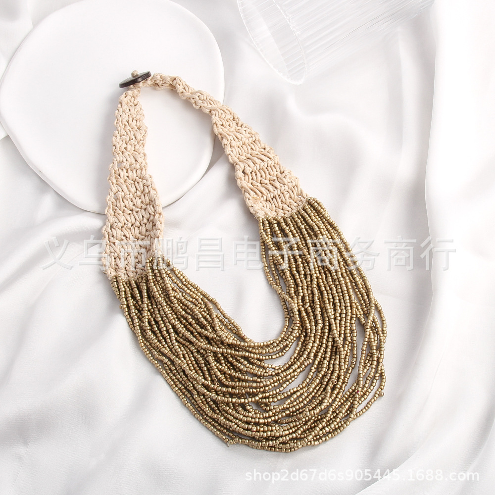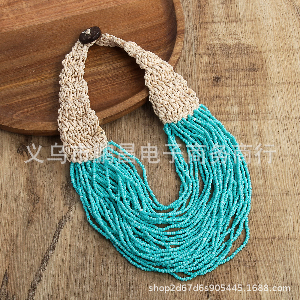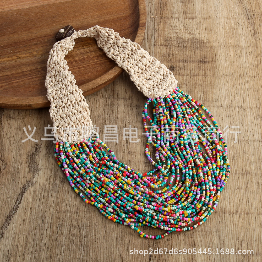 Fashion Bohemian Ethnic Style Exaggerated Women's Multi-layer Wax Rope Hand-woven Rice Bead Necklace Coconut Shell Buckle