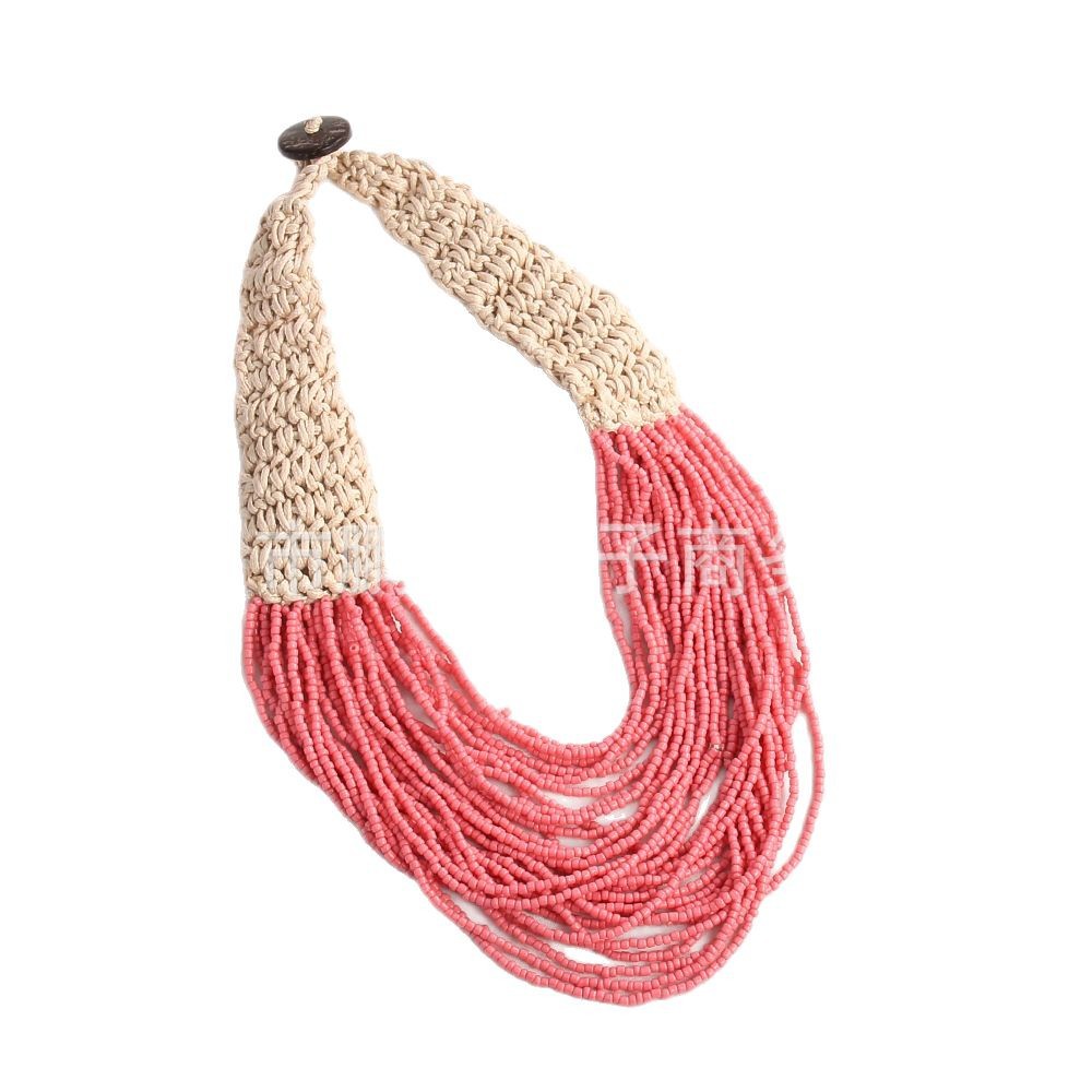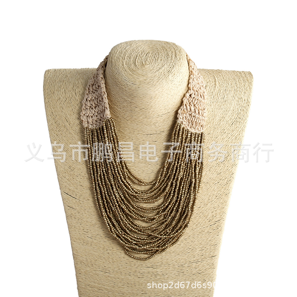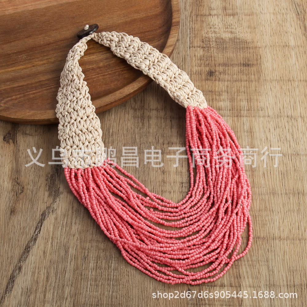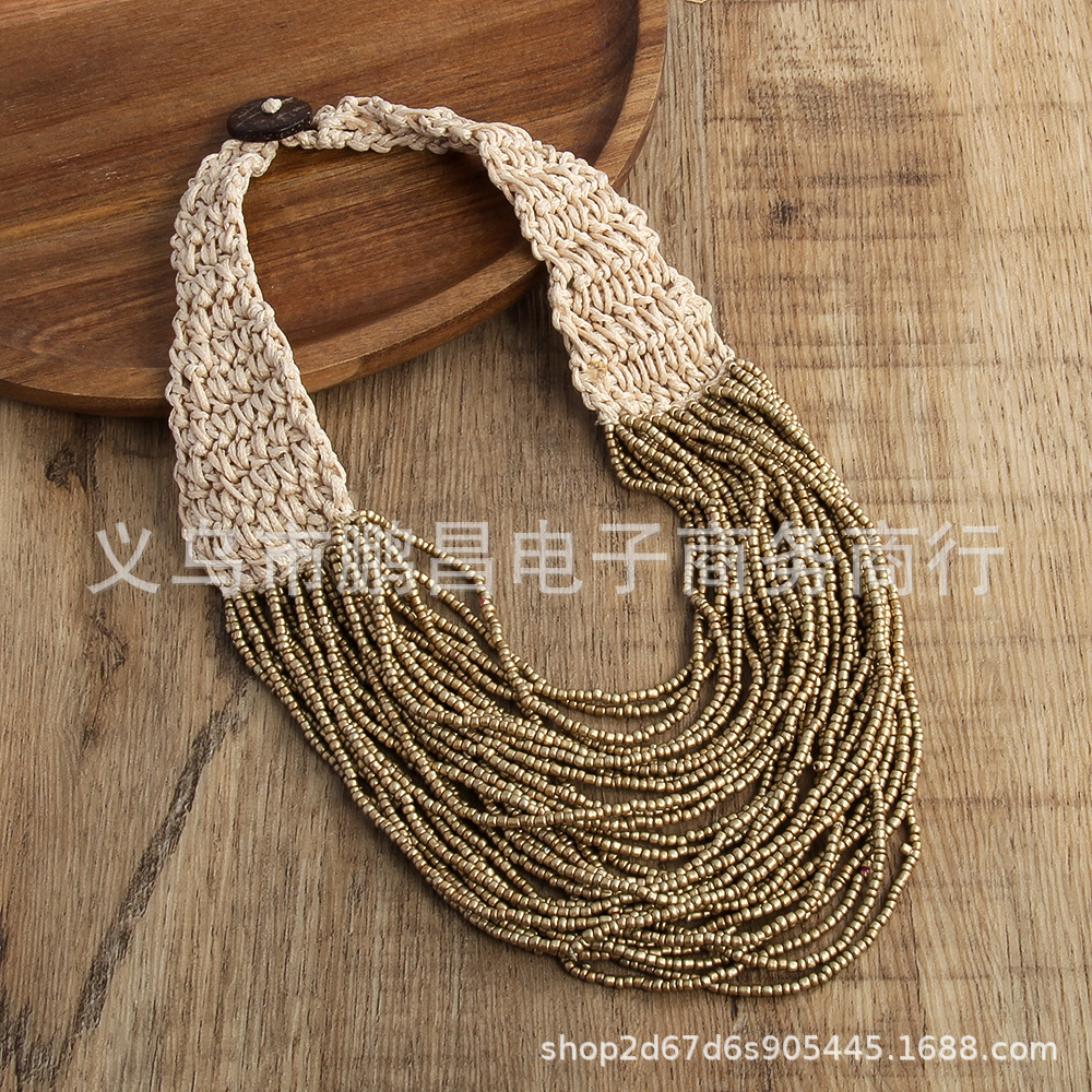 Fashion Bohemian Ethnic Style Exaggerated Women's Multi-layer Wax Rope Hand-woven Rice Bead Necklace Coconut Shell Buckle