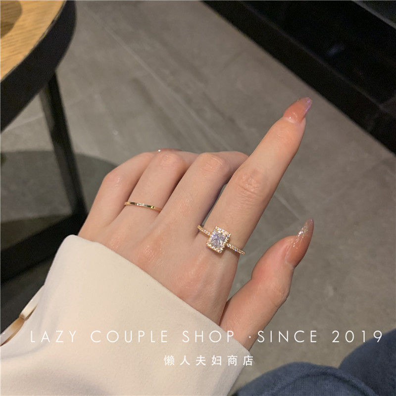 Heart Style ~ Light Luxury Zircon Super Flash Ring Ins Niche Design Square Diamond Cold Style Exquisite Ring Open Women's Fashion