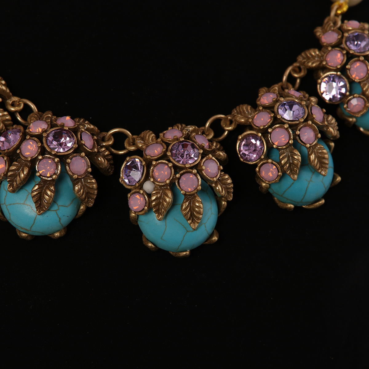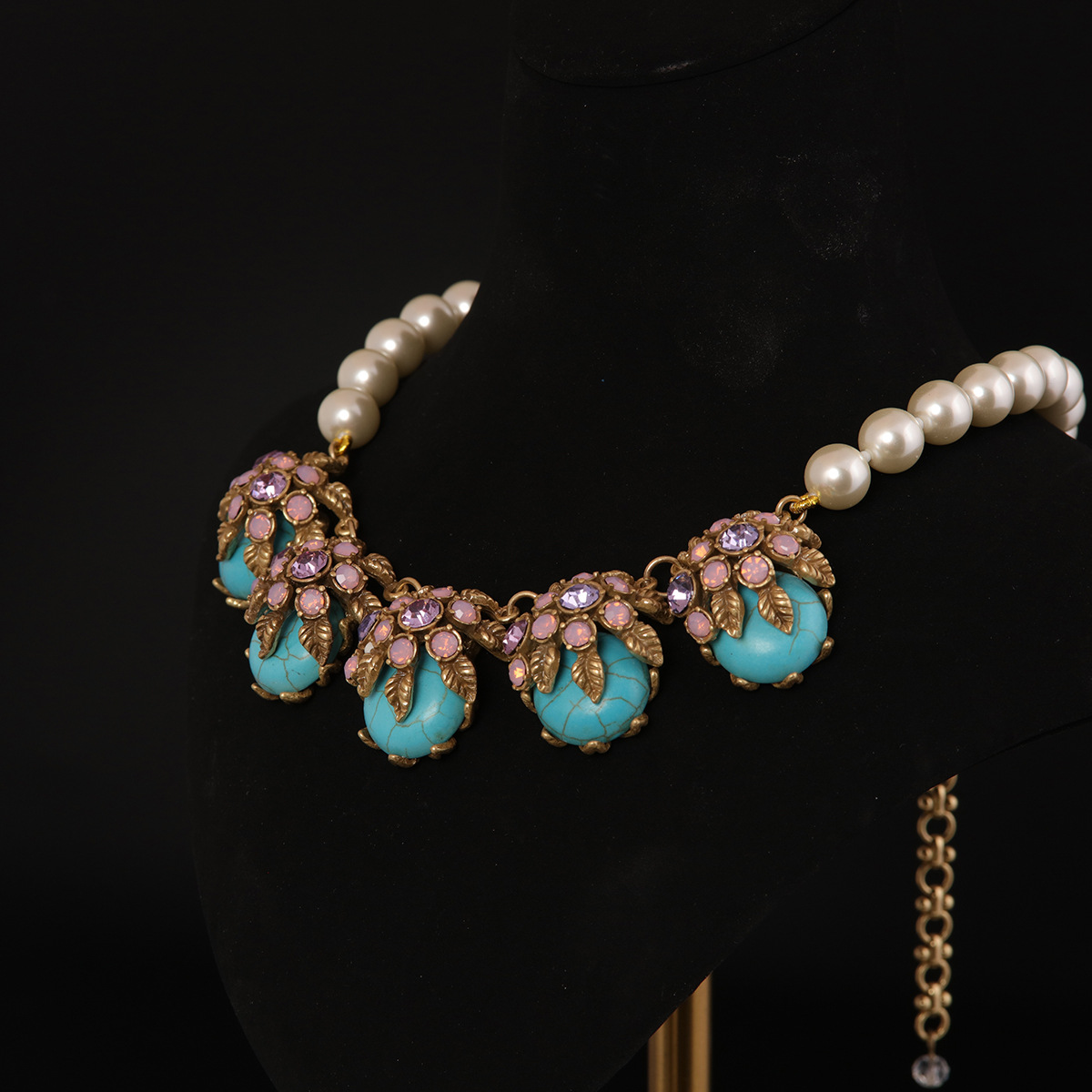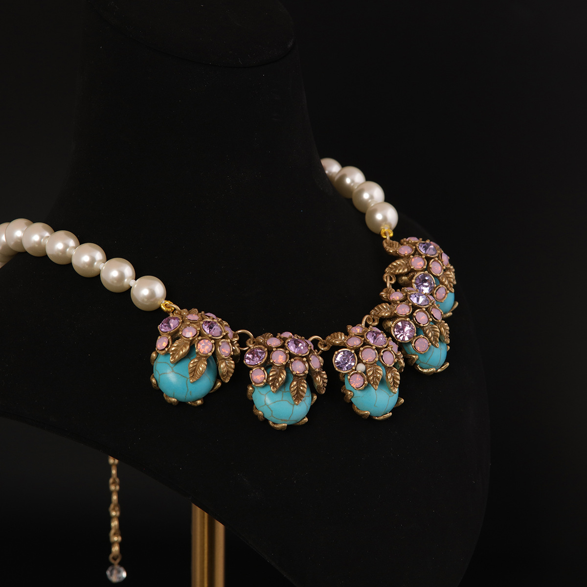 Middle Ancient vintage High-grade European and American Style Temperament Copper Plated Copper Alloy Blue Pine Flower Ball Necklace Earrings suit