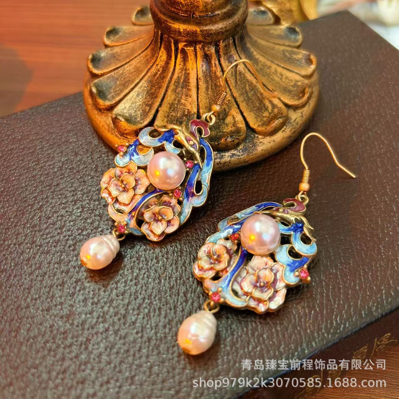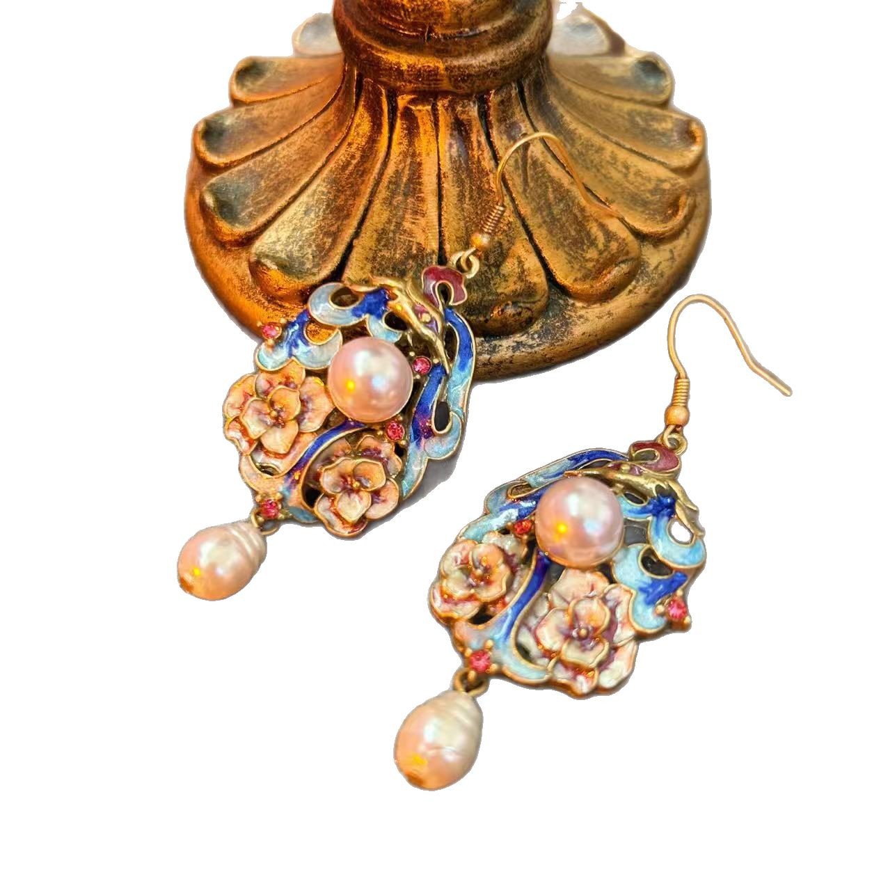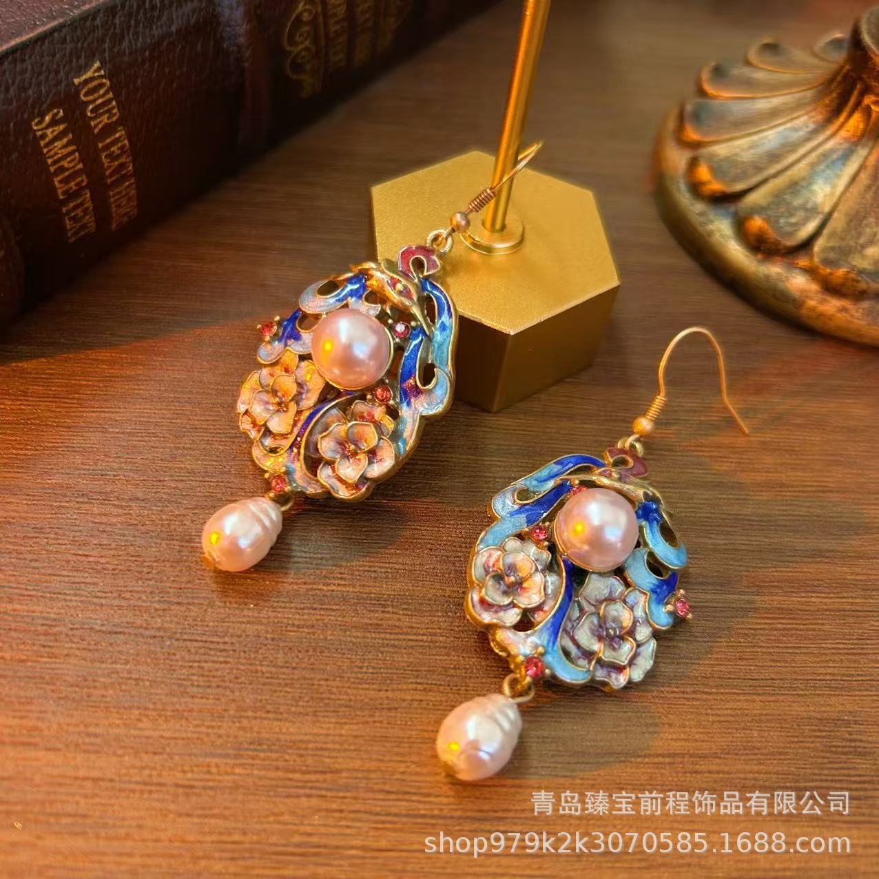 Cloisonne Flower Embellished Earrings, Retro Ethnic Style Earrings, Elegant Female Pearl Earrings, National Style, New Chinoiserie Classical