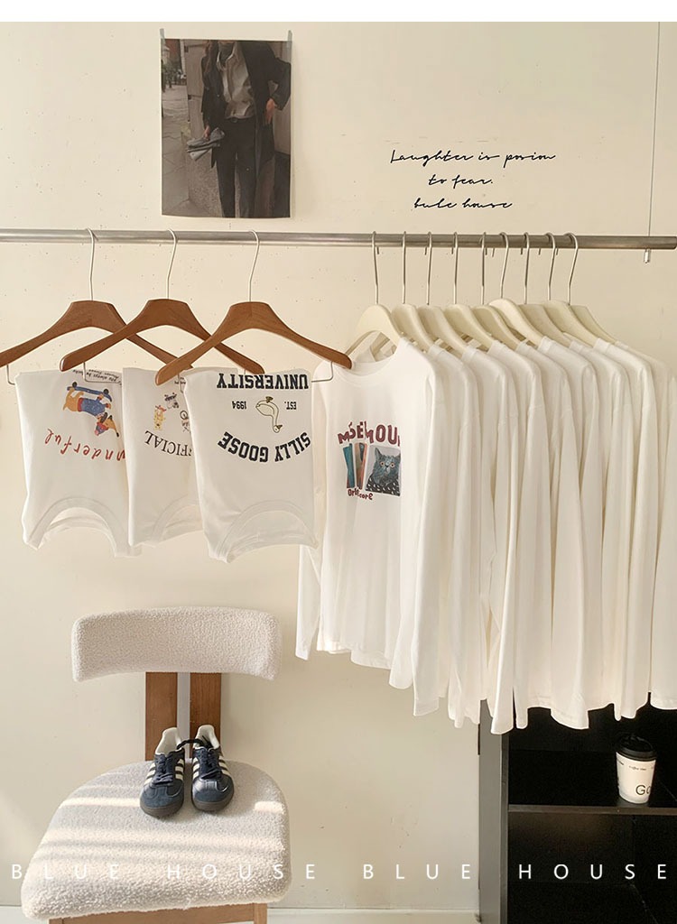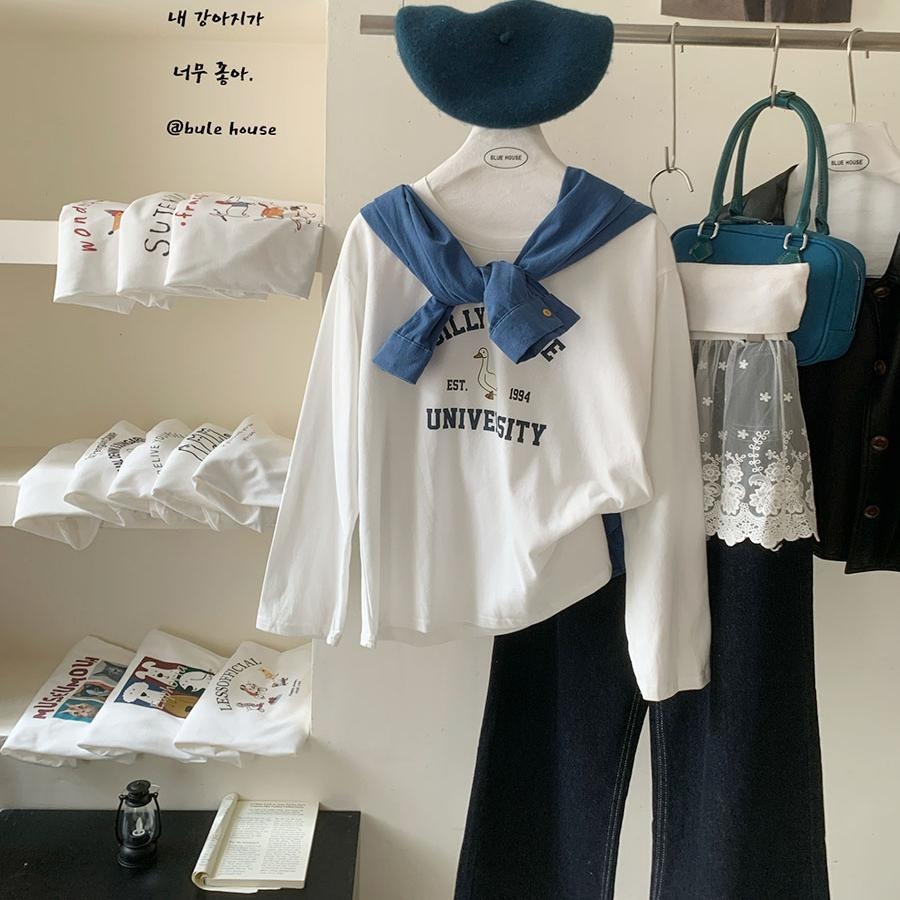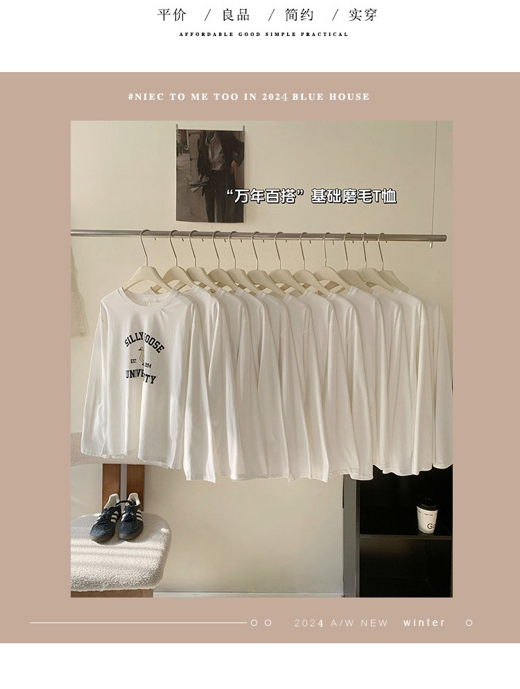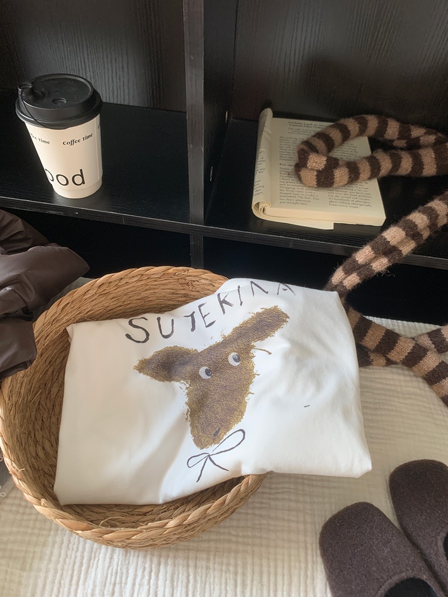 2025 New Long-sleeved T-shirt Women's Ins Sanding Cartoon Print Autumn and Winter Inner Cotton Base Shirt White Top Trendy