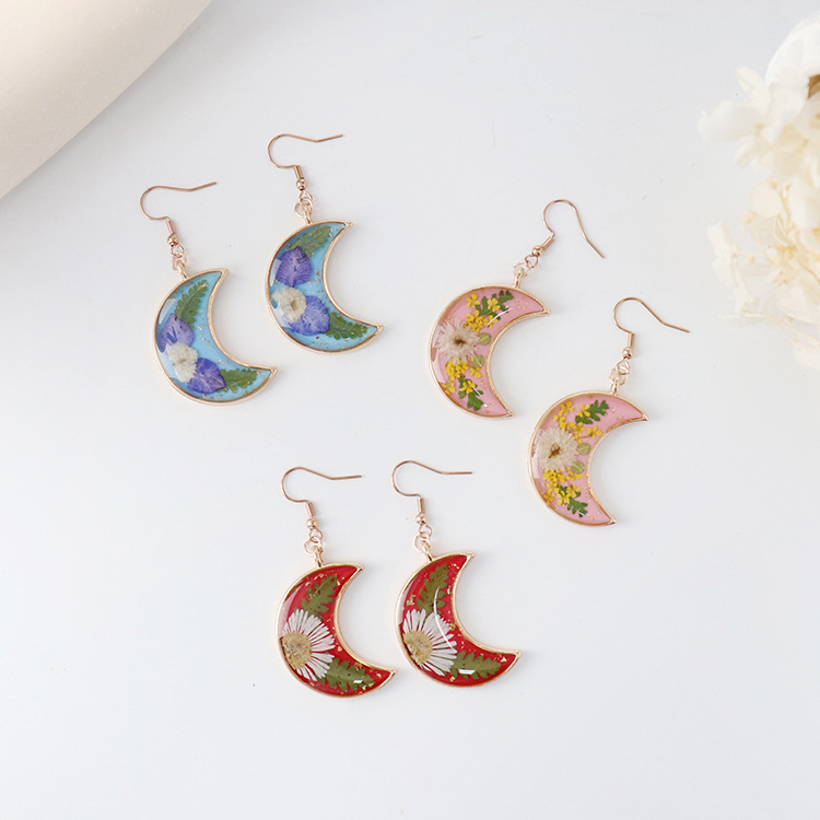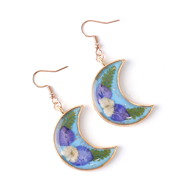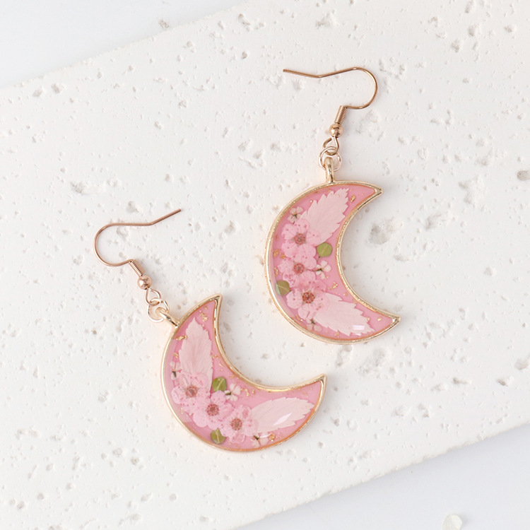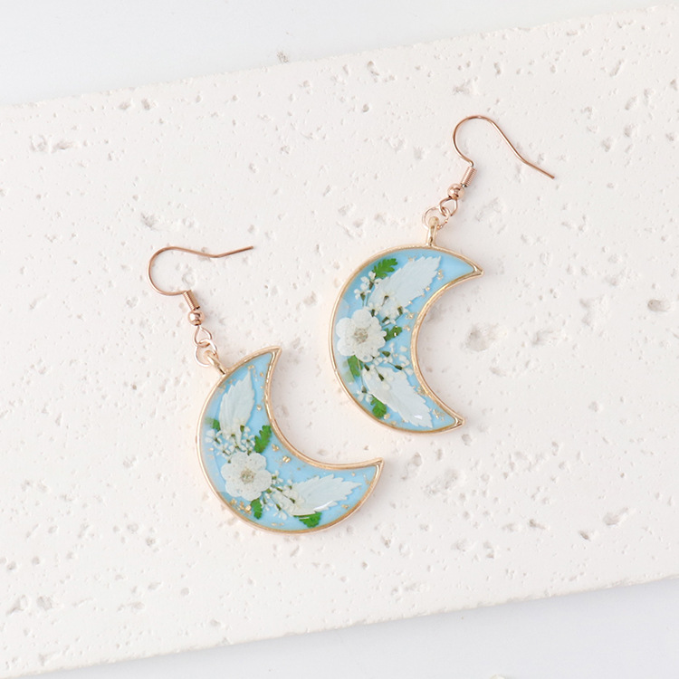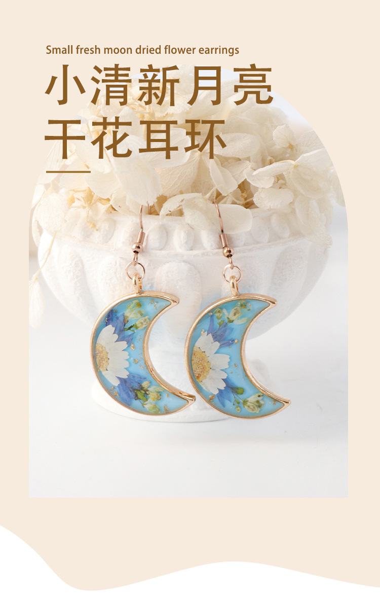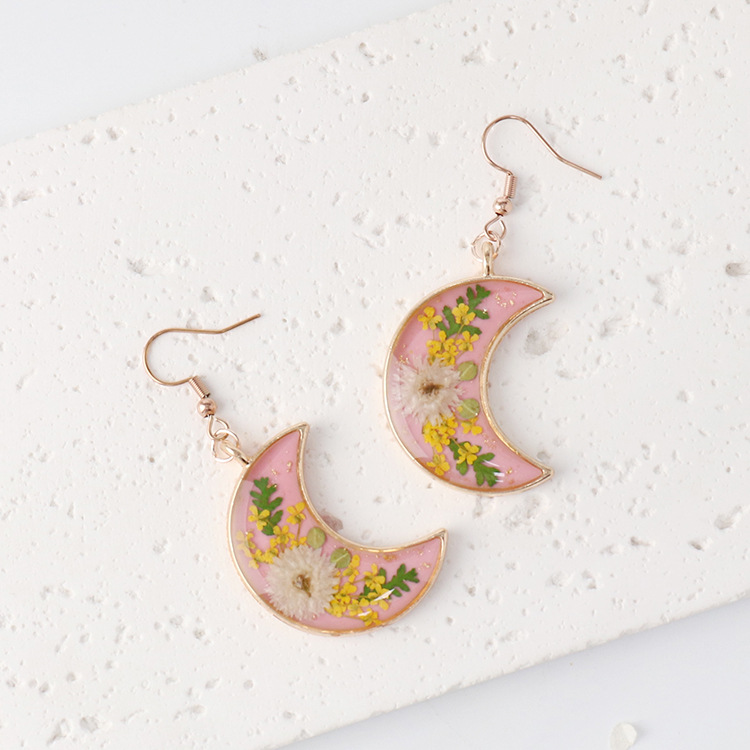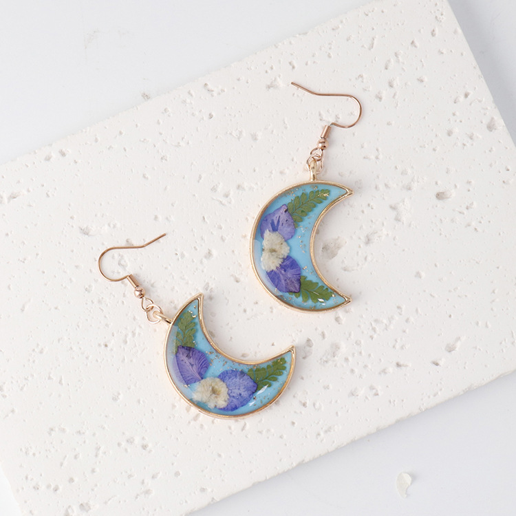 Cross-border Moon Natural Real Flower Handmade Earrings Dropping Glue Resin Creative Earrings Earrings Fresh and Beautiful Jewelry Gift