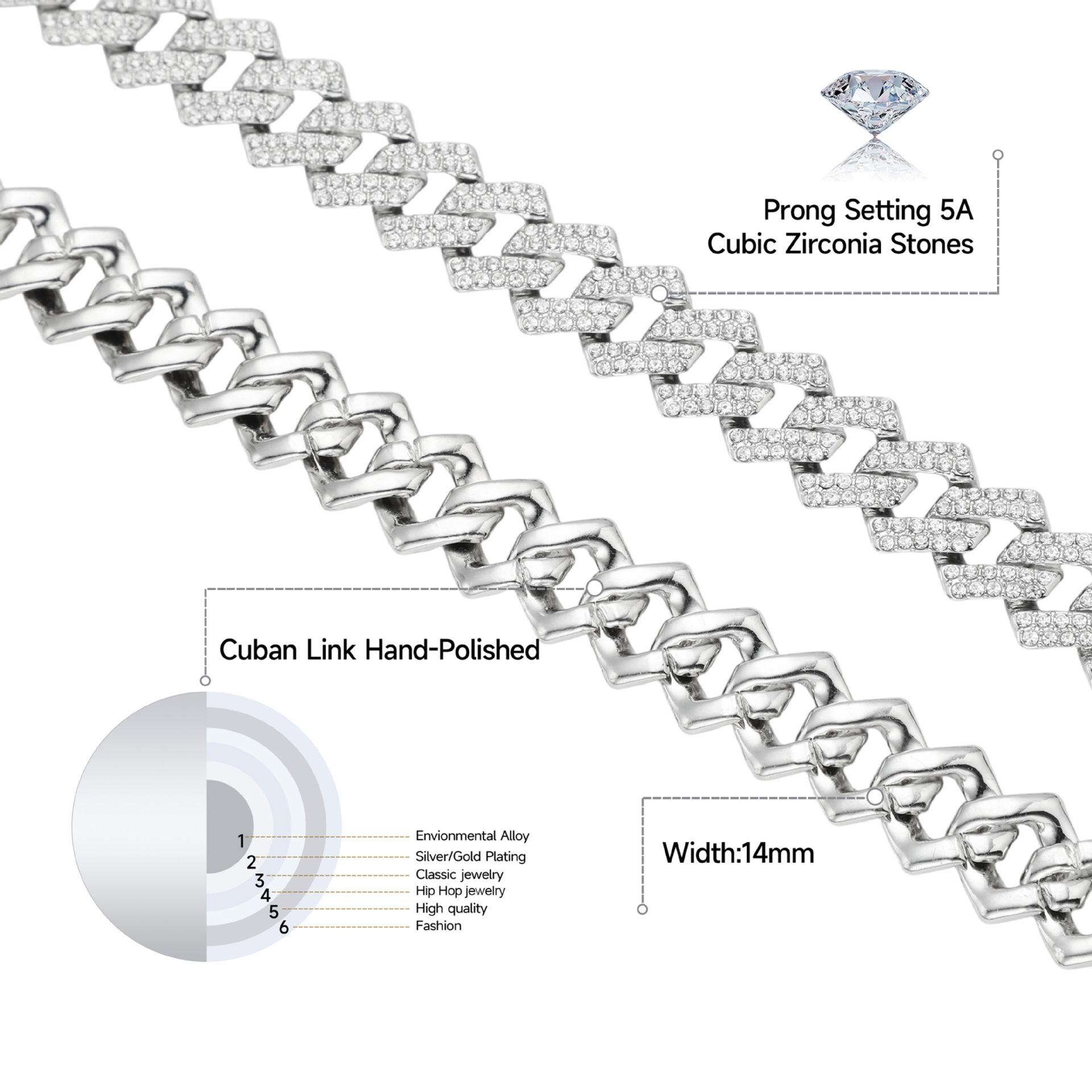 European and American 14mm Alloy Full Diamond Rhombus Cuban Chain Hip-Hop Men's Double-Row Quadrilateral Hip-Hop Necklace Jewelry