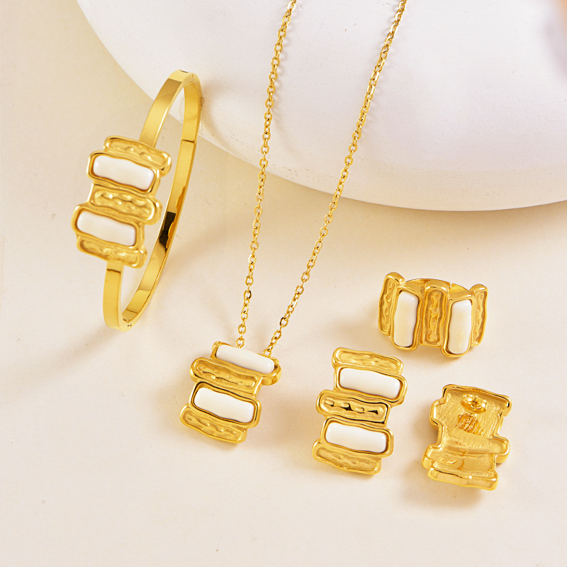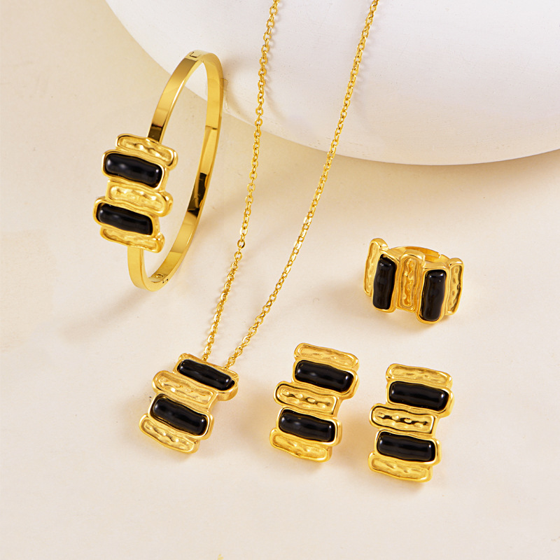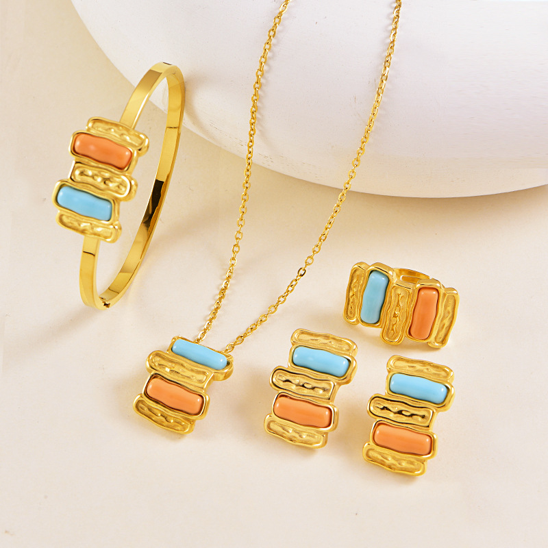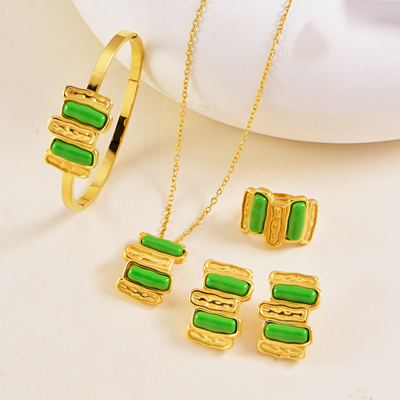 High-grade rectangular color stone four-piece simple retro stud earrings stainless steel bracelet clavicle necklace suit
