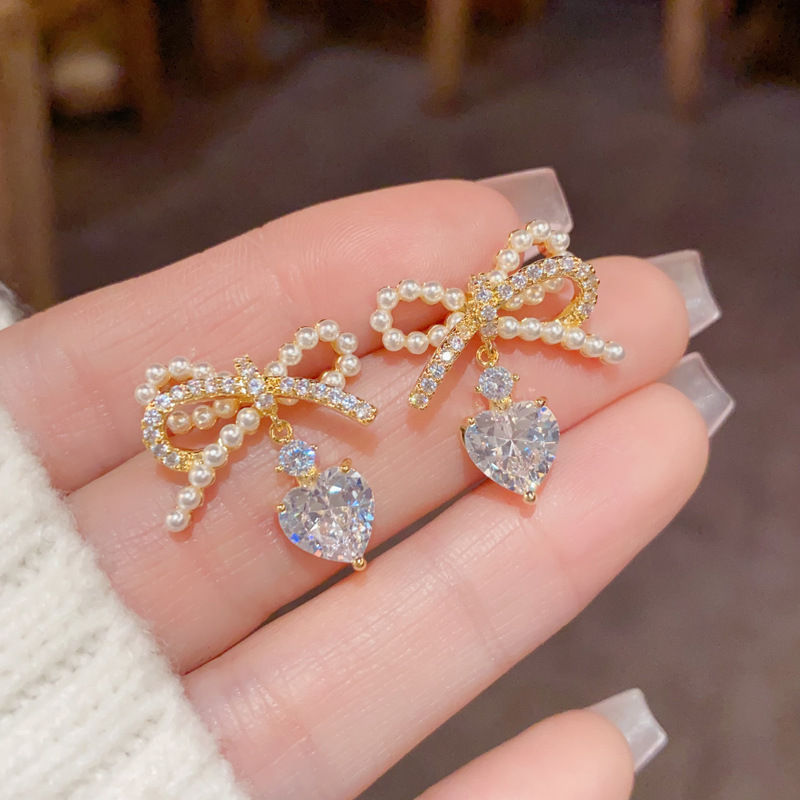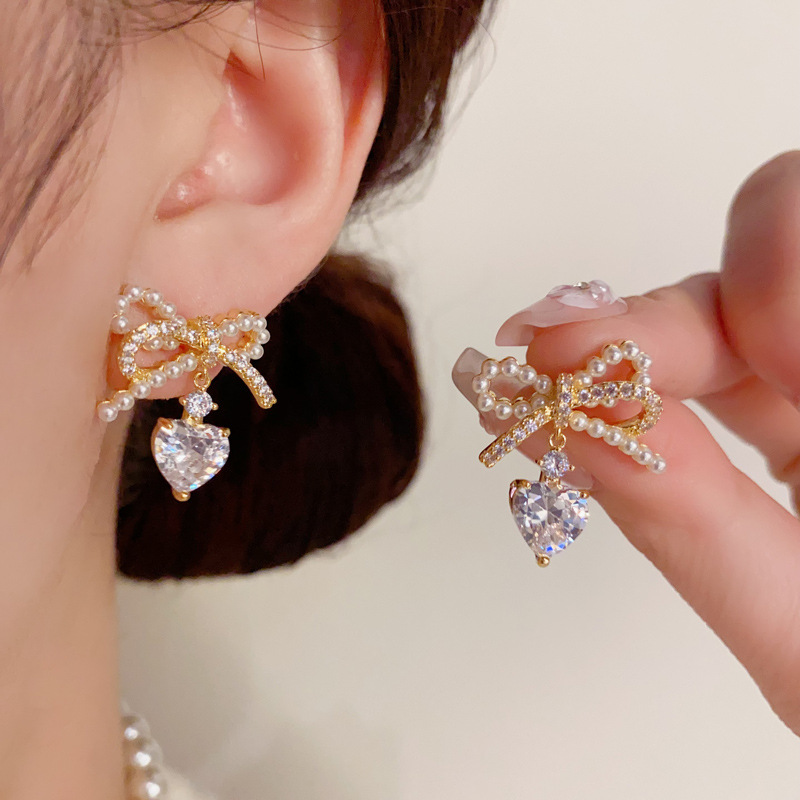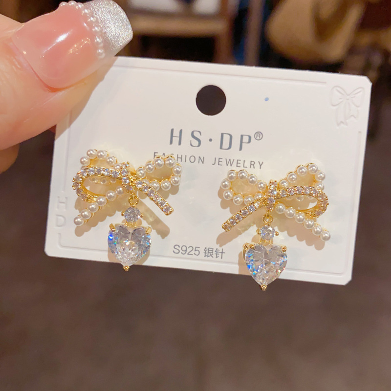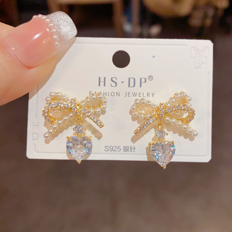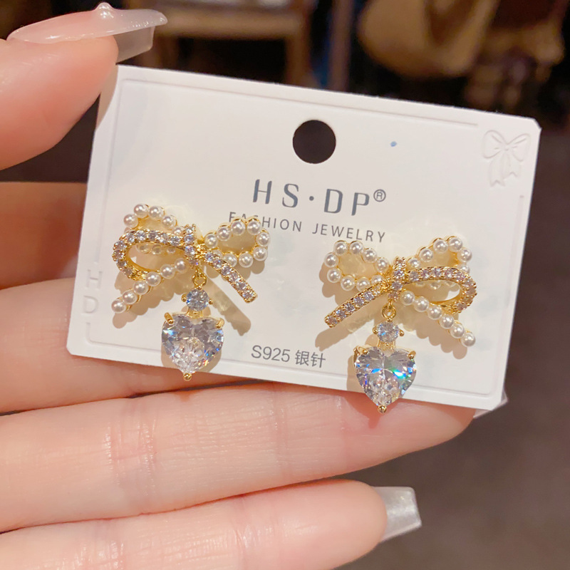 Korean Style Elegant Fashion Sweet Pearl Bow Zircon Water Drop Earrings s925 Silver Needle Light Luxury All-match Earrings for Women