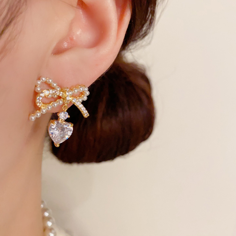 Color: Pearl bow zircon water drop earrings (thick gold plating)