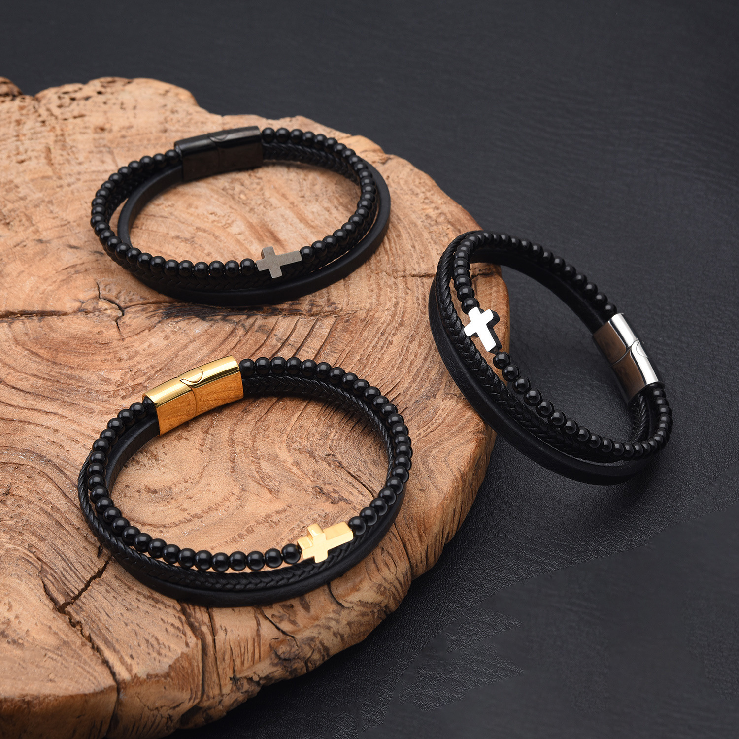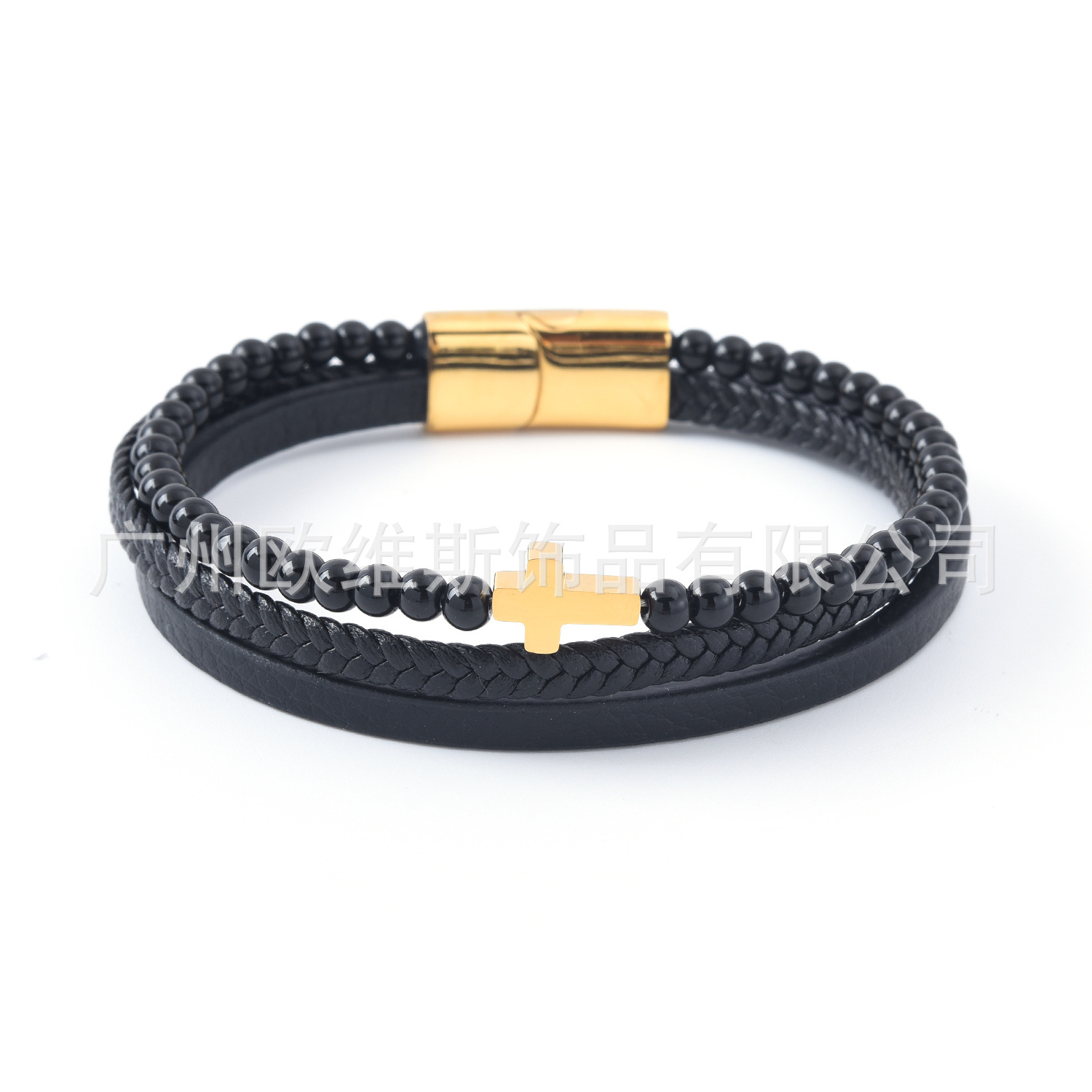 Cross-border European and American New Stainless Steel Cross Multi-layer Bracelet Simple Fashion Jewelry Men's Leather Woven Bracelet