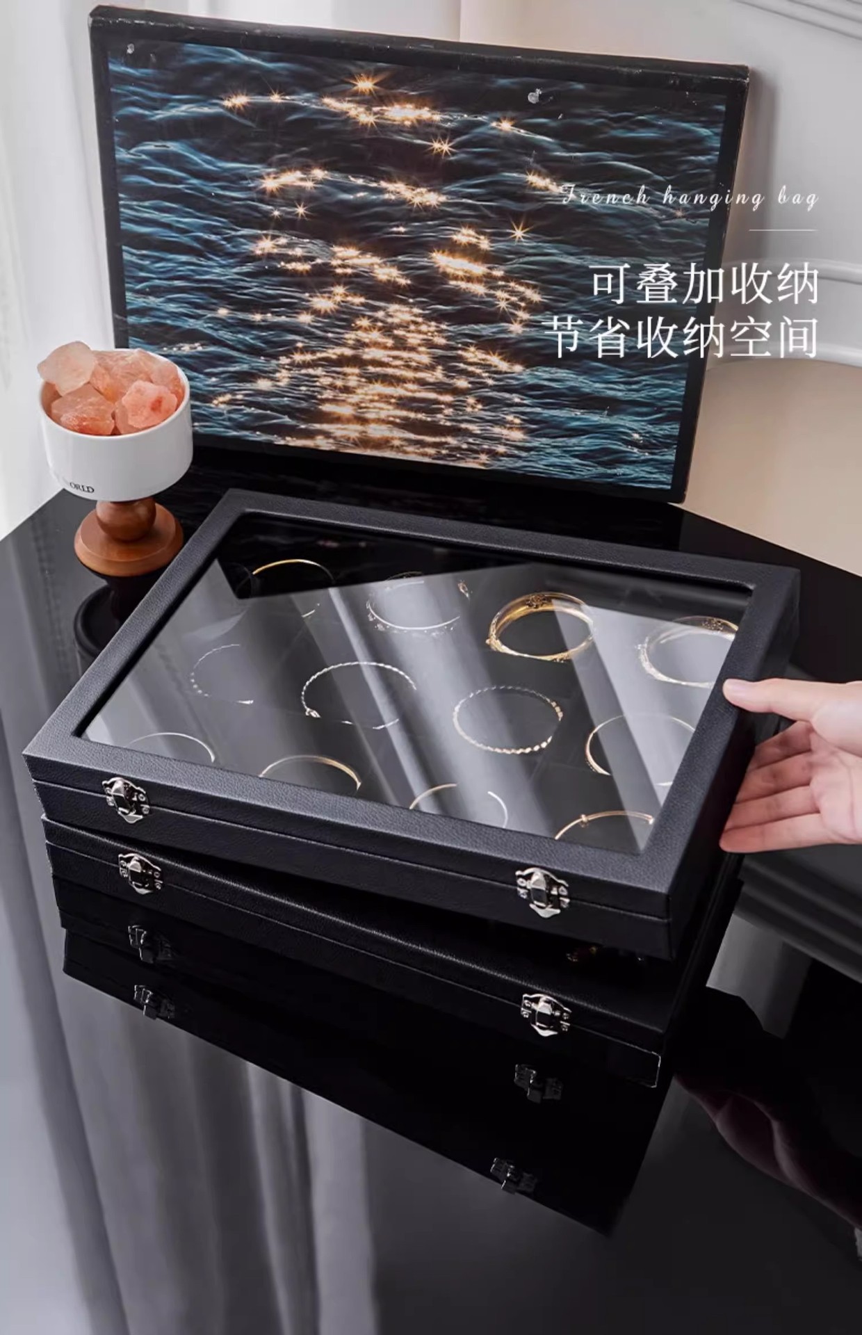 Color: Large black leather hundred-digit ring jewelry box