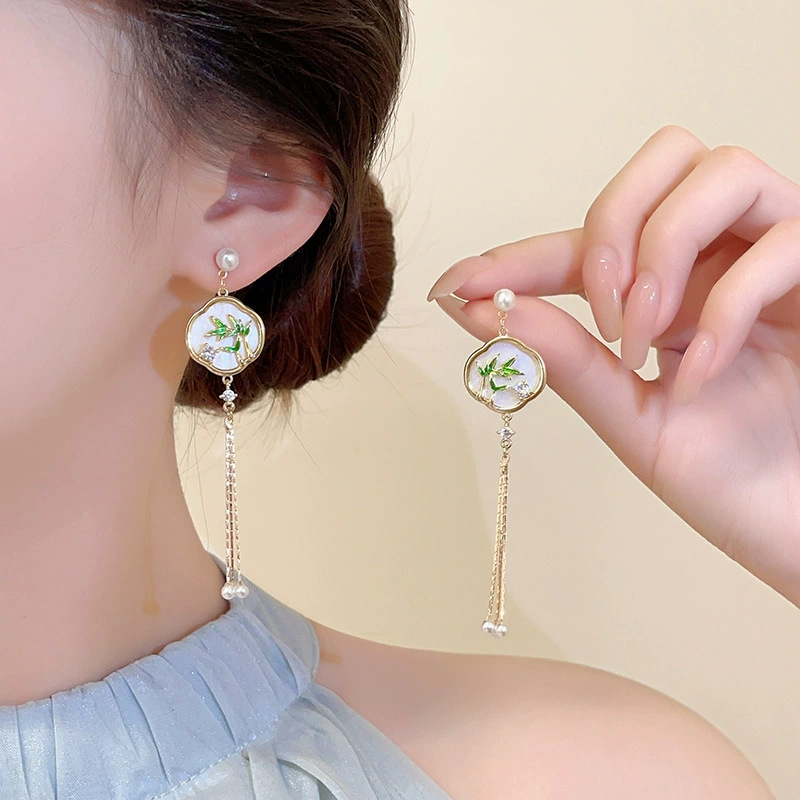 New Chinese Style Fan-shaped Green Bamboo Leaf Earrings Women's Vintage National Style Long Tassel Pearl Earrings Cheongsam Earrings Earrings