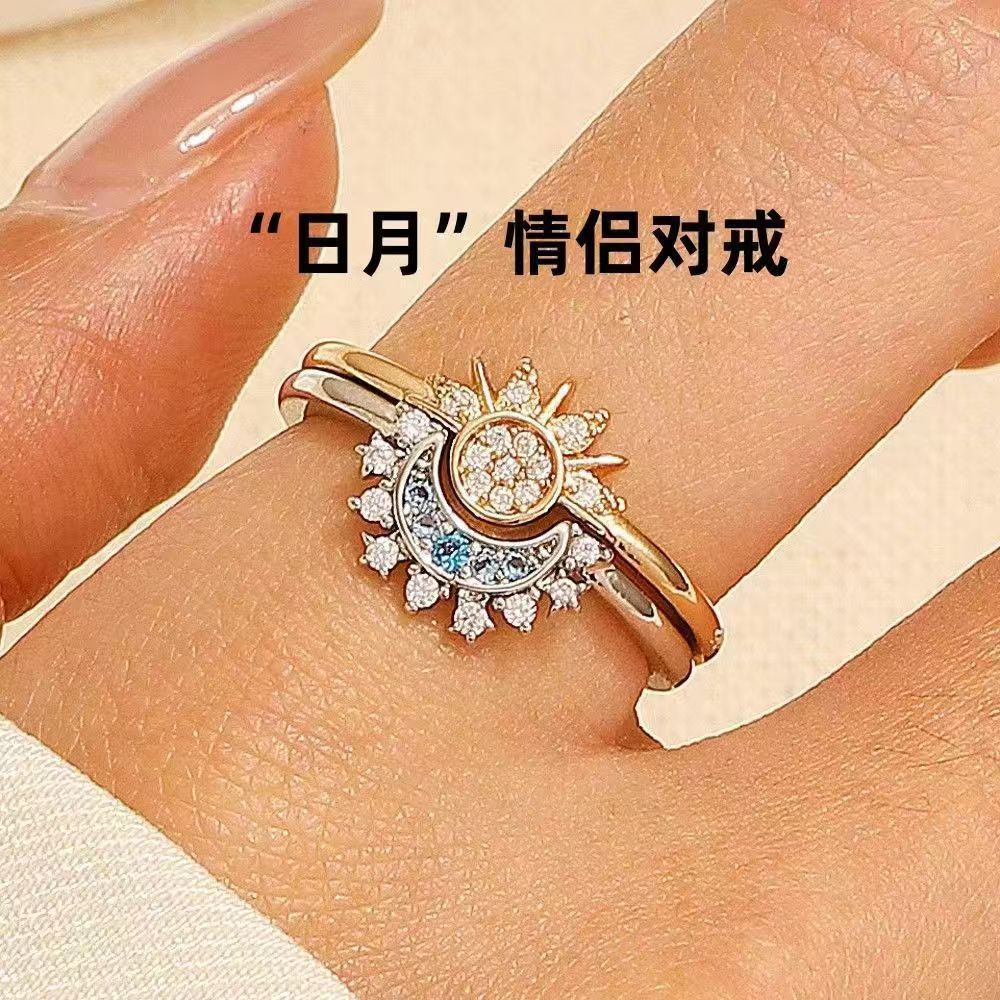 European and American New Jewelry Niche Inlaid with Zircon Sun and Moon Stacked Open Ring Ring for Girls in Cross-Border Couple