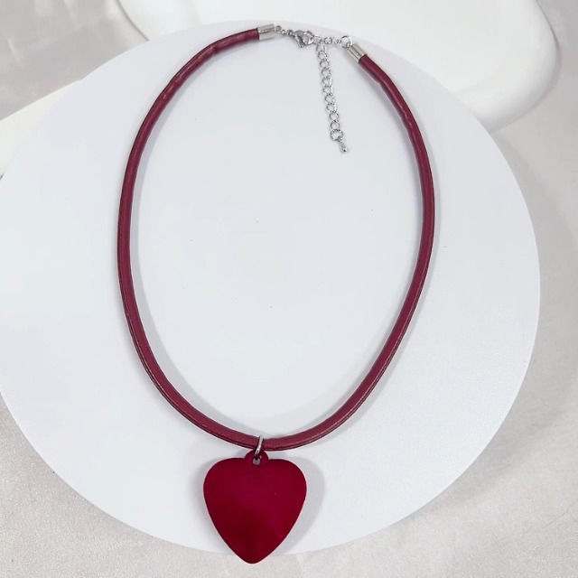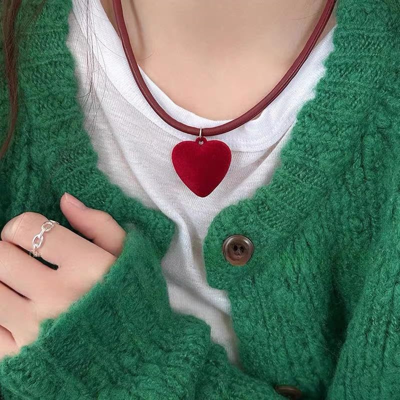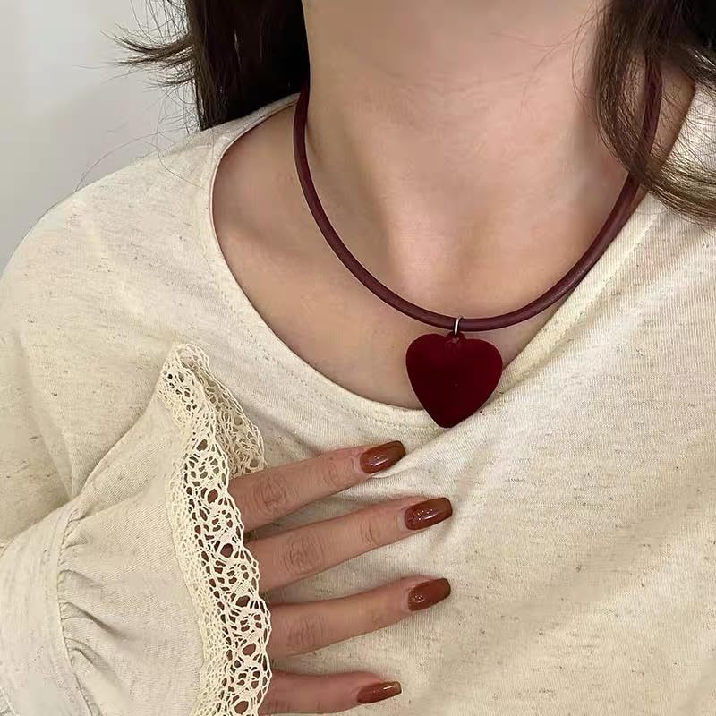 Fluffy Red Velvet Heart Pendant Necklace Large Retro Love Charm Clavicle Chain Thick Personality Anniversary