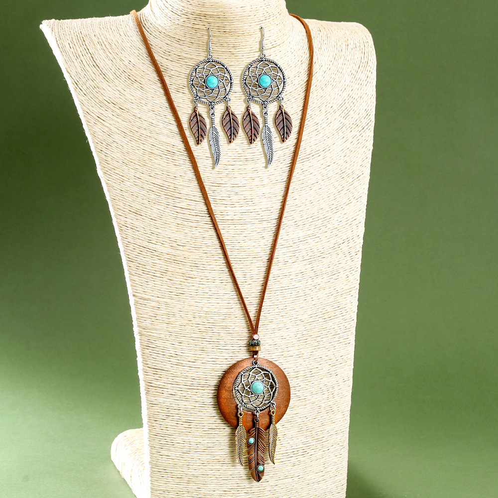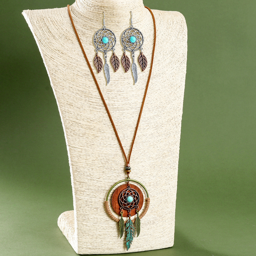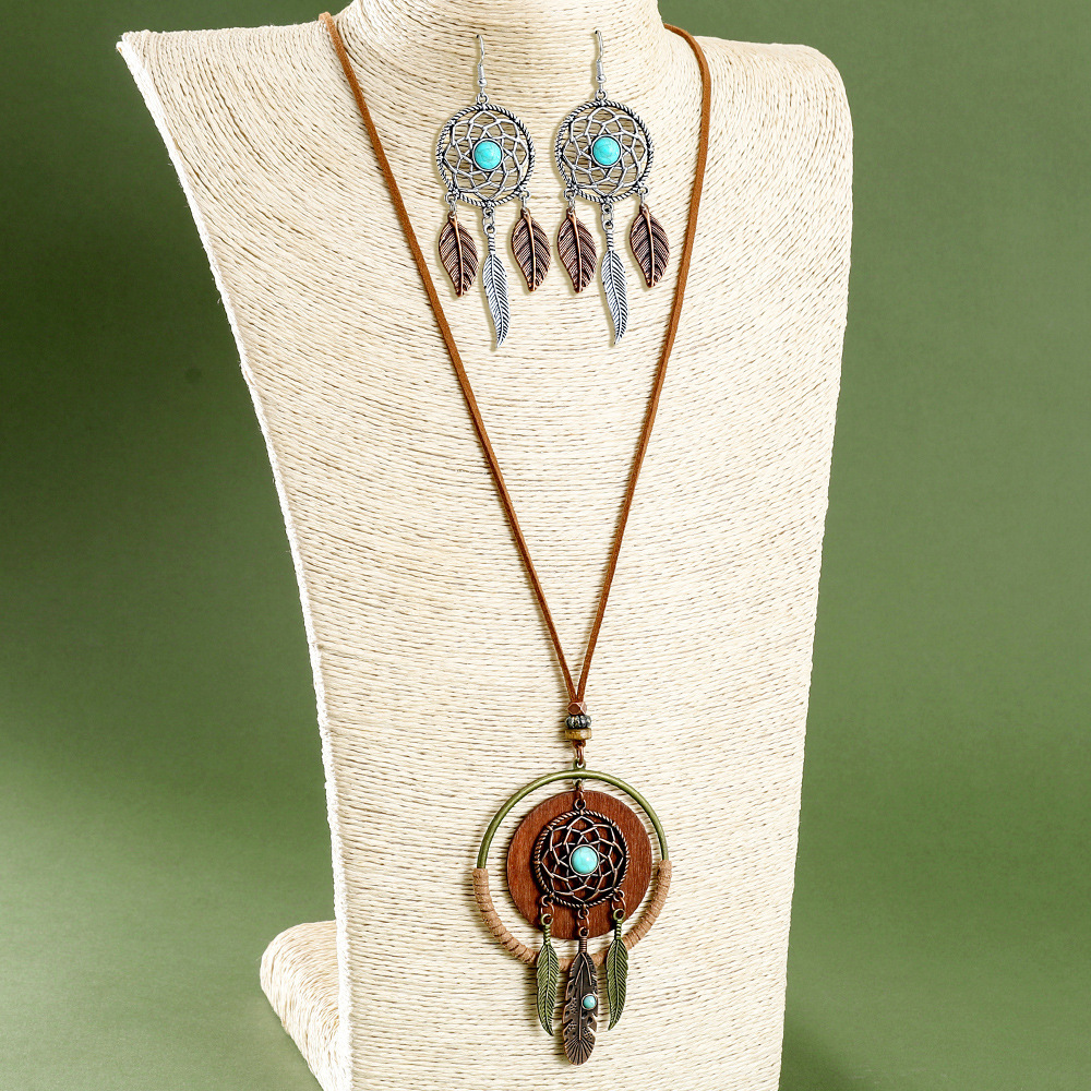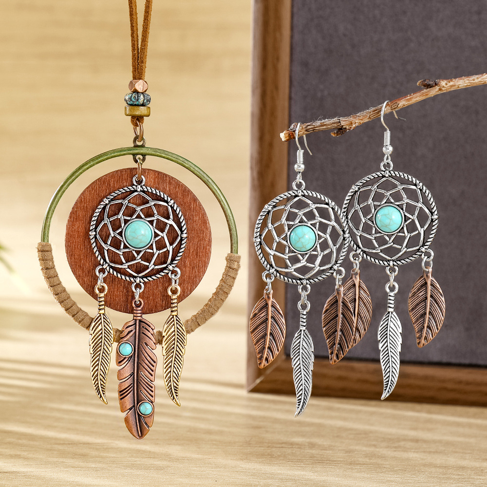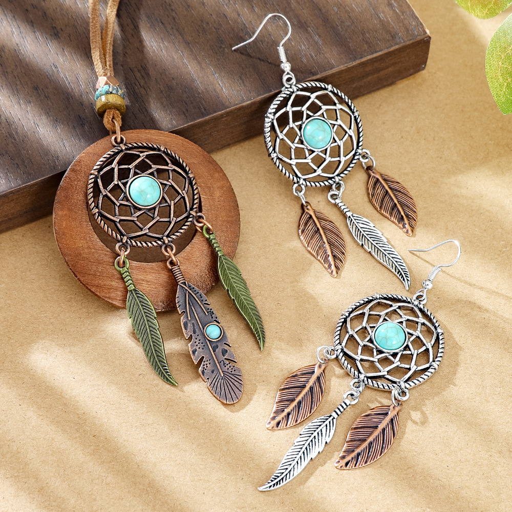 Cross-border hot spider web dream net feather tassel jewelry suit personality national style metal earrings necklace wholesale