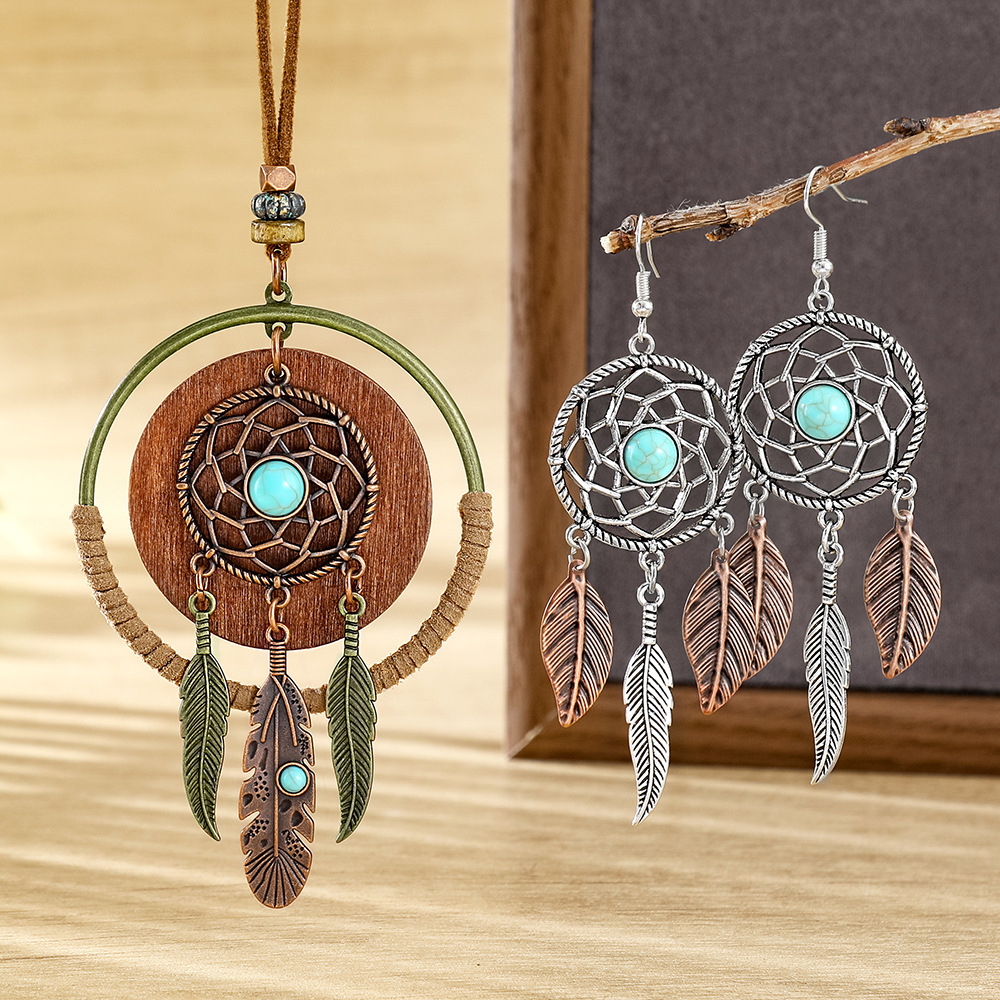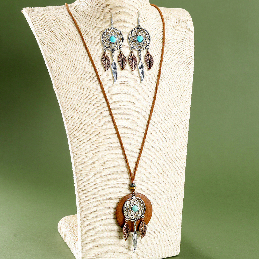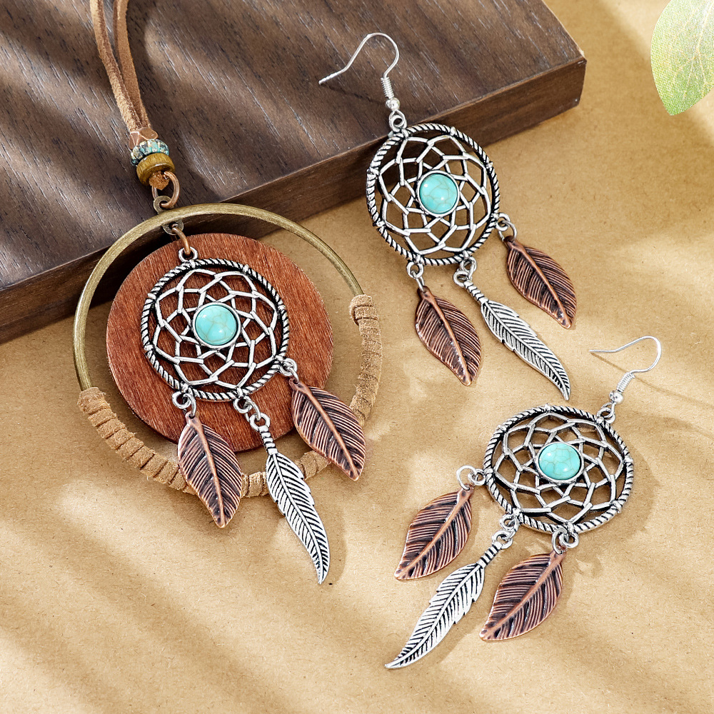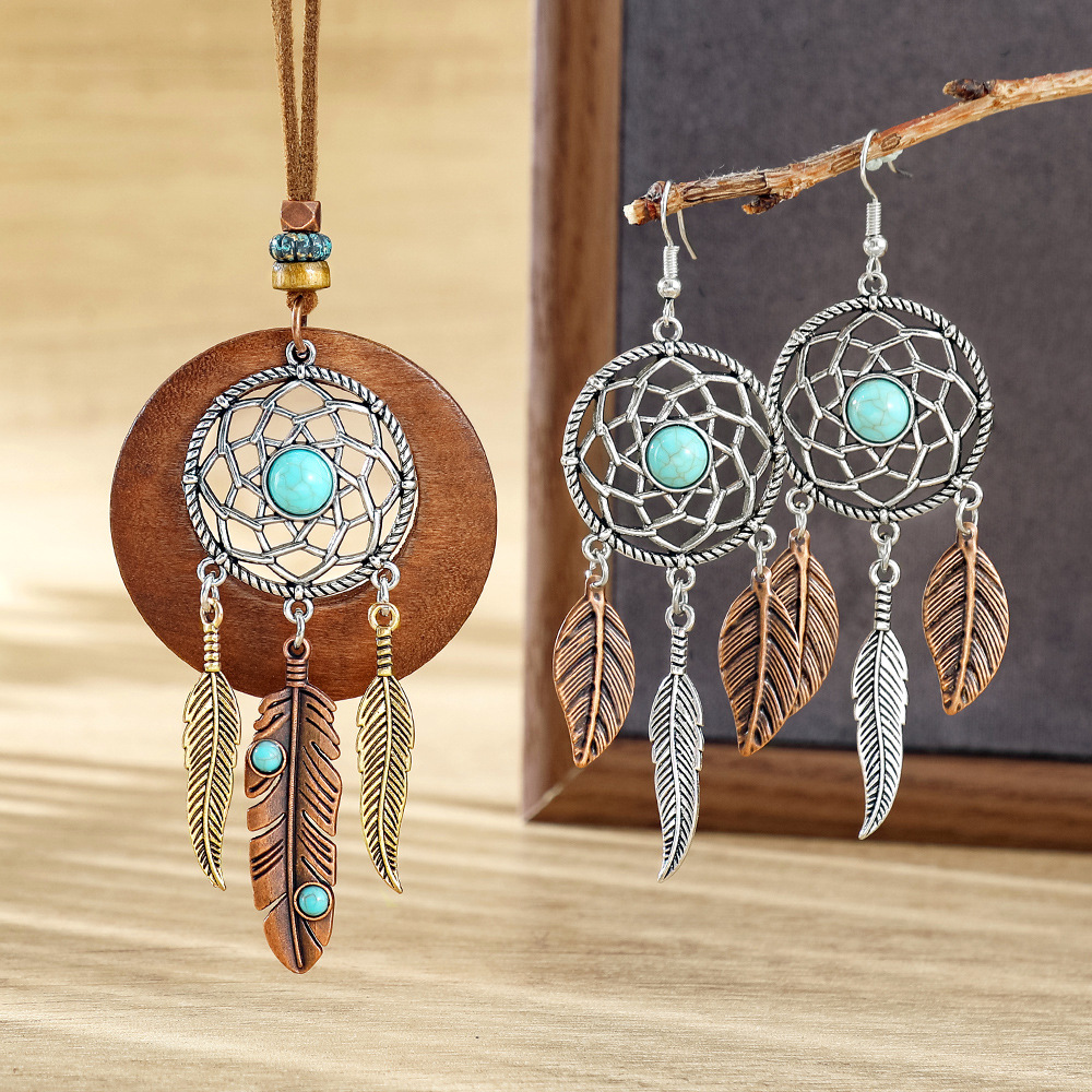 Cross-border hot spider web dream net feather tassel jewelry suit personality national style metal earrings necklace wholesale