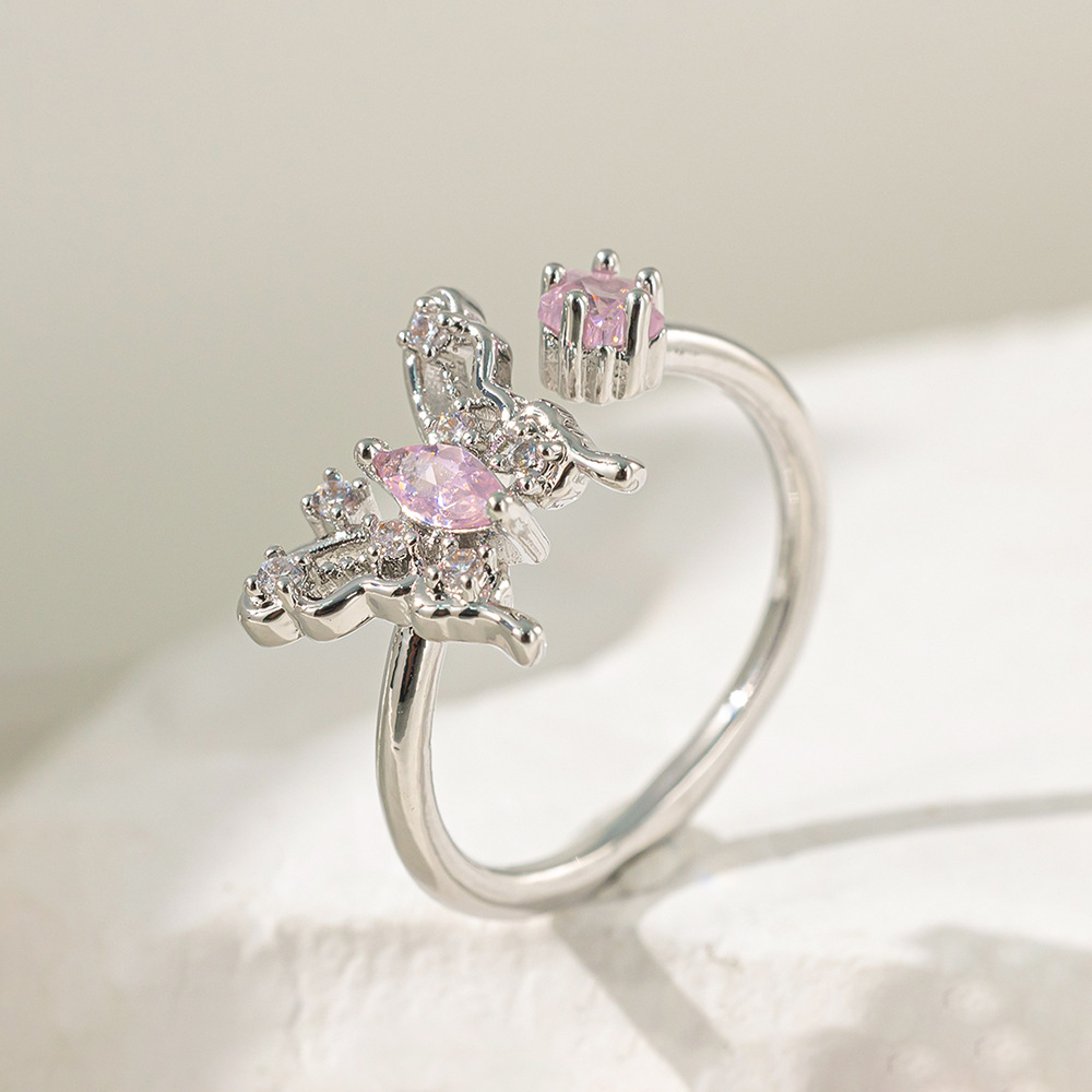 Color: 【f1202】pink diamond butterfly ring【silver】