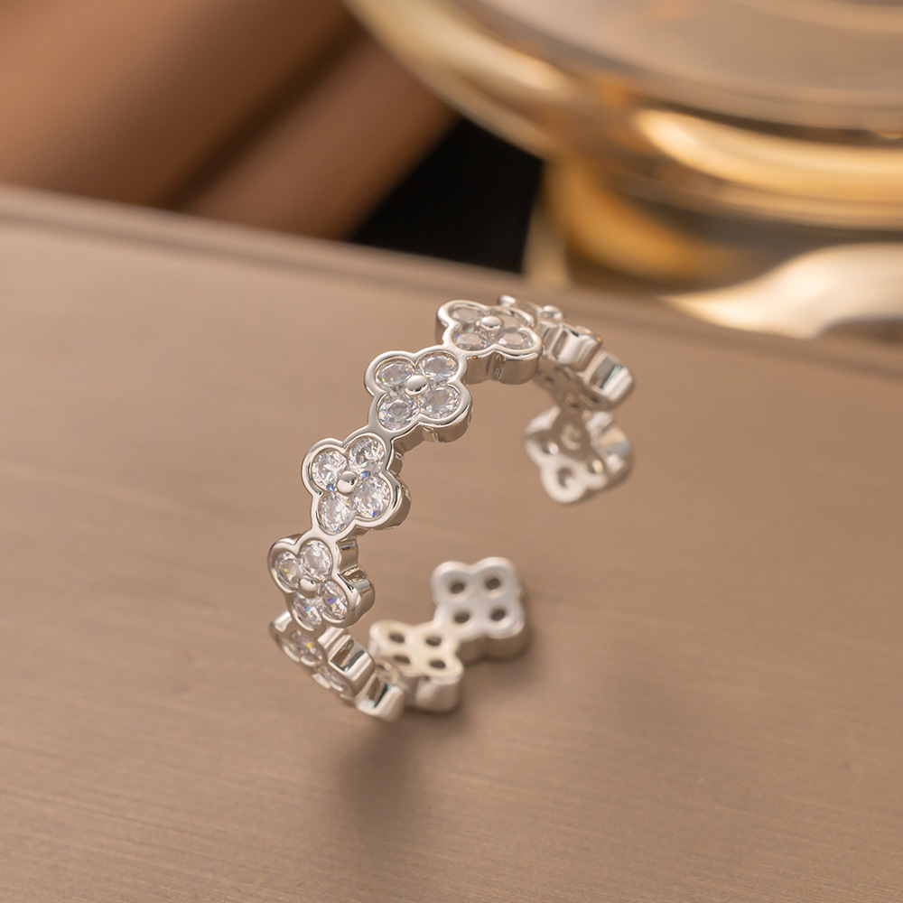 Color: 【f1238】full diamond four-leaf flower ring【silver】