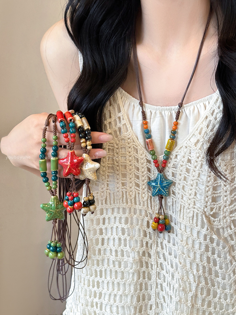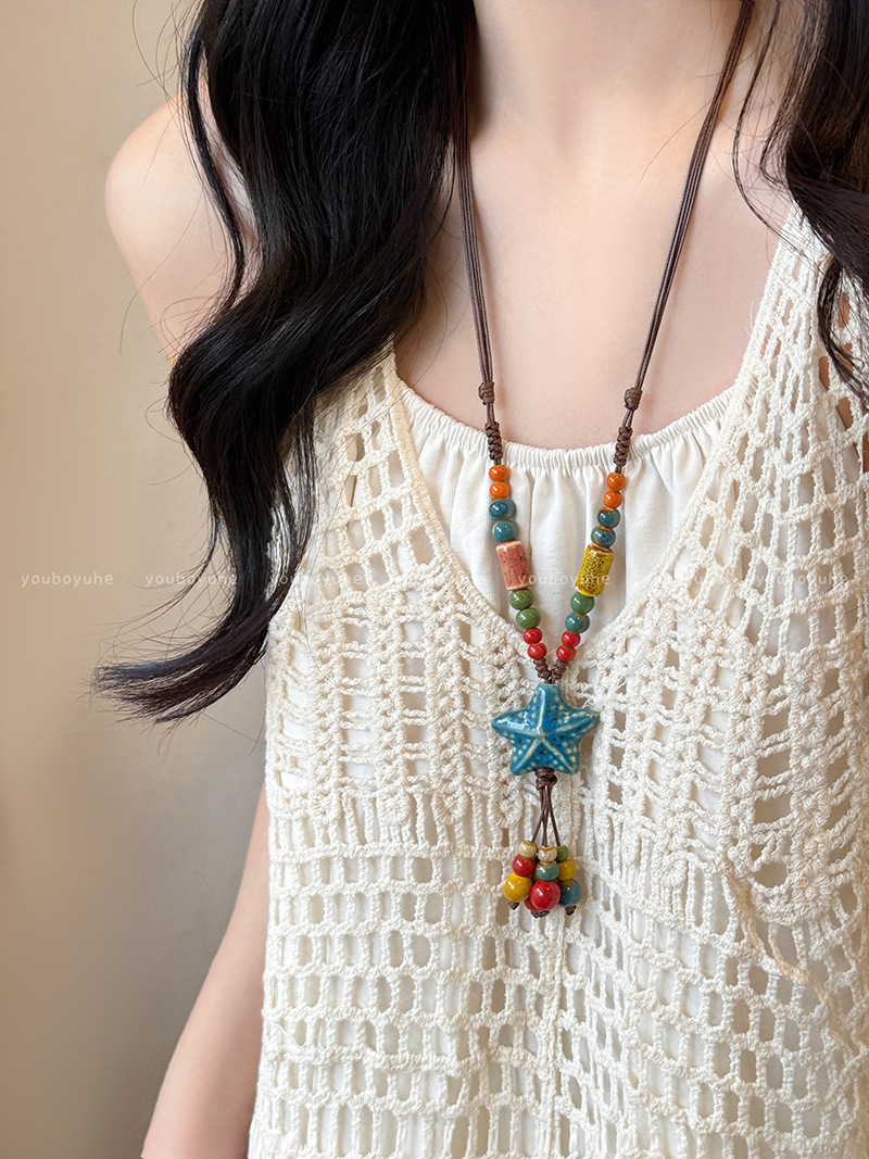 Bohemian Ceramic Color Beaded Starfish Necklace Women's Retro Ethnic Style Woven Rope Long Sweat Chain Accessories