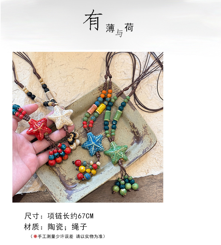 波西米亚陶瓷彩色串珠海星项链女复古民族风编织绳长款卫衣链配饰
